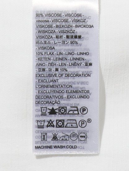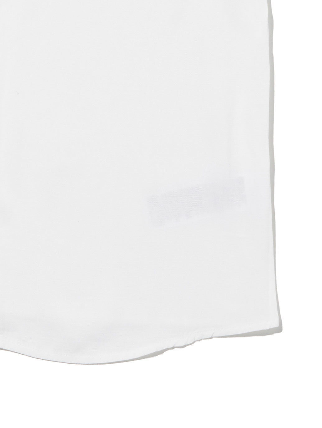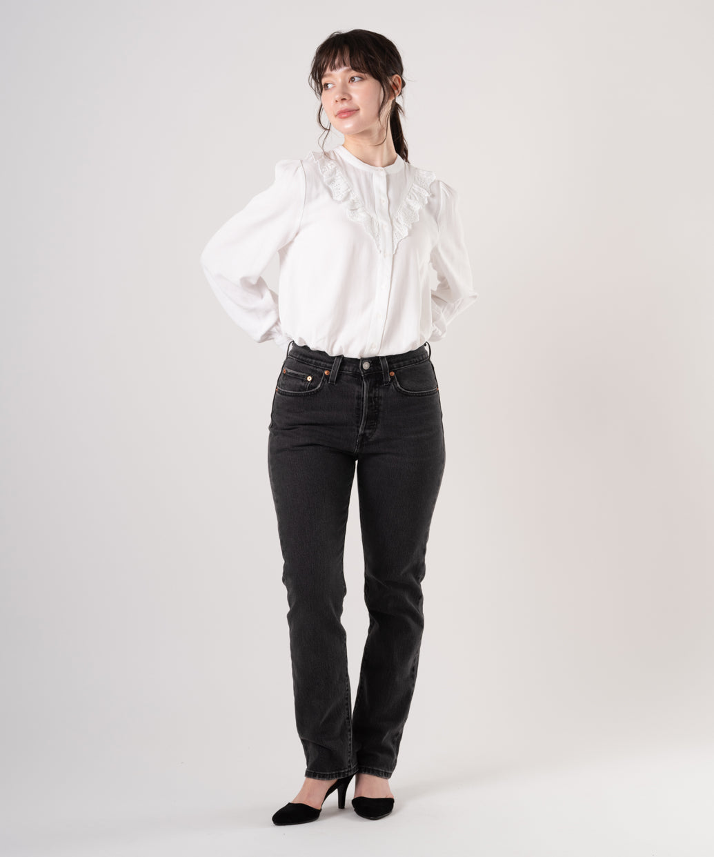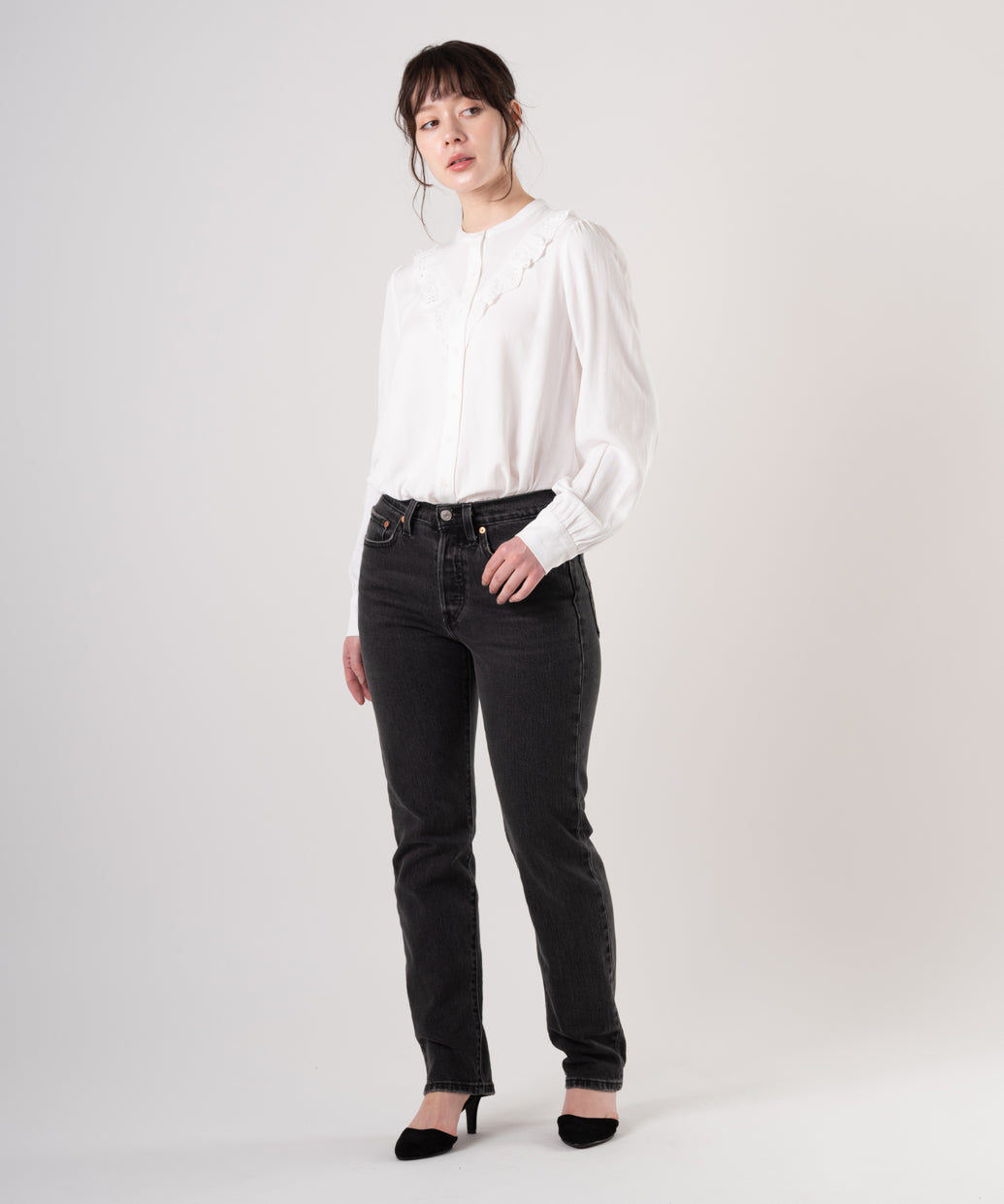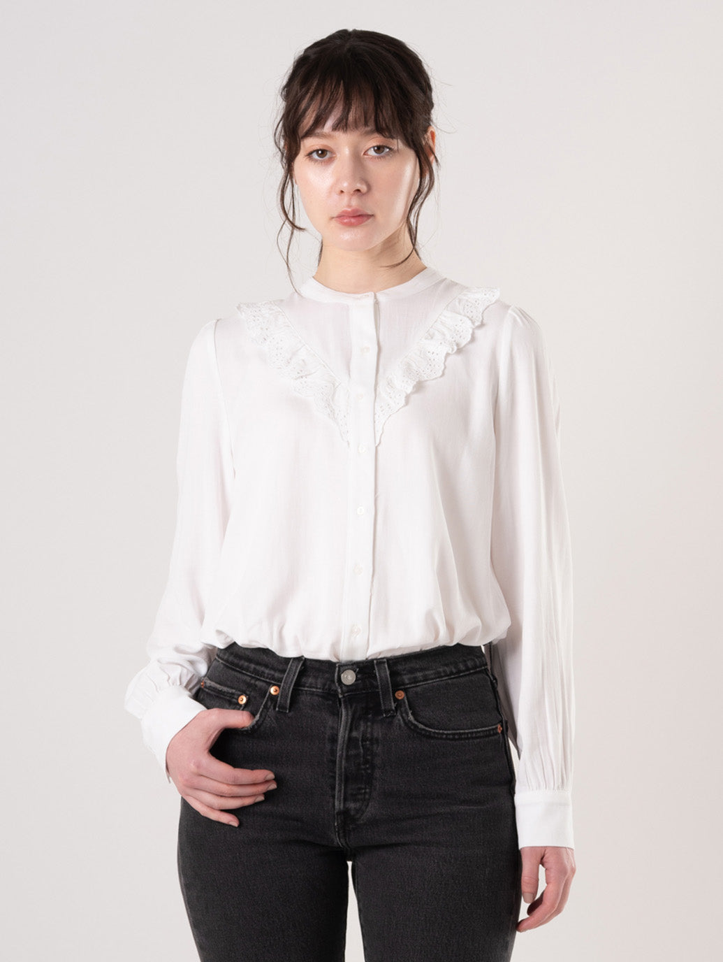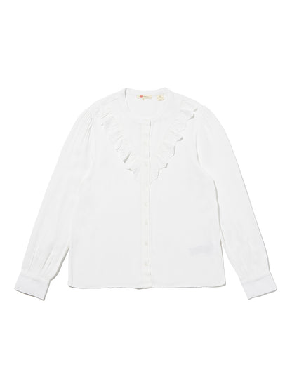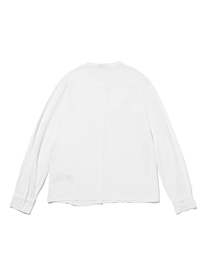 ハイネックとクラシックなフロントボタンアップ、ブルゾンスリーブのあるデザインで、ロマンティックなアイレットディテールを施しました。レーヨン90%/麻10%の生地、爽やかなホワイトカラーで春先から活躍間違いなしの一着です。