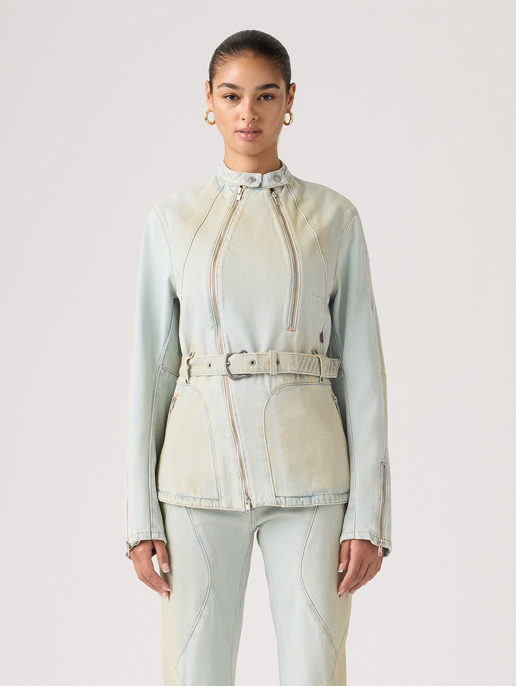 さらに、ジッパーカフスのゴデットディテールがテクニカルな精密さを引き立て、コーディネートできるベルトも付属。デザイン性と機能性を兼ね備えた特別なジャケットです。