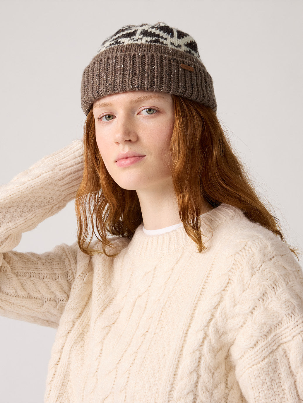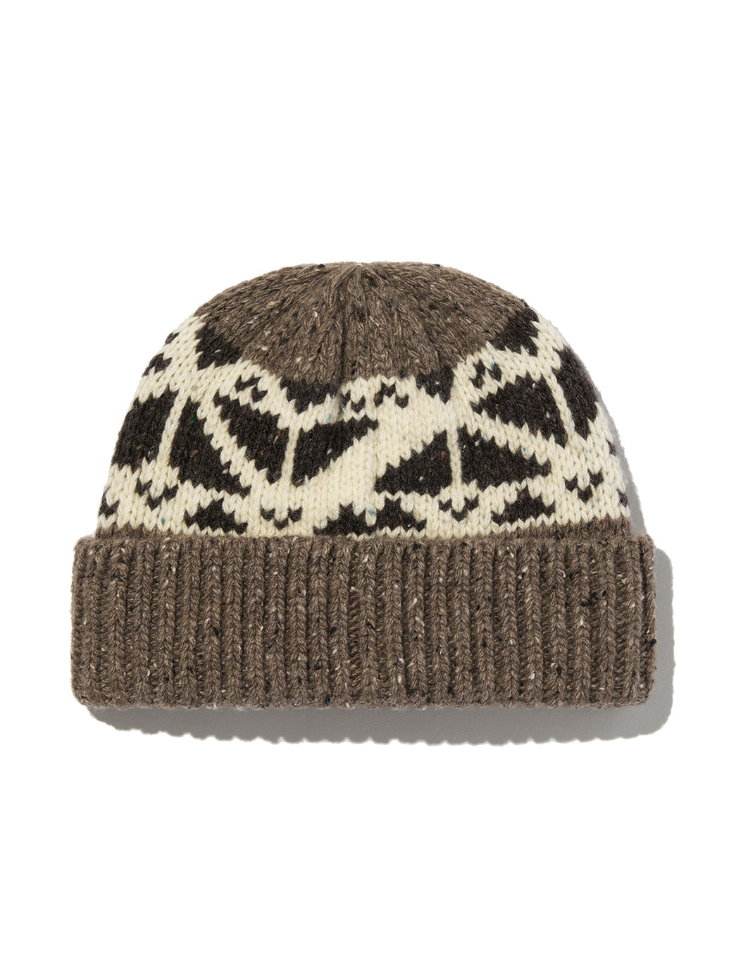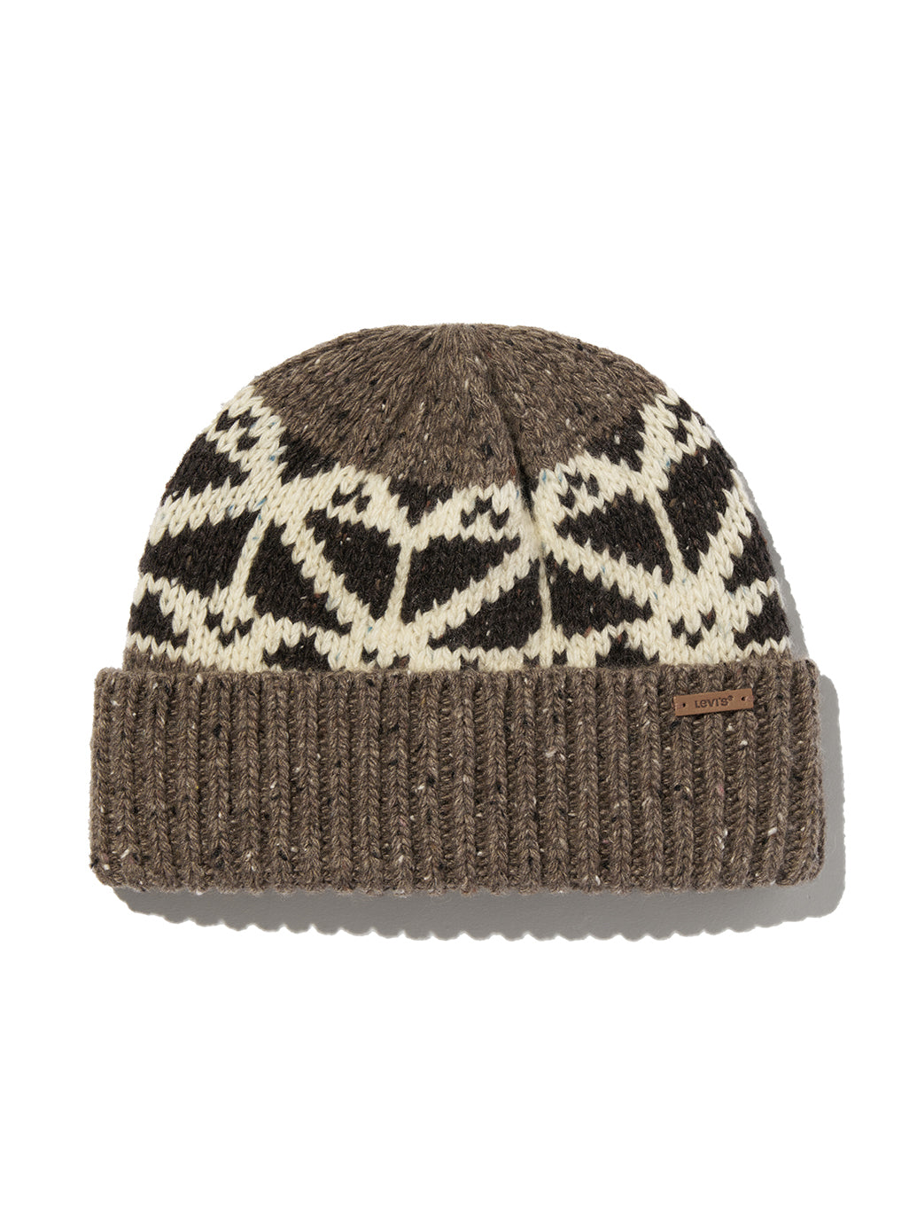 クラシックな折り返しデザインとプリントが特徴のボヘミアンビーニー。心地よいダブルニット構造で暖かさをキープし、冬のカジュアルスタイルにぴったりの一枚です。
