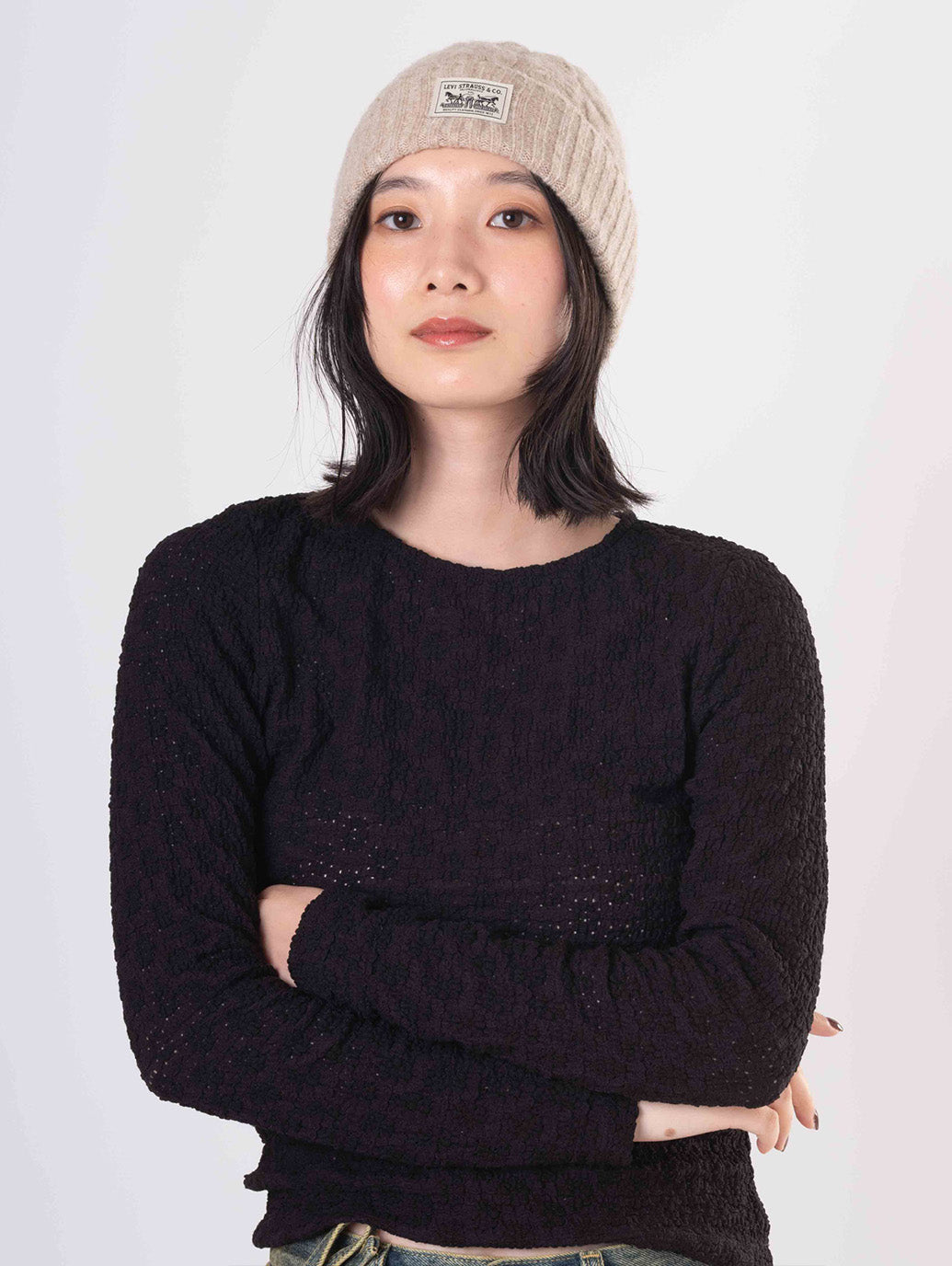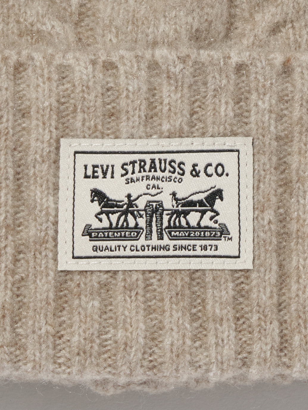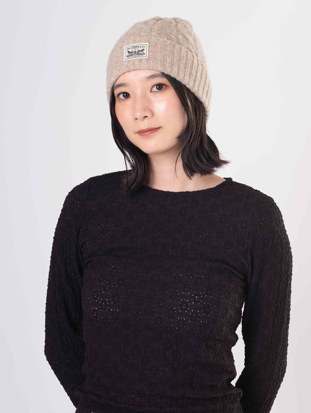 ホリデーシーズンにぴったりのケーブルニットバックパッチビーニー。暖かいケーブルニット素材を使用し、Levi's®のシグネチャーパッチで仕上げた一枚です。寒い季節のカジュアルスタイルに最適。