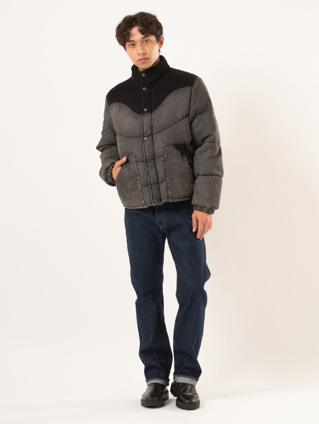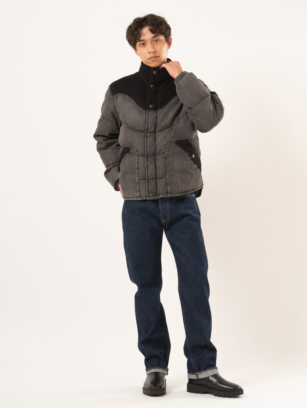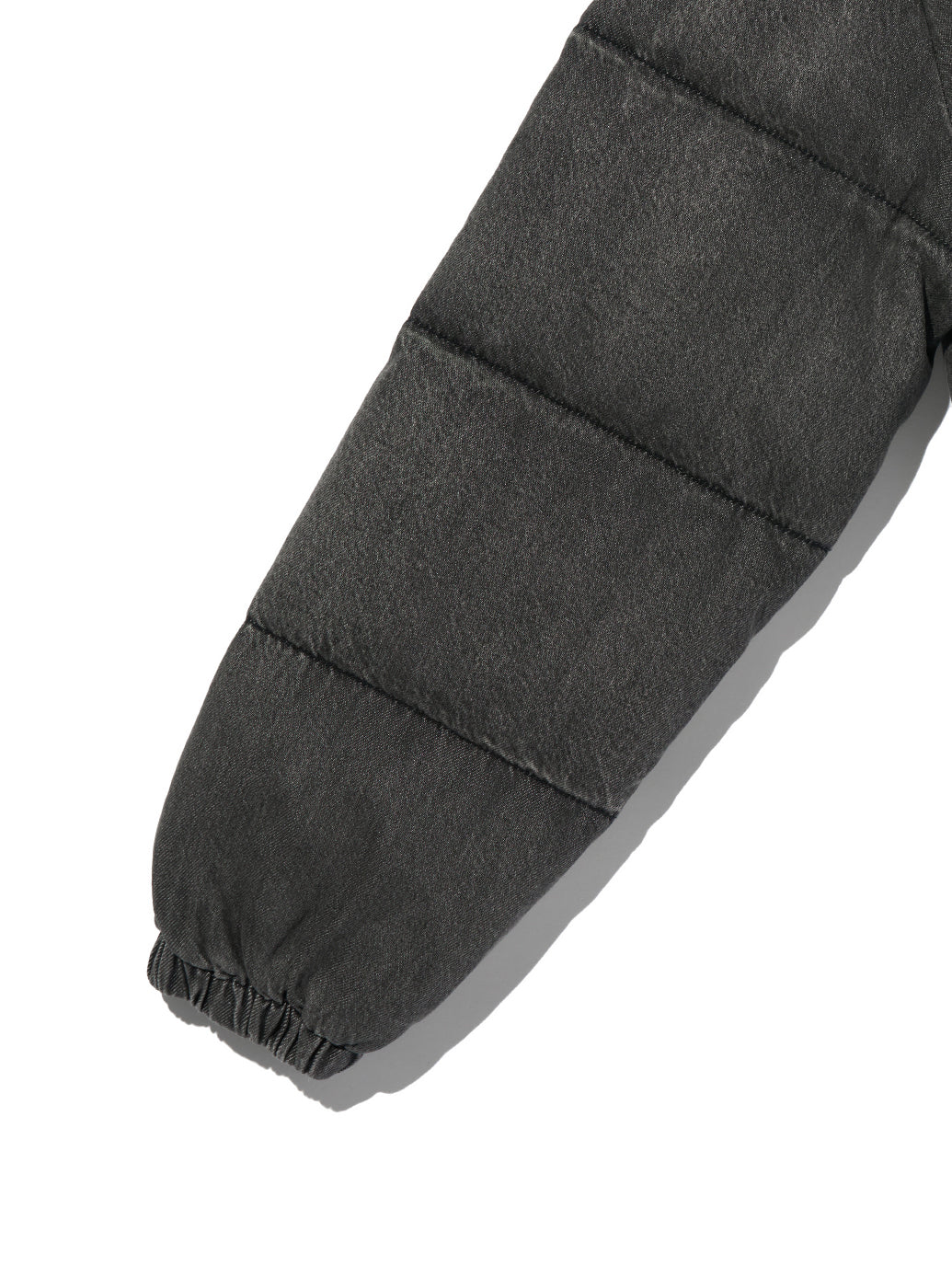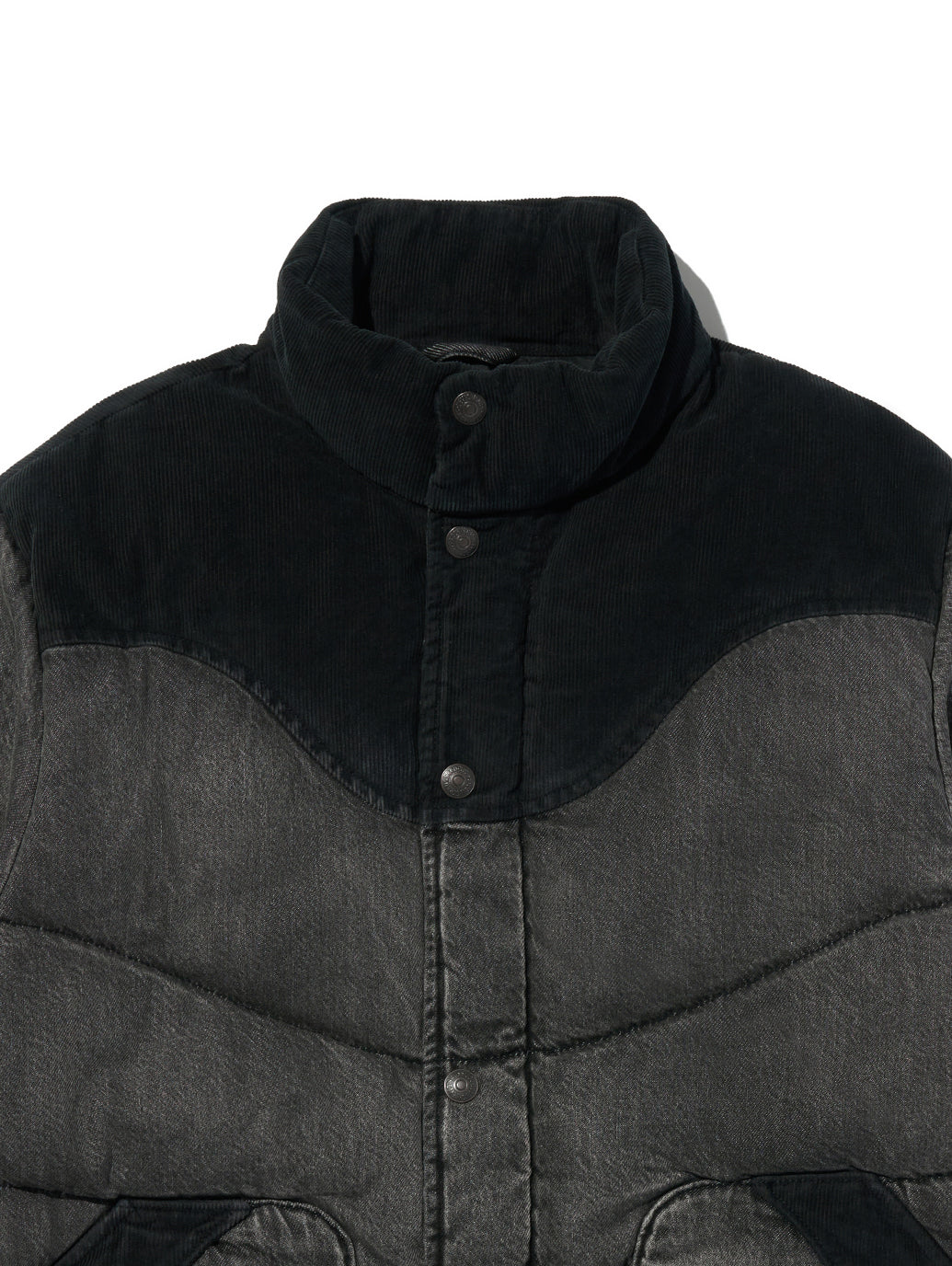 デニムの風合いを生かした切り替えデザインが印象的なダウンジャケット。
