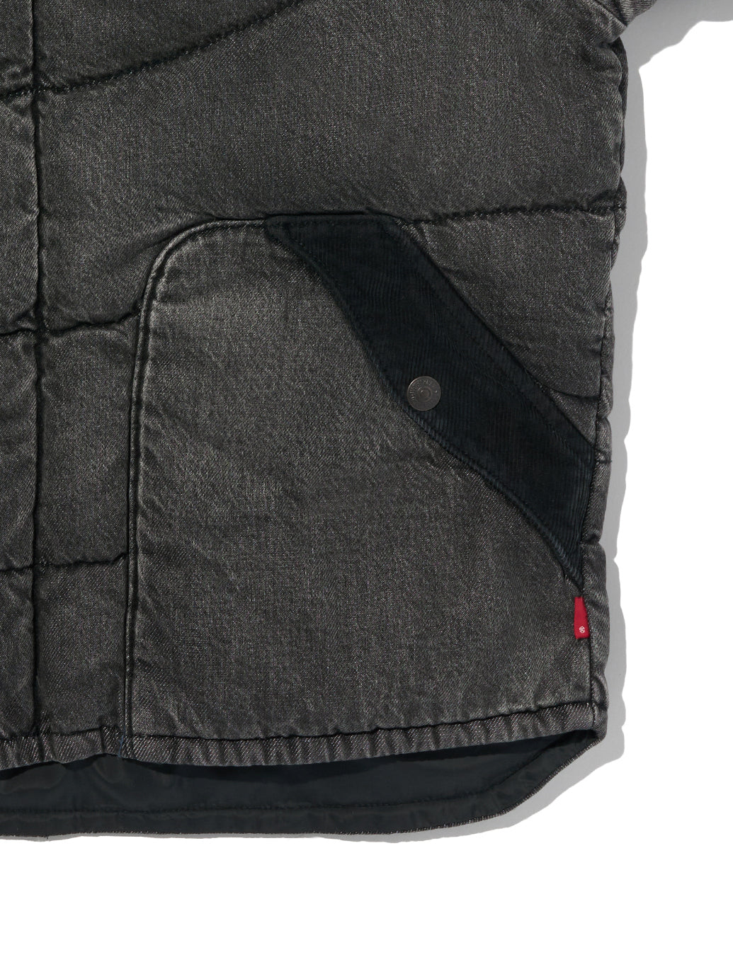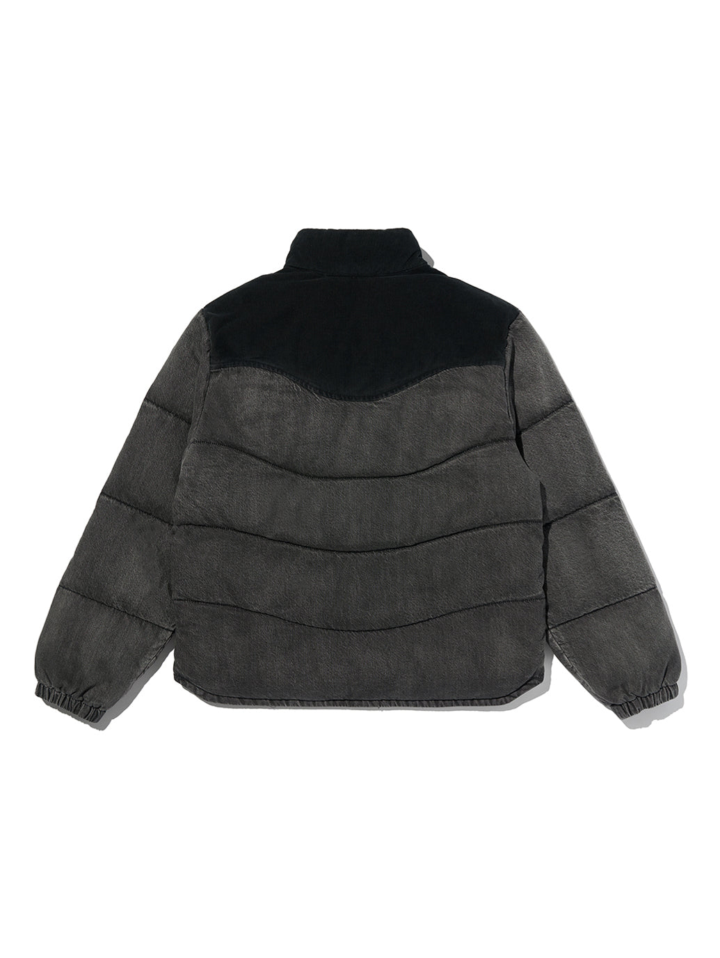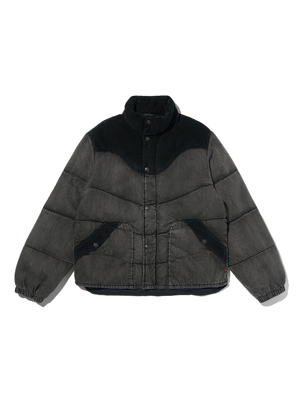 デニムの風合いを生かした切り替えデザインが印象的なダウンジャケット。