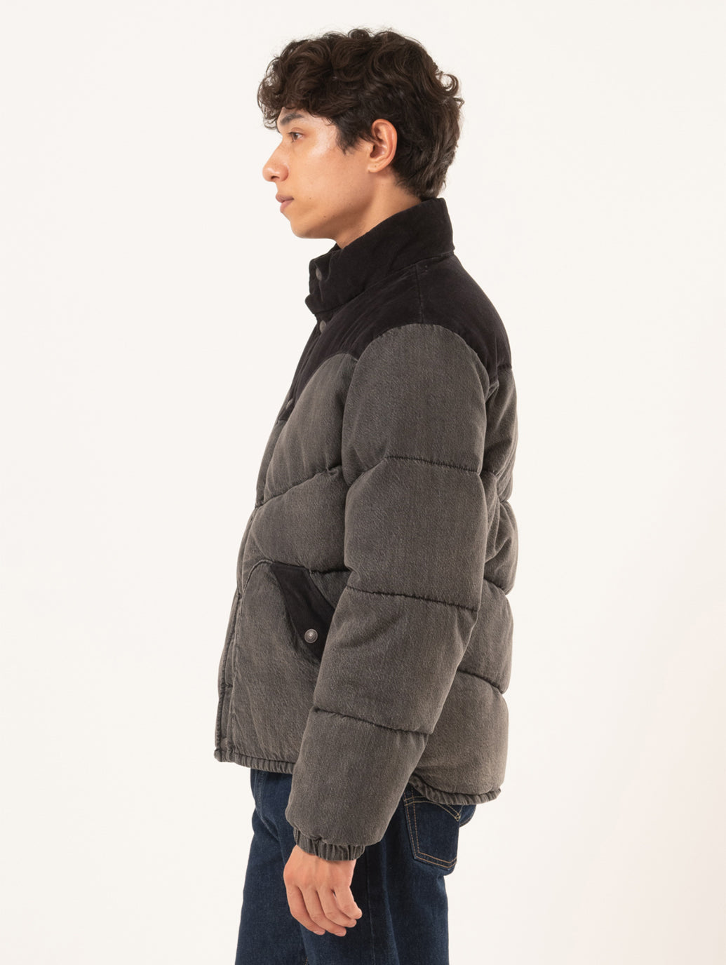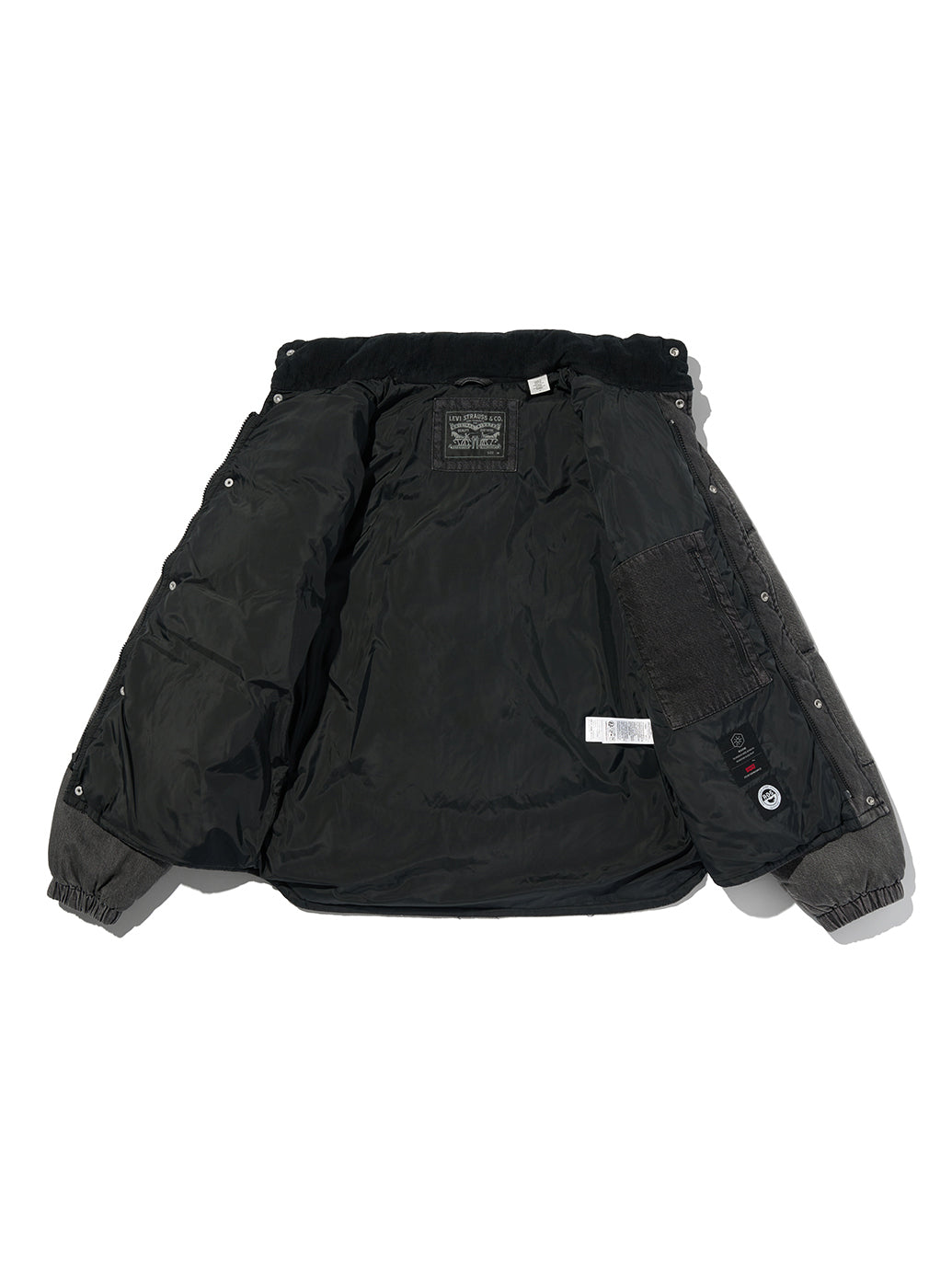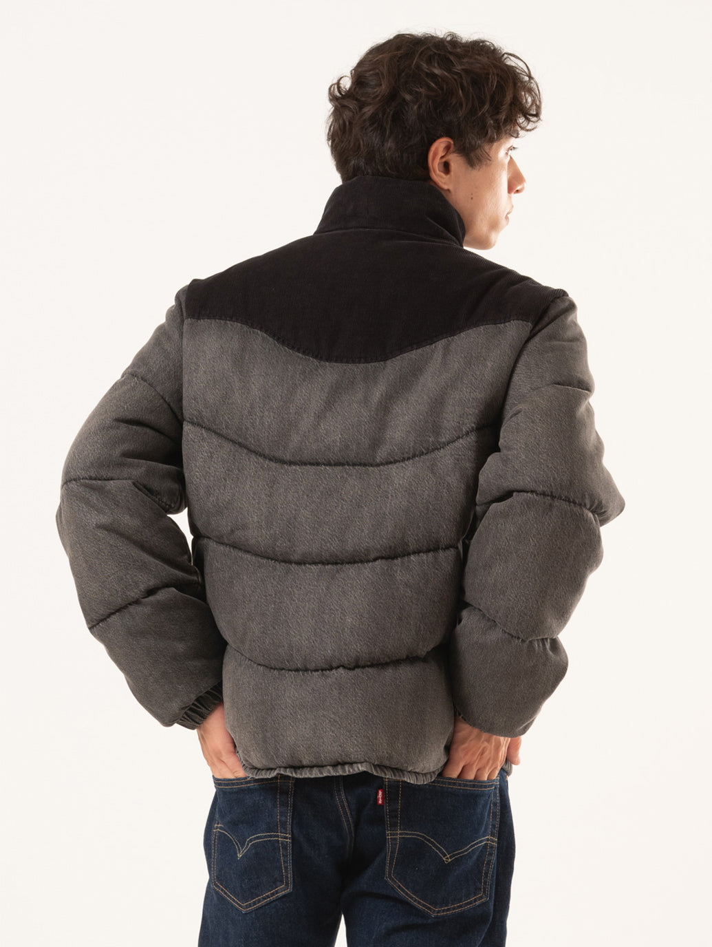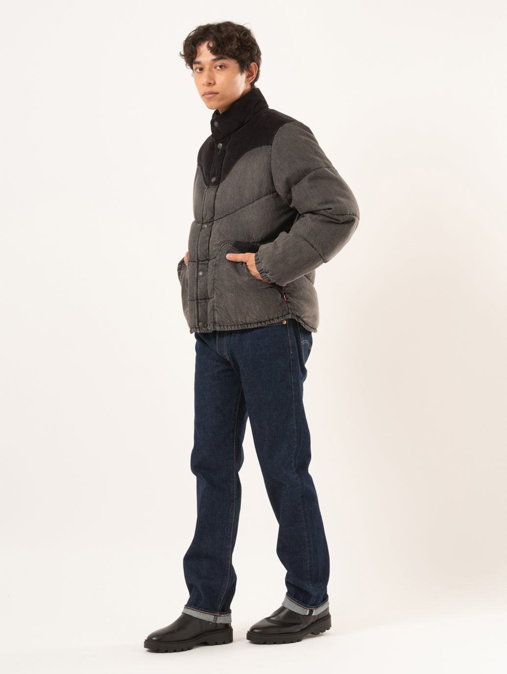 デニムの風合いを生かした切り替えデザインが印象的なダウンジャケット。