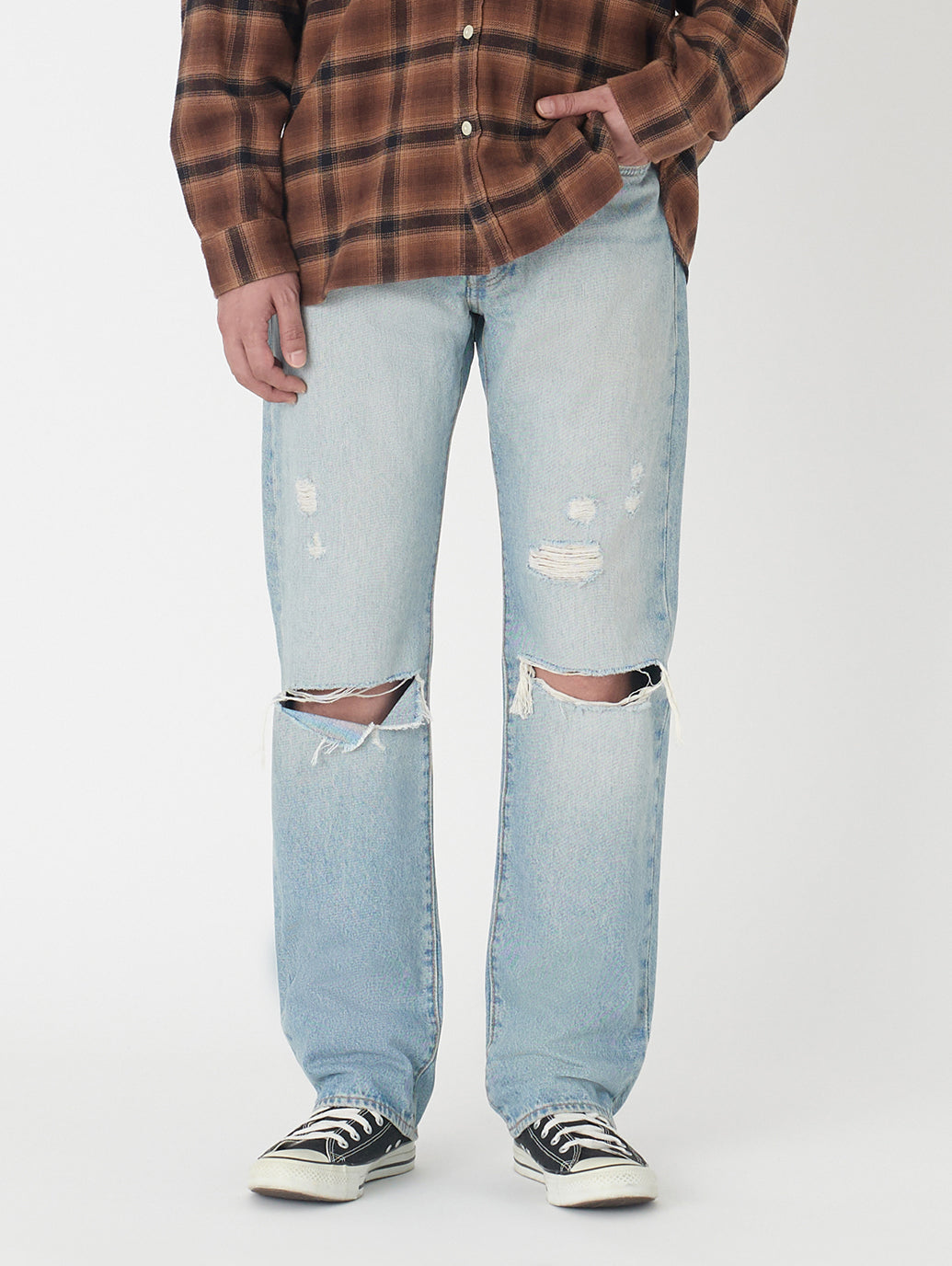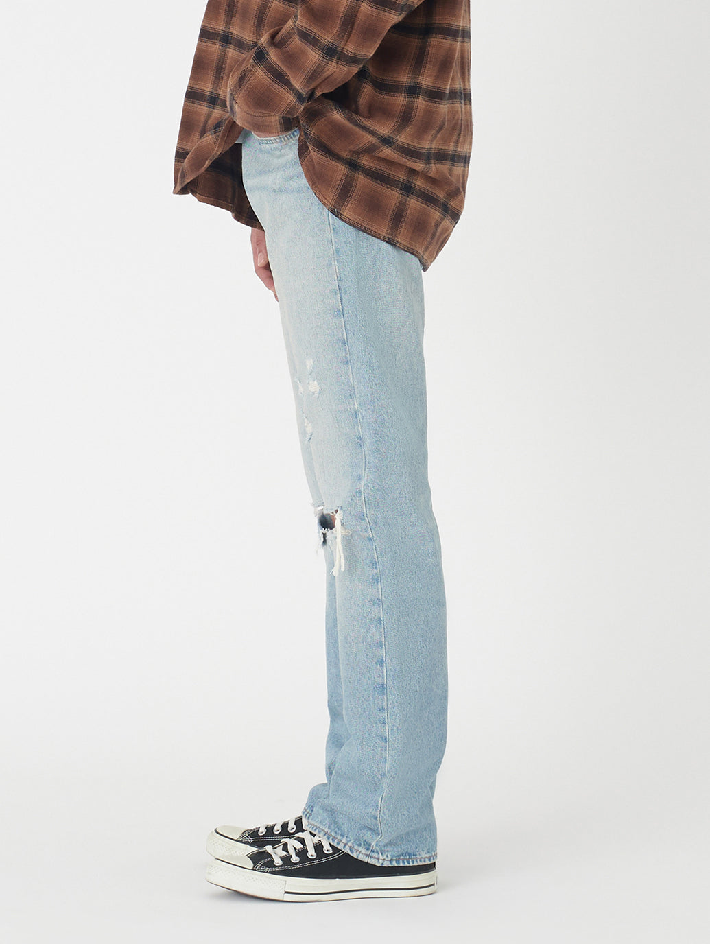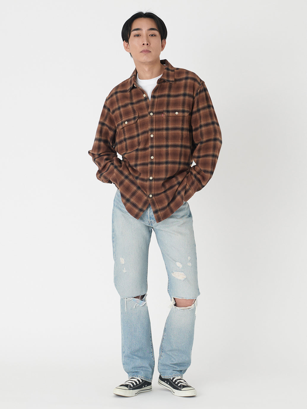 リーバイス®のベーシックシルエットの基本。1890年にロットナンバーとして「501」が、初めて商品に付けられて以来、たくさんの人々に愛され続け、その人らしさを表現する究極のアイテムの一つとして今も人気のジーンズです。シグネチャーのストレートフィットでカスタマイズや自己表現にぴったり。股上は程よい深さで裾に向かってすっきりとしたストレート。ヴィンテージ /古着で必ず目にする501®。ダメージジーンズの雰囲気に合わせて、トップスはリラックスフィット。501®は少し大きめのサイズを選ぶのがお勧めです。