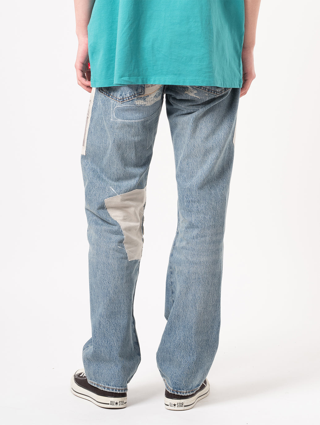 本来ポケットの内側にあるスレーキをあえて表の生地に縫い合わせダメージ加工を施した珍しいデザインです。是非、セットアップで合わせていただきたい1着です。