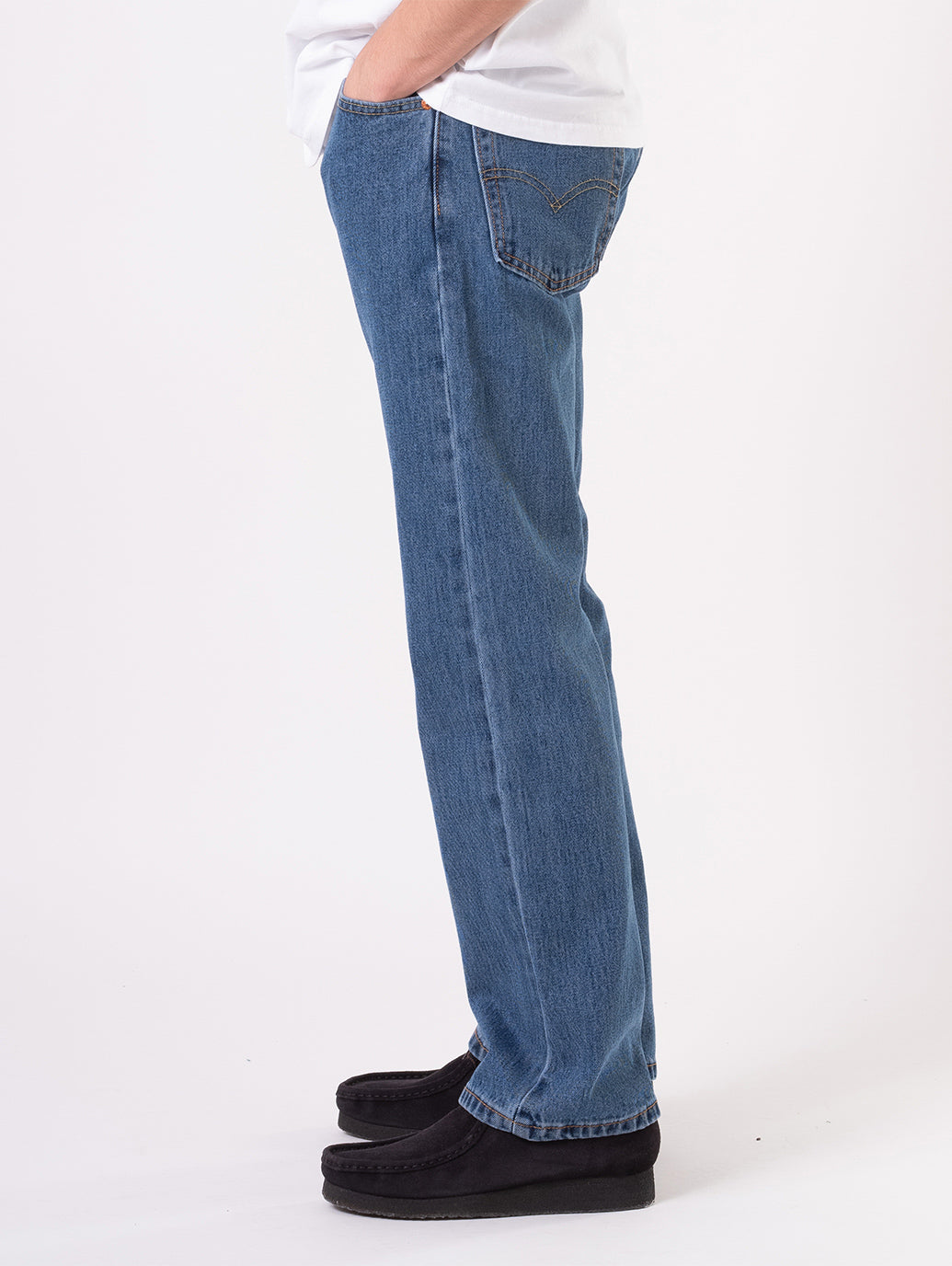 リーバイスのベーシックシルエットの一つ。股上は程よい深さ。太ももから膝にかけてしぼられていて裾に向かって広がるブーツとの相性抜群のブーツカット。ヴィンテージ/ 古着で最近多く目にするトレンドのシルエットです。 裾幅が広いためボリュームのあるワークやミリタリーブーツに裾部分も覆うように穿くことが出来ます。 どんな履物に合わせても脚長効果を発揮し、綺麗めな印象を与えてくれます。また、アメリカをはじめフランス/ドイツ/イタリア等のユーロの軍物も無骨な印象が強いですがブーツカットと合わせることでそれぞれの個性を調和し、バランスのとれた着こなしに仕上げてくれます。80sを象徴するプレッピースタイルや90s を象徴するストリートスタイルも”ルーズ”や”着崩す”ということがポイントでブーツカットは最適なアイテムです。幅広いスタイルで活躍するアイテムの一つです。