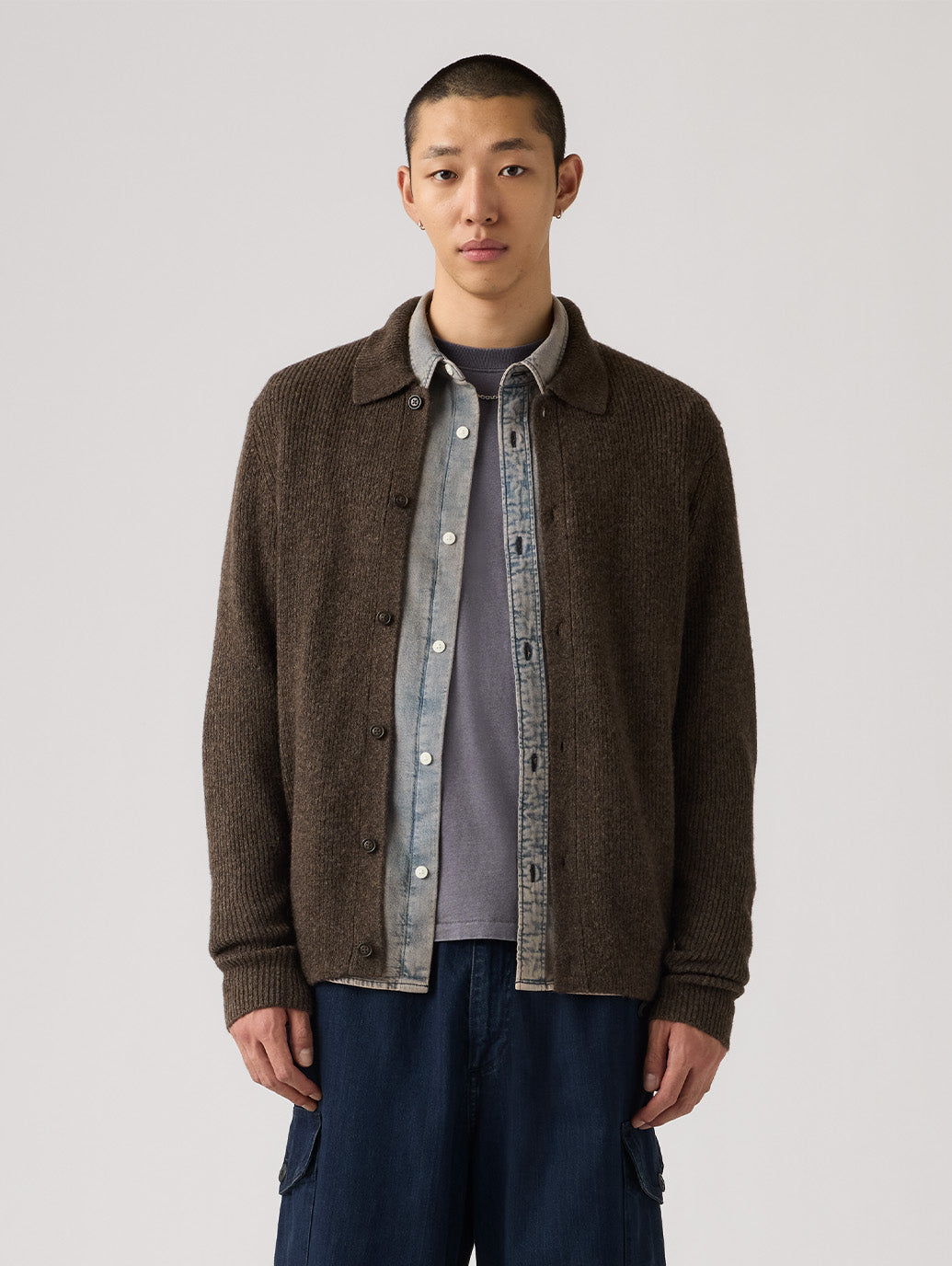 カタリナカーディガンの最大の魅力は、クラシックなポイントカラーとリラックス感のあるゆったりとしたフィットによる高い汎用性です。ボタンを留めて一枚で着用するのはもちろん、Tシャツとのレイヤードスタイルもおすすめ。スタイリングを問わず、幅広い着こなしに対応する一着です。