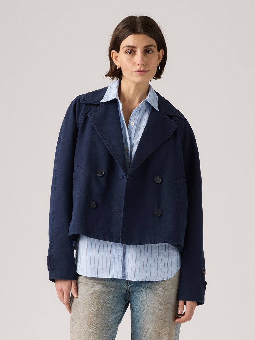 クラシックなスタイルとモダンなカットのBree Cropped Swing Trench Jacketは、時代を超越したラペル、ボタンアップフロント、そしてゆったりとしたリラックスフィットが特徴です。