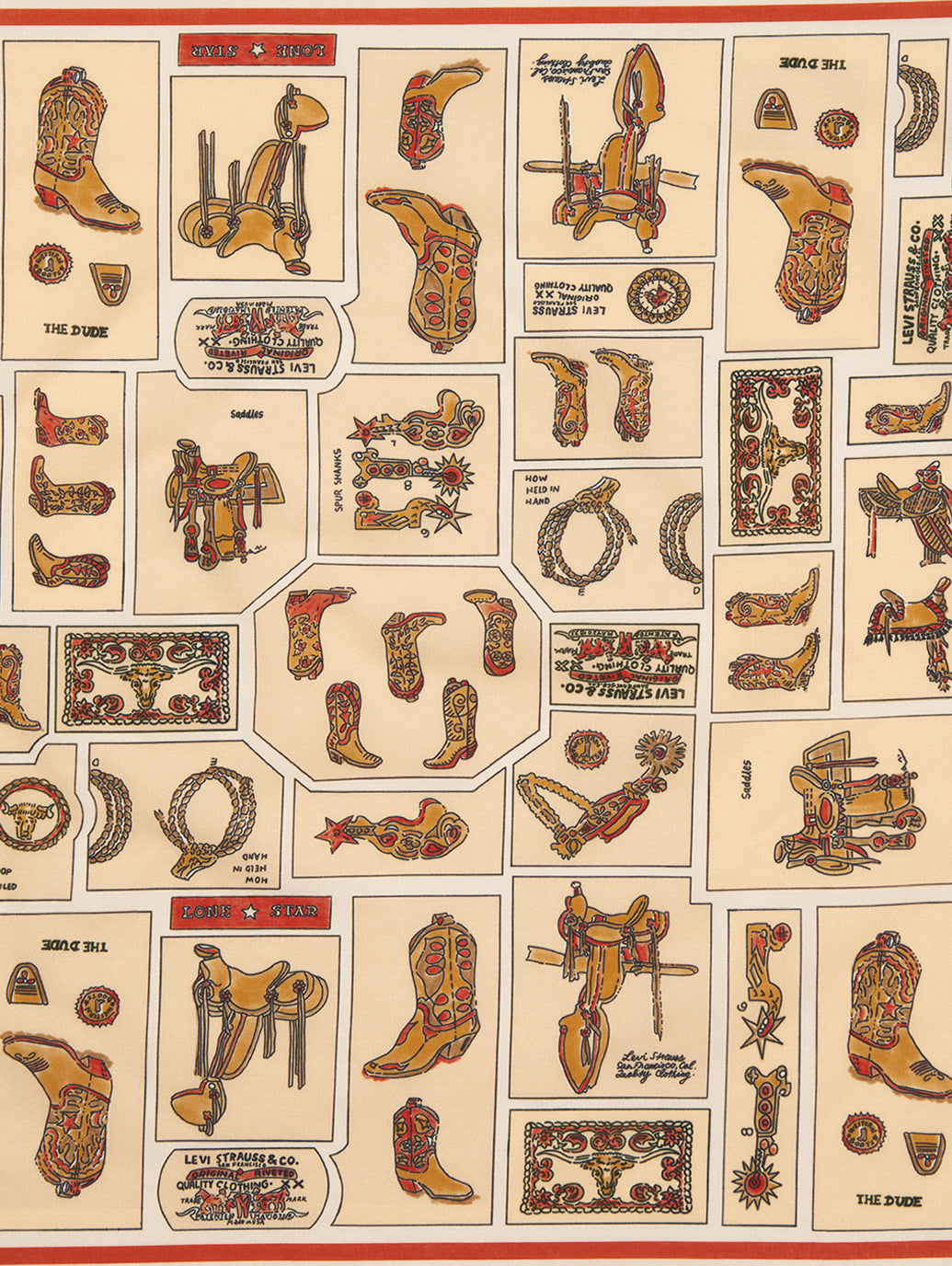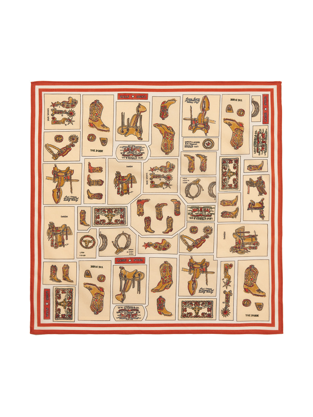 デニムにピッタリな綿100%のウエスタンバンダナ。ウエスタンBOOTSが描かれていてユニセックスでご使用いただけます。
