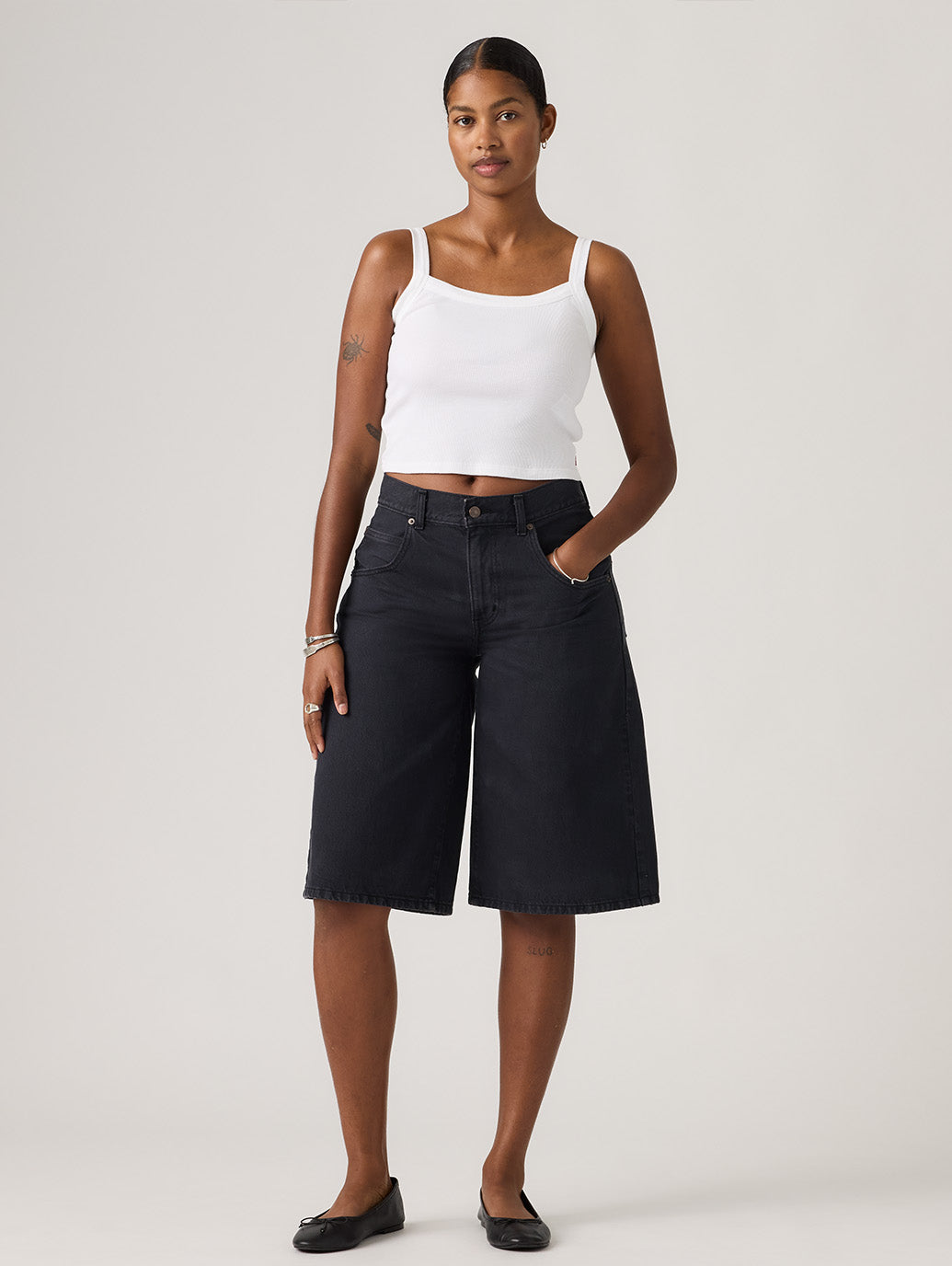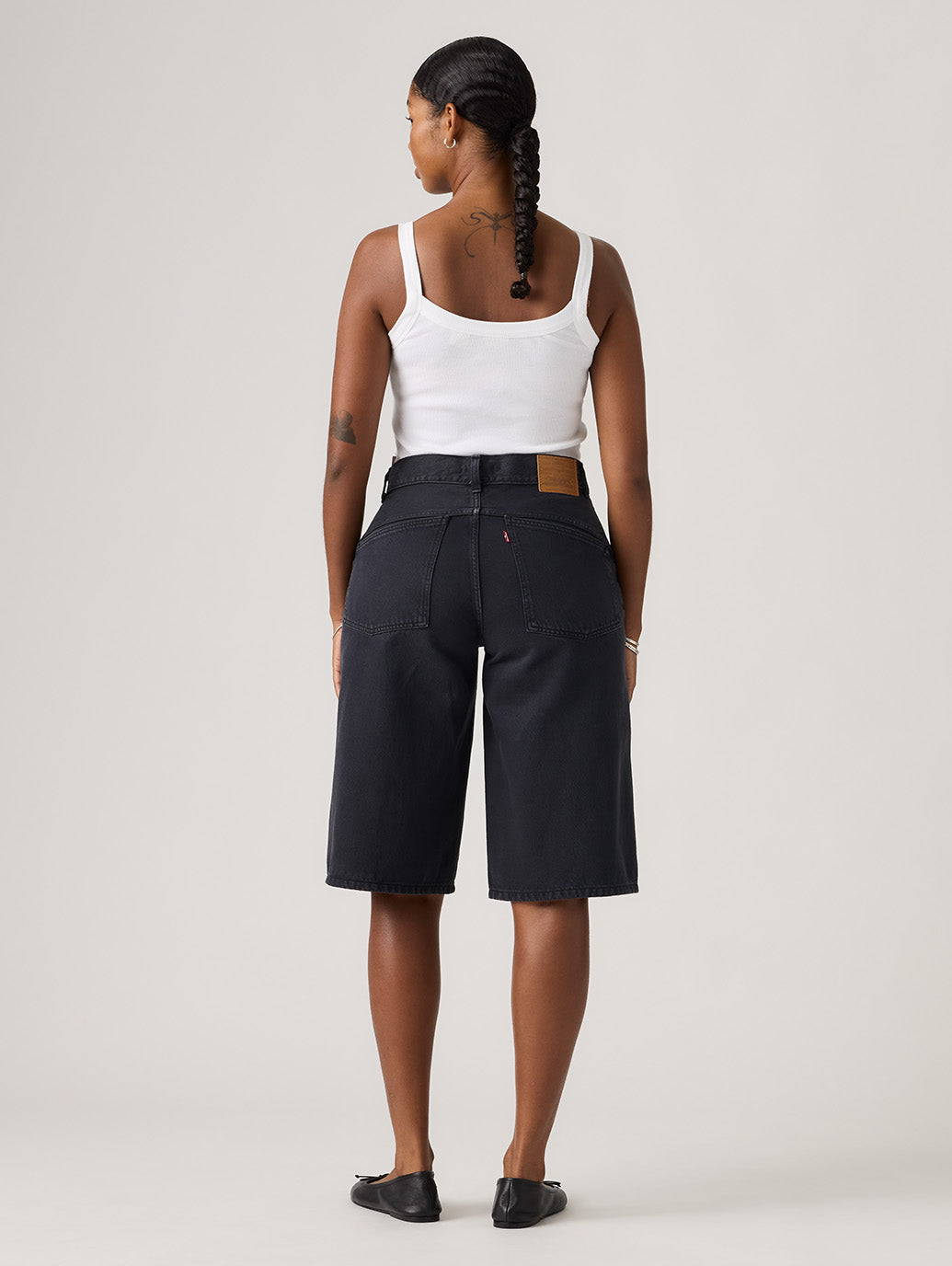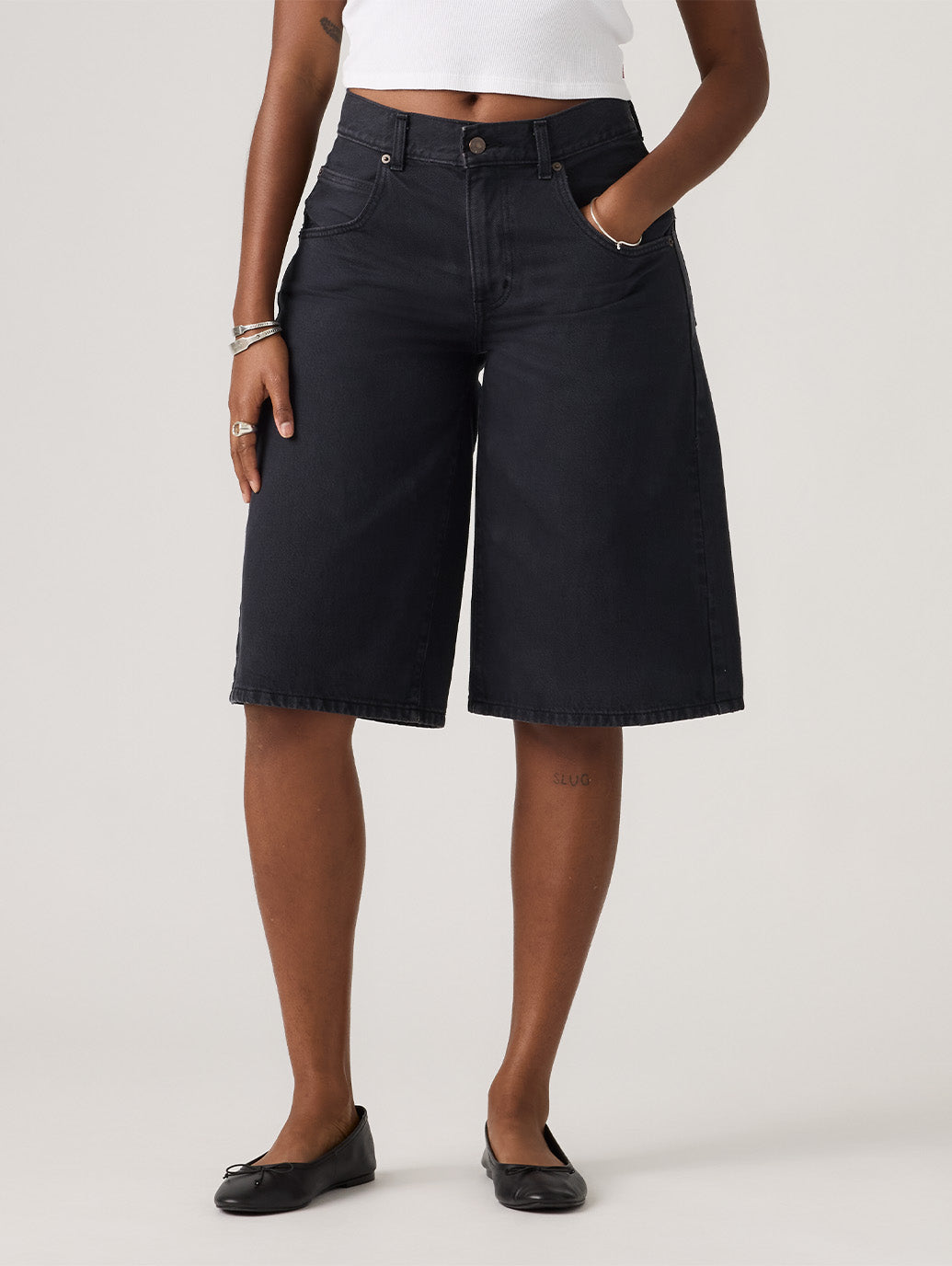 バギーショートジーンズがトレンドのカラーでデザインされました。綿100%のリラックス感のあるミッドライズの超バギーフィットを融合。余裕を持たせ、さりげなくエッジィな雰囲気にすることで、ゆったりしながらもシルエットが引き立ちます。お気に入りのスニーカーと合わせれば、いつでもクールな90年代のルックを楽しめます。