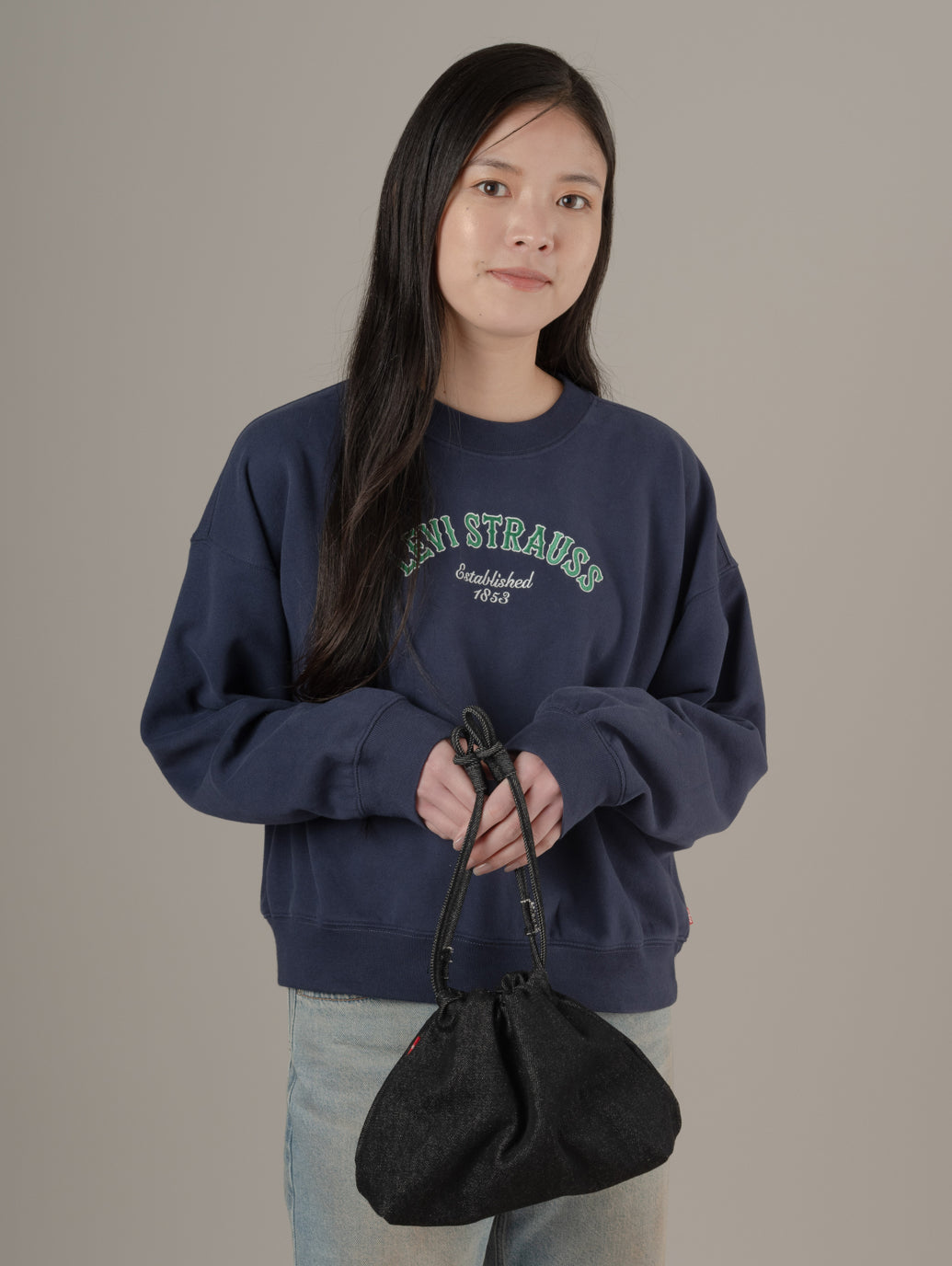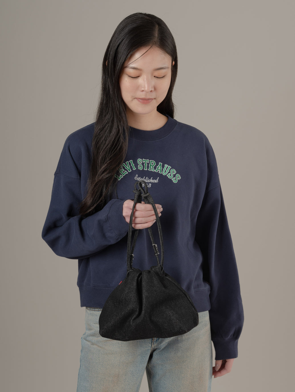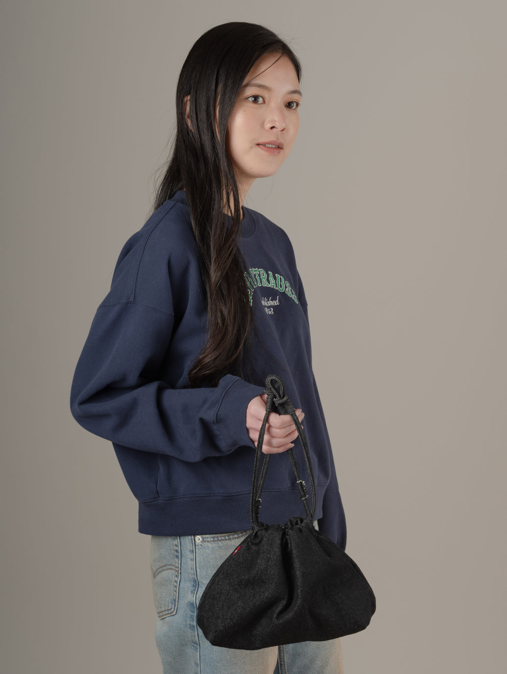 長さ調節可能なストラップとスナップクロージャーを備え、デニム素材のシンプルなデザインに仕上げました。デイリー使いにちょうどいい、気負わず持てるアイテムです。