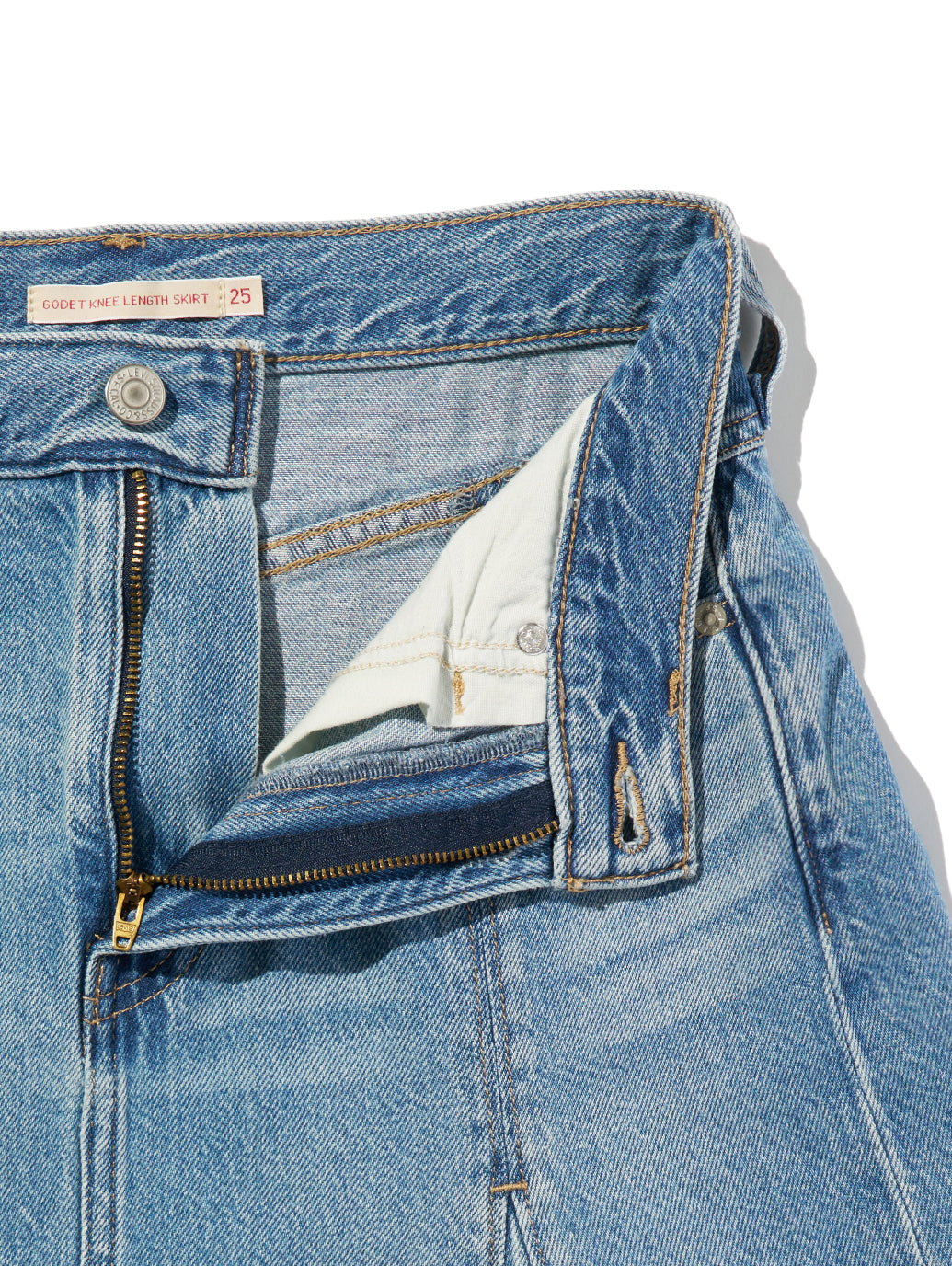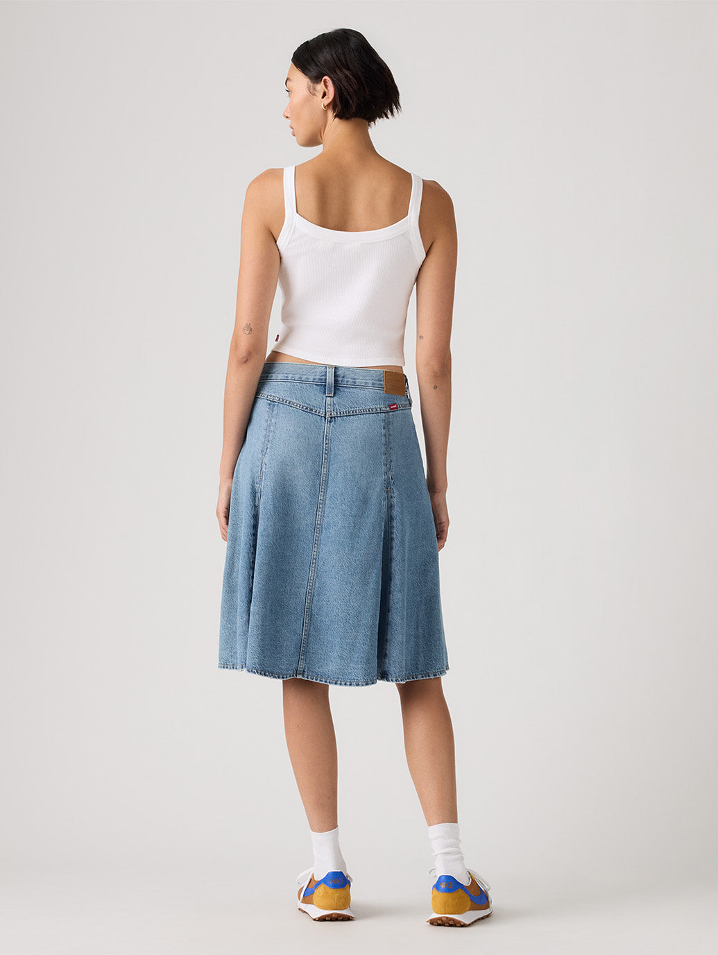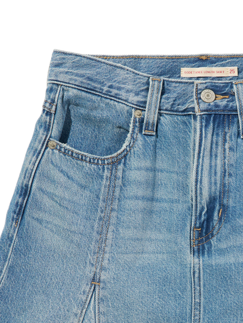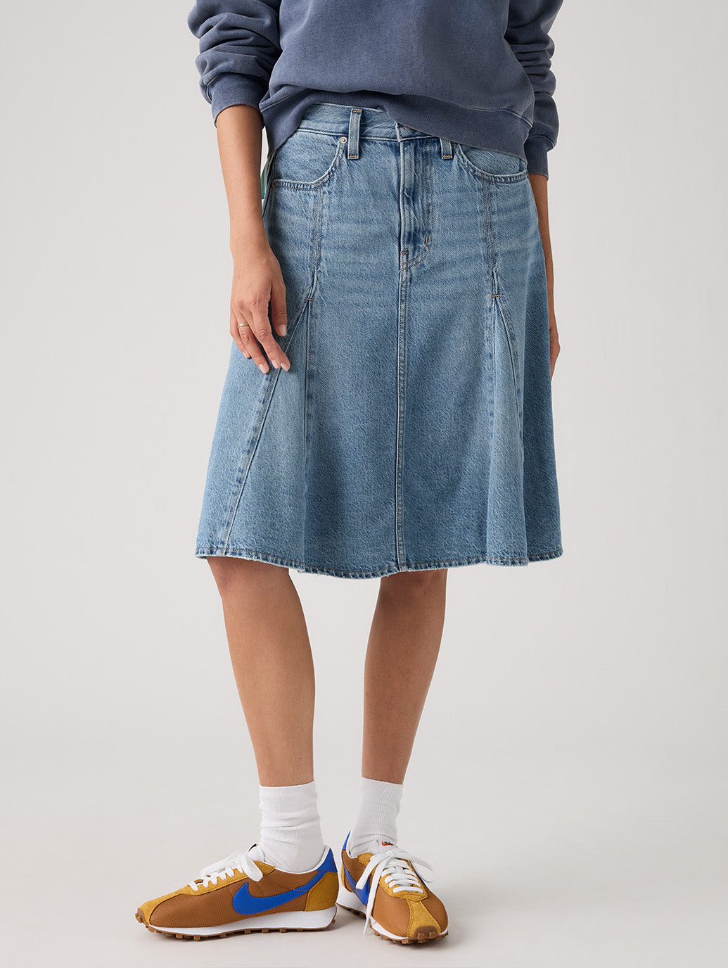 お気に入りのデニムが、完璧な膝丈スカートになりました。ゴデットニーレングススカートは、美しいミドルライズと軽量デニム素材で仕上げました。