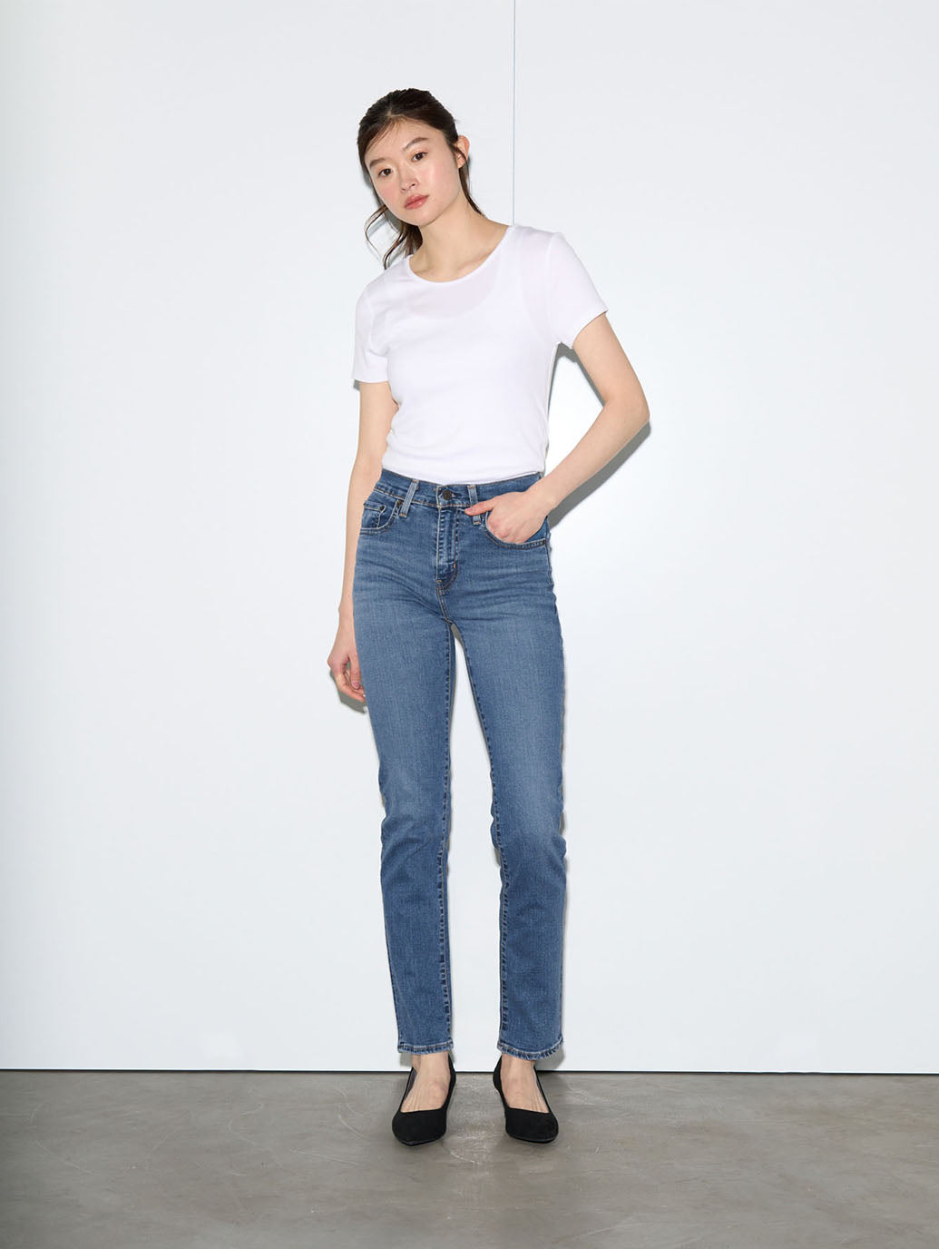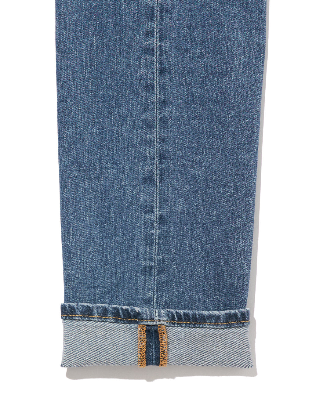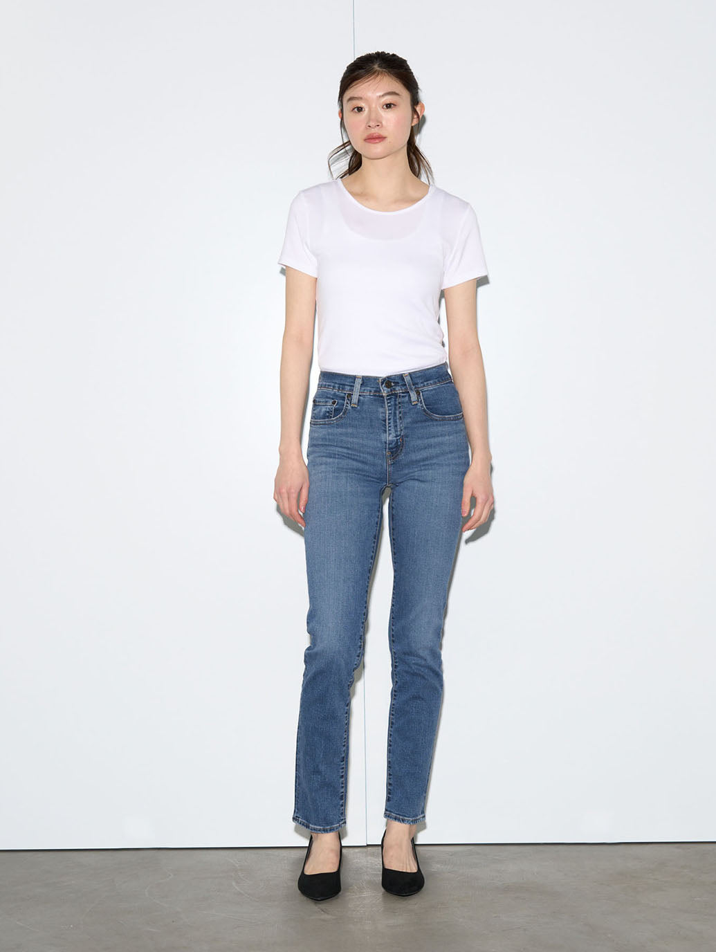 ハイウエストでスリムフィットのストレートシルエットです。一日中穿いていても着心地が良く、ヒップラインをすっきりと持ち上げ、ボディラインを引き立てるようにデザインされています。ストレッチ性の高い素材が採用されており、力のかかるお尻や膝の馴染みが出にくい高品質です。