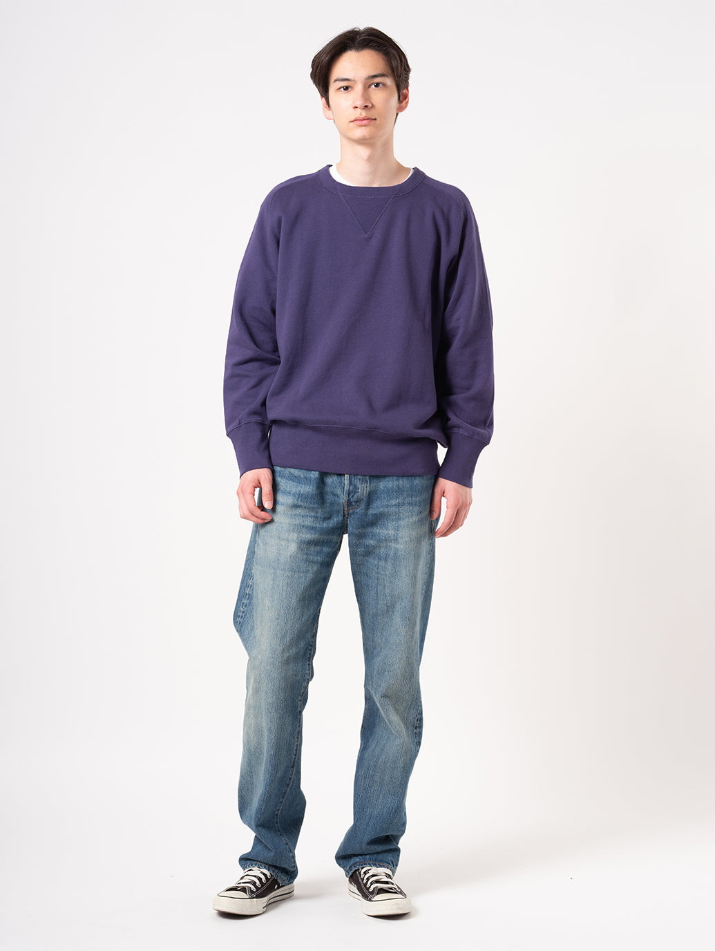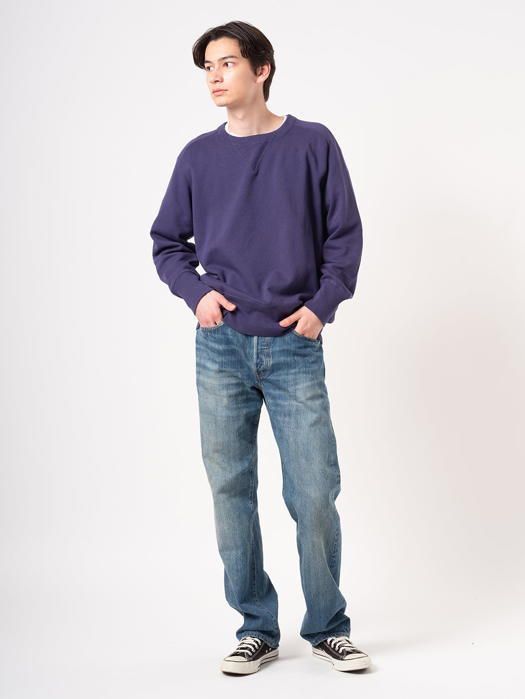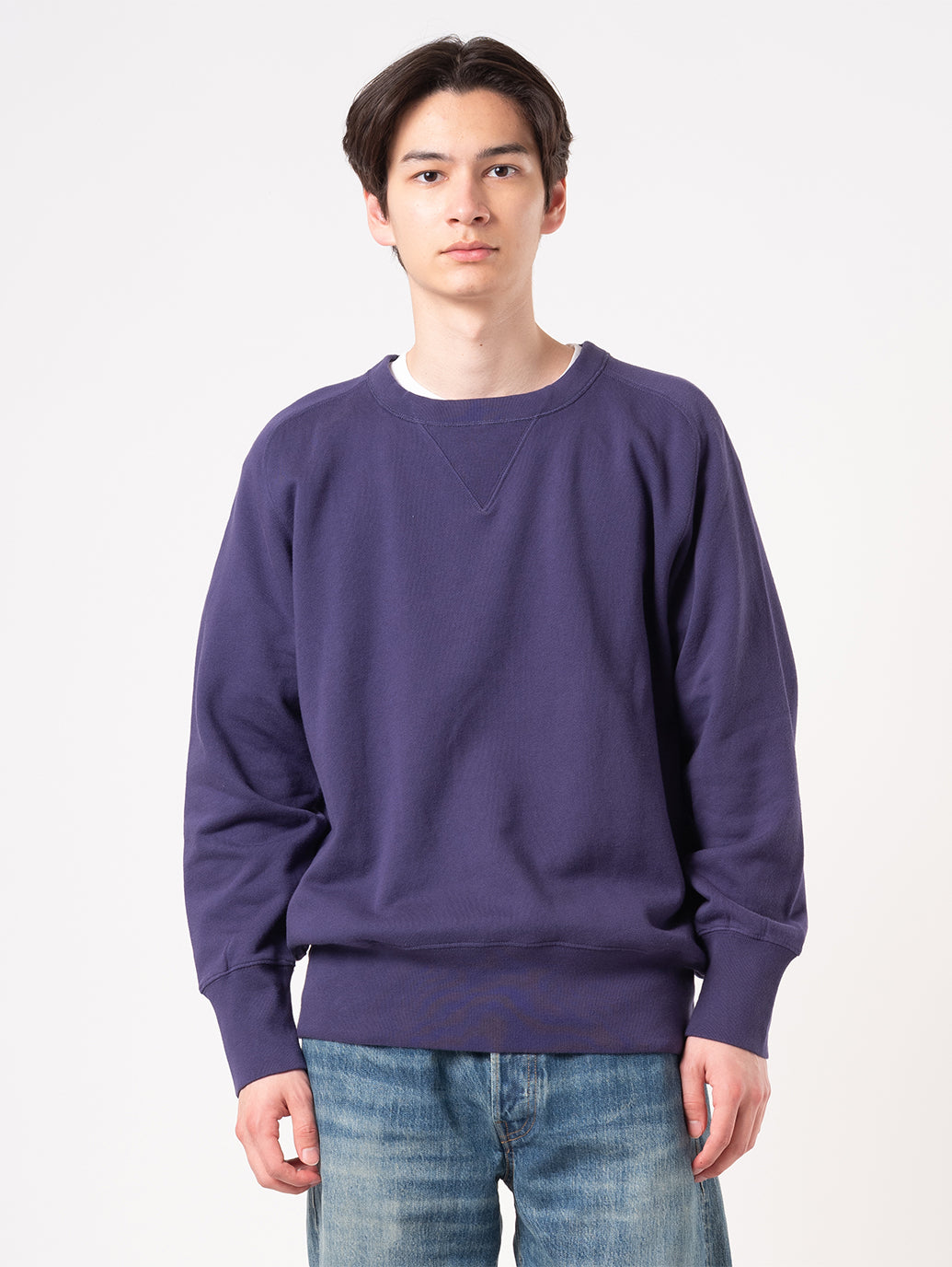 こちらのクルー・スウェットシャツは、1940年代のアーカイブウェアを忠実に再現したもの。ラグランスリーブのカーブした縫い目、フロントとバックのV字型インサート、袖口の超ロングリブなど、さりげないディテールが目を引きます。ライトウェイトで春先でも着やすく、色違いで持っておきたい一着です。