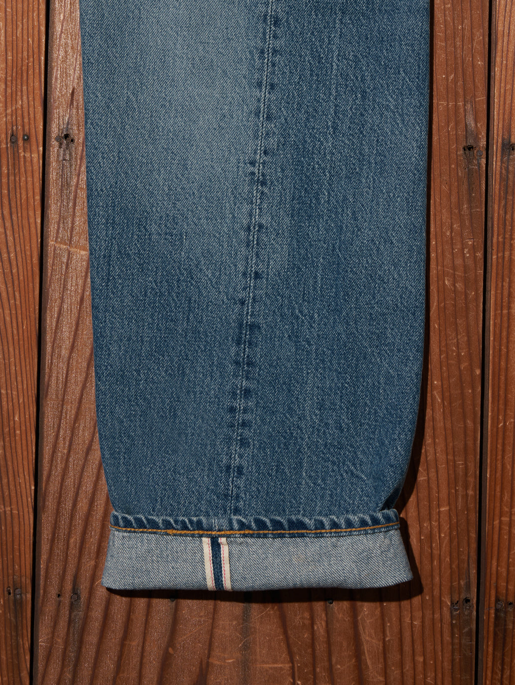 股上や腿周りにはある程度のゆとりがありながらも、裾に向かって緩やかに細くなるテーパードシルエットで、裾を少しロールアップをして穿くスタイルがお勧めです。長年穿き込んだかのような加工を施し、ヴィンテージのような粗さのある生地感と色落ちを表現した拘りの詰まった一本です。
