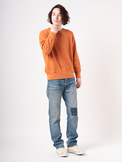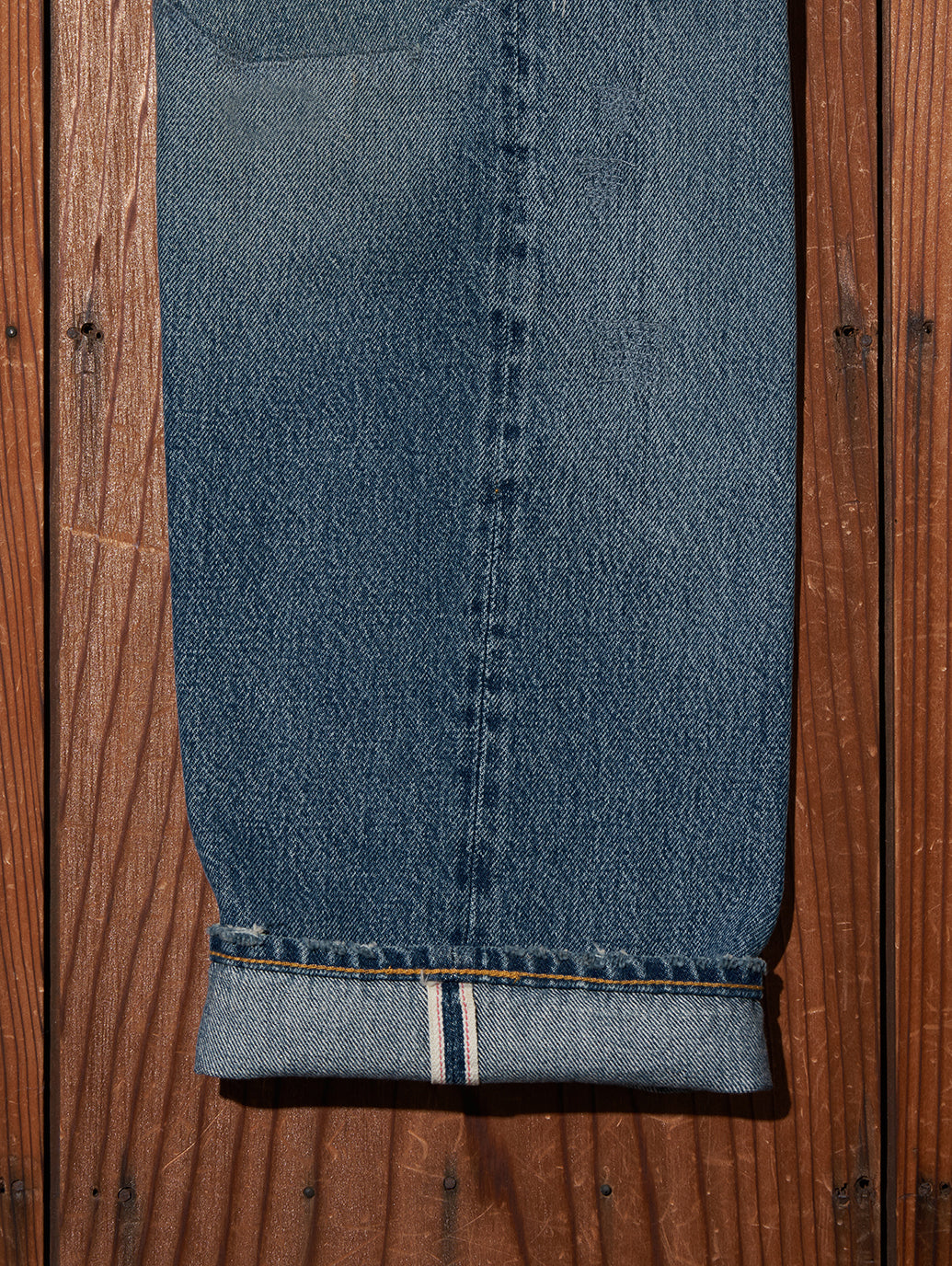 股上や腿周りにはある程度のゆとりがありながらも、裾に向かって緩やかに細くなるテーパードシルエットで、裾を少しロールアップをして穿くスタイルがお勧めです。長年穿き込んだかのような加工を施し、ヴィンテージのような粗さのある生地感と色落ちを表現しています。ダメージ加工やリペア跡の施しもしており、細部にまで拘った一本です。