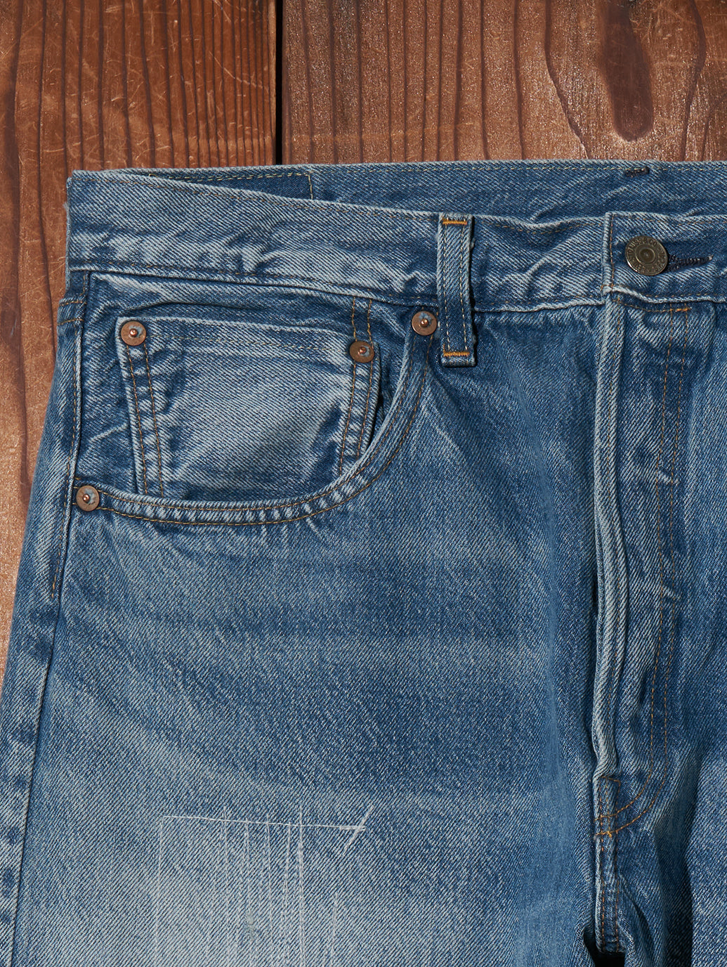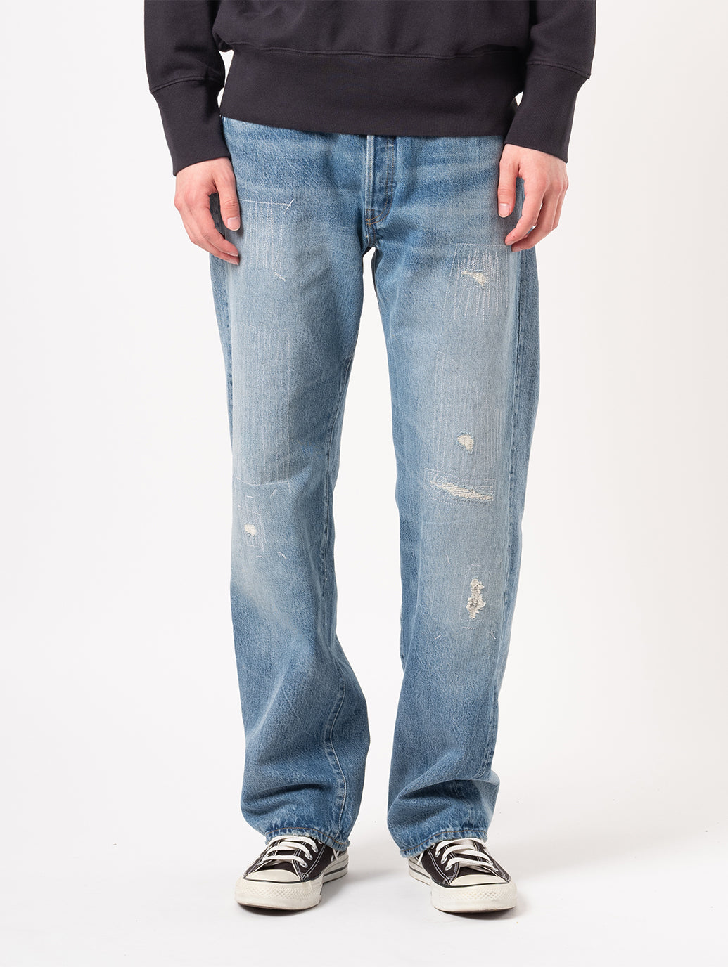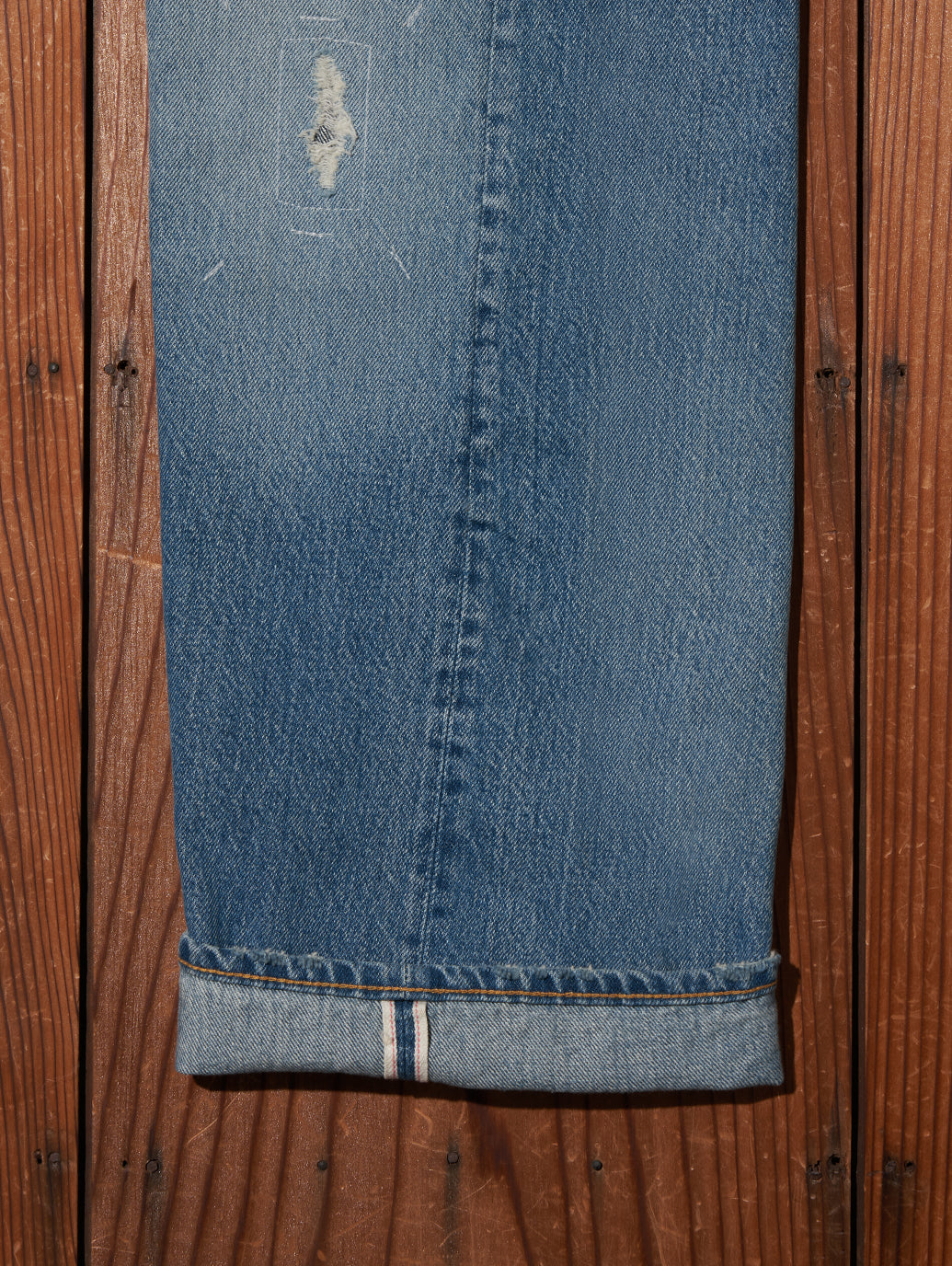 50 年代の究極のスリルを求めるバイカーへのオマージュ。当社の 1955 501® ジーンズは、シート部分に独特の「アンチフィット」 (スリムやスキニーなスタイルに対抗するわずかに緩めのカット) があり、脚周りのカットがやや大きめで、全体的にボクシーなシルエットになっています。裾を少しロールアップをして穿くスタイルがお勧めです。リペア加工を施し、ヴィンテージのような粗さのある生地感と色落ちを表現した拘りの詰まった一本です。