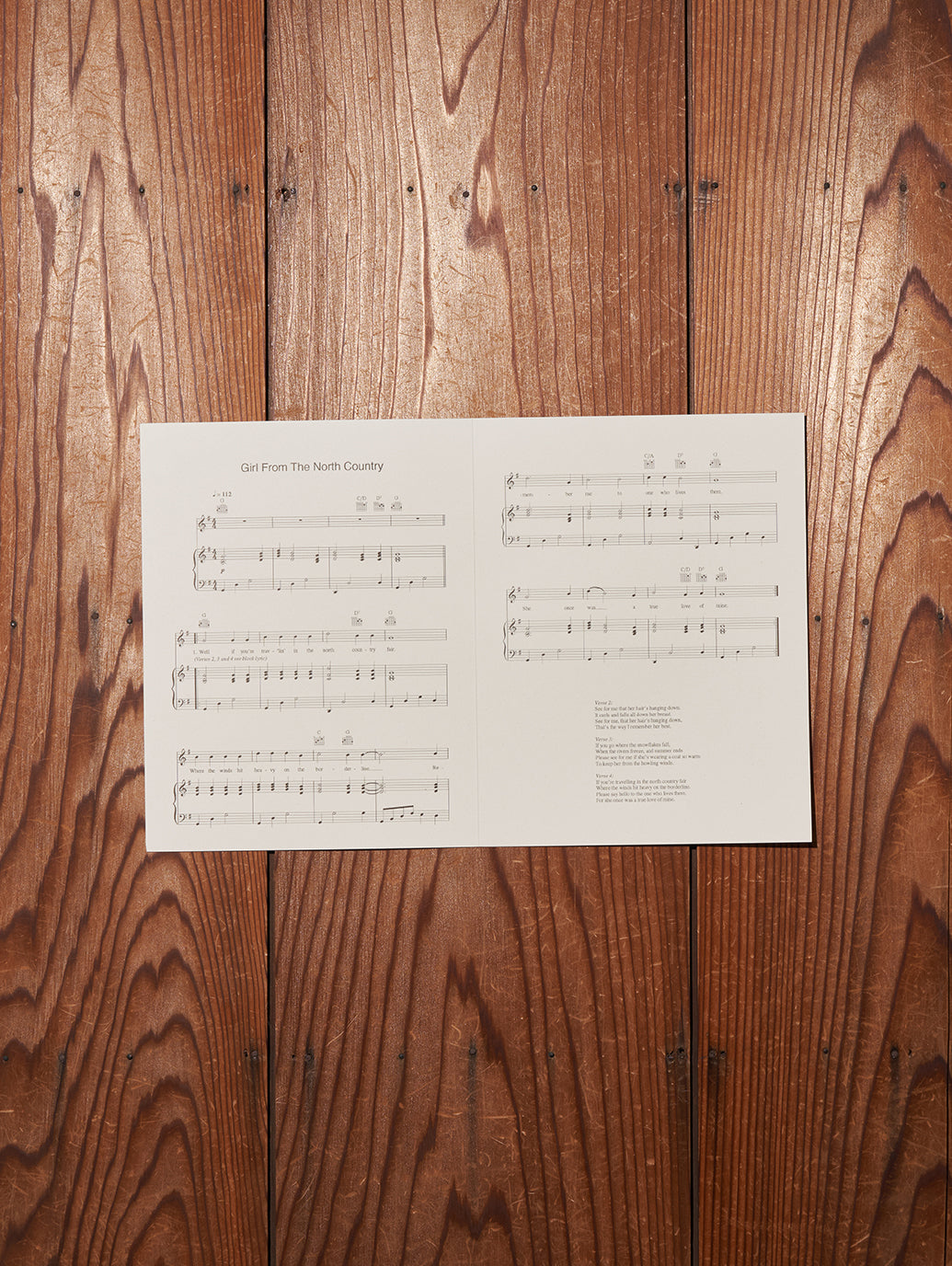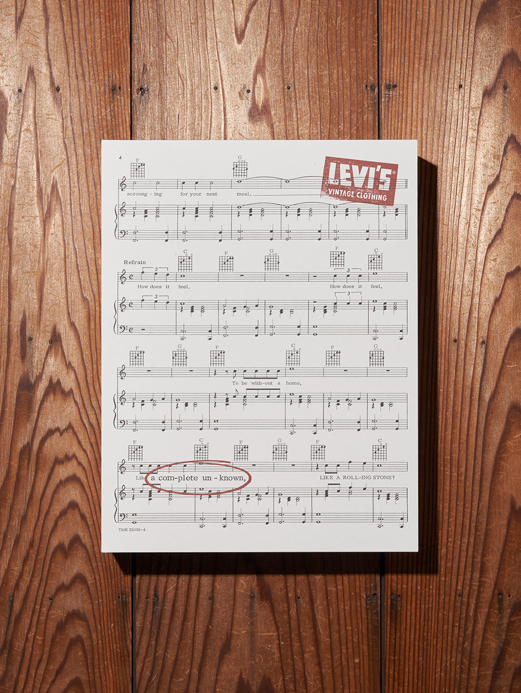 ディランが穿いていたカスタムジーンズにオマージュを捧げたLevi’s® Vintage Clothing 1955 501®は、実際に彼が穿いていたジーンズと同じようにカスタマイズでブーツカットに仕上げています。ディランがいつも身につけていたレザーの「D」バックルベルトも同封されます。映画のように、この新しいコレクションはディランのロマンティックな側面にスポットを当てています。ディランの歌詞があしらわれた美しいボックスに収められたジーンズとベルトには、「Girl from the North Country(北国の少女)」の楽譜、伝説的なミュージックビデオ『Subterranean Homesick Blues(サブタレニアン・ホームシック・ブルース)』の「New Friend(新しい友達)」のキューカード、そしてジーンズのウォッチポケットに隠された、ディランの初期の歌詞である「I’ll let you be in my dreams, if I can be in yours(君の夢の中に入れるなら、僕の夢の中に入れてあげよう)」とタイプで打たれたメモなど、特別なオマージュが添えられています。