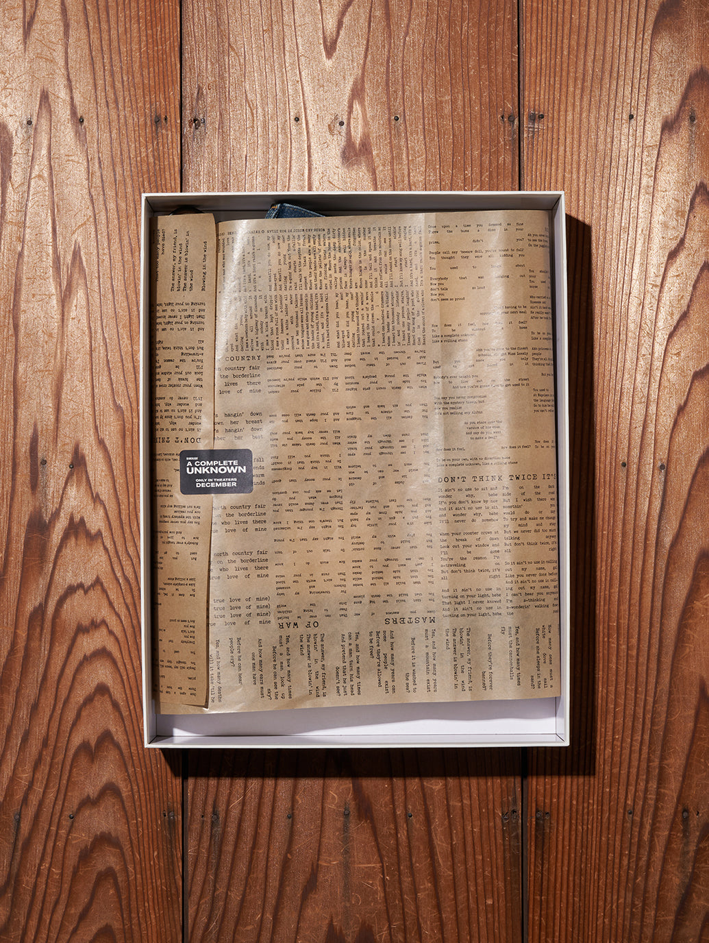 ディランのこのコーディネートを完成させるために、Levi's® Vintage Clothingチームは、ディランが1960年代初頭に着用していたクラシックなスウェードのトラッカー・ジャケットをリメイクしました。このジャケットは、「A Hard Rain's A-Gonna Fall(はげしい雨が降る)」の楽譜、「Dig Yourself(ディグ・ユワセルフ)」のキューカード、ティモシー・シャラメが映画の中で、ジャケット、ジーンズ、ベルトを着用した写真が入った特別なボックスに入っています。501®と同様、ジャケットの内ポケットには「A Complete Unknown」と書かれたコスチュームノートと、商品の衣装チェンジと登場シーンが記されています。