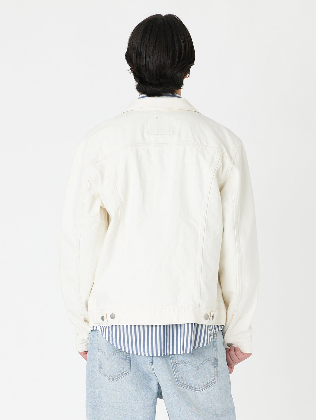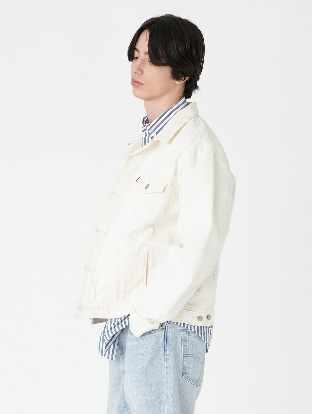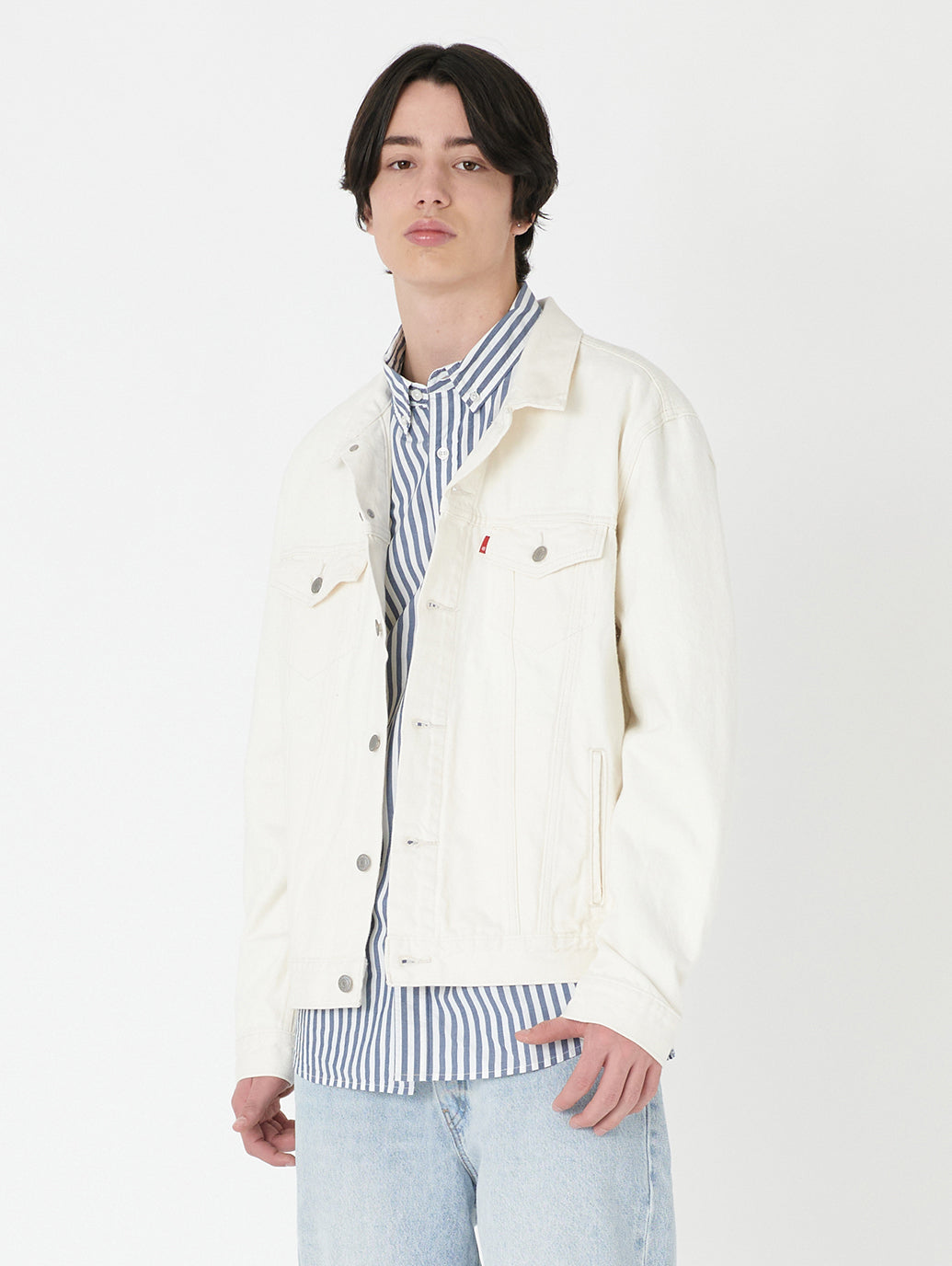 1967年から続くLevi’s®の定番アイテムの一つであるトラッカージャケット。季節や流行問わず長年着用できるようなデザインと、綿100%でしっかりとした生地感で何十年と愛用し、世代から世代へと受け継ぐにふさわしいアイテムです。クリーンな印象のホワイトカラーのボディのフロントに2つのポケット、両サイドにもポケットが施されているので機能性も兼ね備えている一着です。