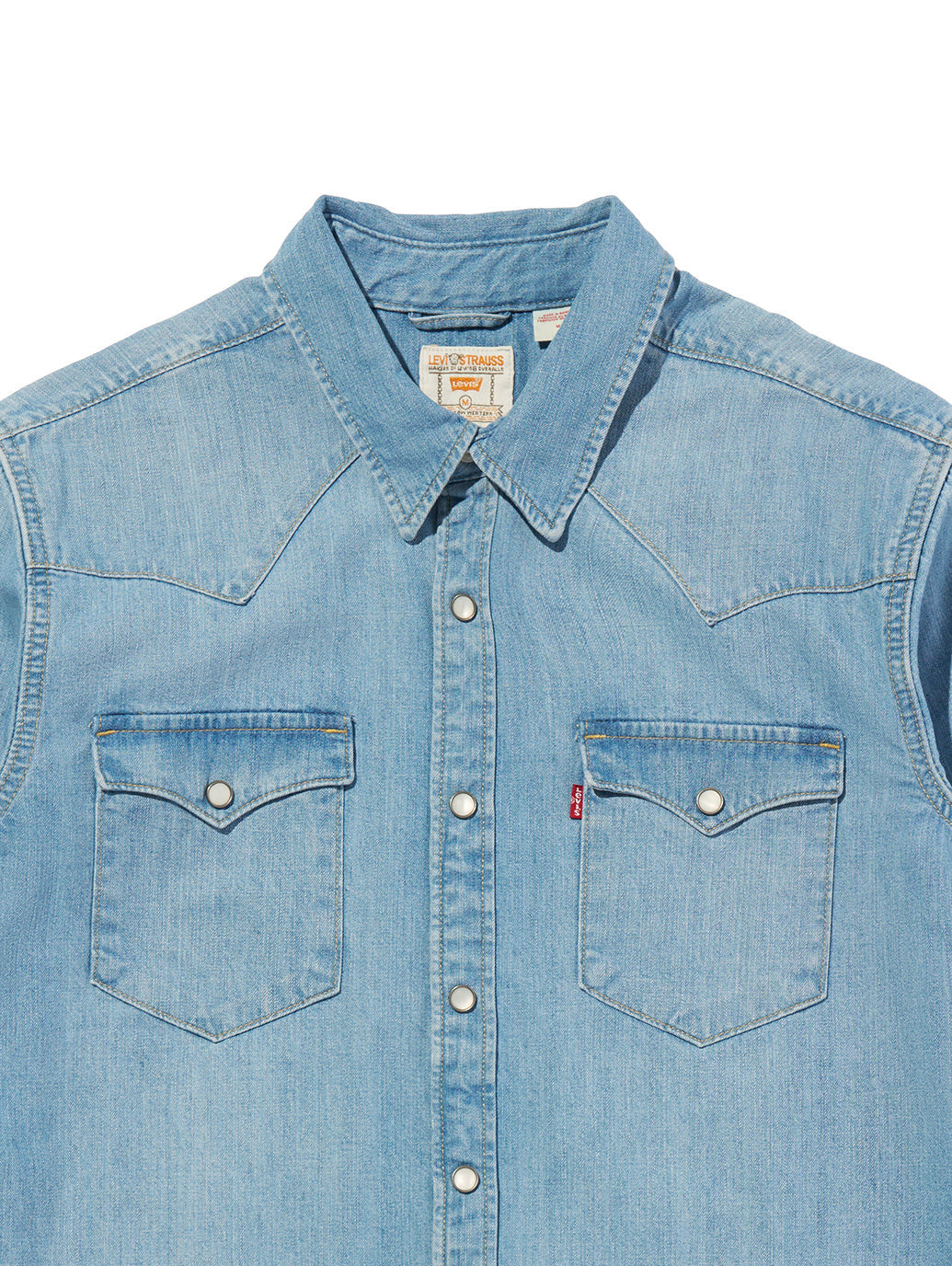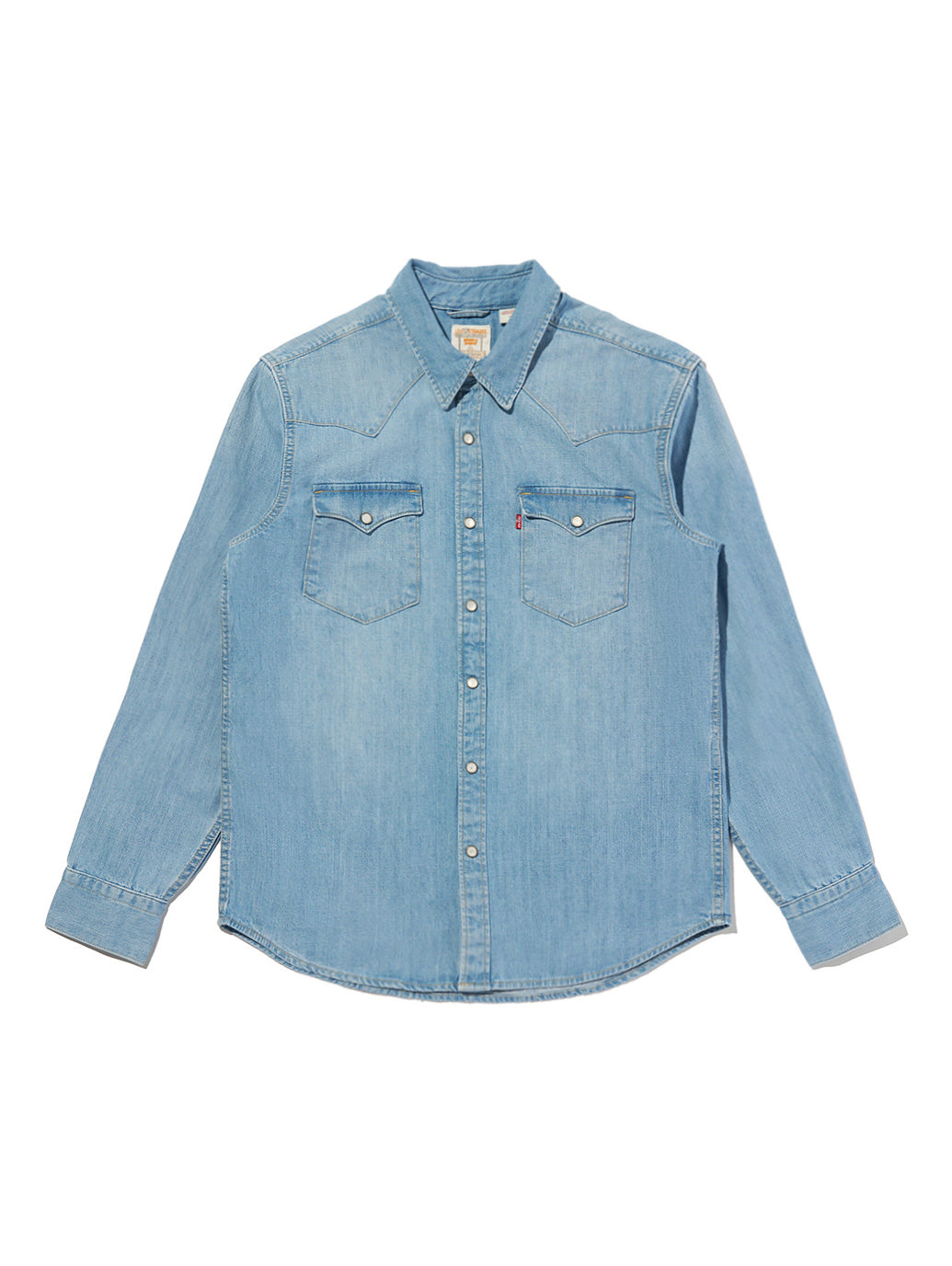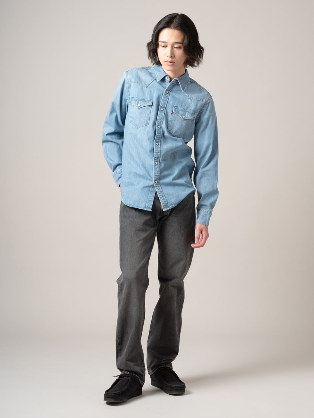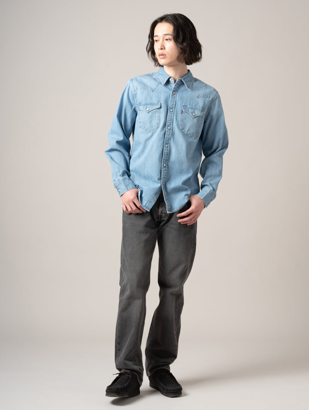 コットン100パーセント、長袖デニムのウエスタンシャツ。オリジナルのウエスタンディテール。オリジナルのウエスタンのディテール。カーブを入れたシャツテールヘム。胸元にはスナップポケットが2つ。アイコニックなレッドタブ付き。 一枚での合わせはもちろん、晩夏~初秋はカーディガンやジャケットと合わせてレイヤードを楽しめます。 冬は厚手のアウターの下に敢えて着るレイヤードスタイルも◎ チノパンやコーデュロイパンツと組み合わせたカジュアルなスタイリングや、デニムオンデニムでセットアップにしてもスッキリまとまります。 レギュラーフィットでクールな印象のスタイリングに仕上がります。 定番アイテムだからこそのどんな洋服にもマッチする一枚。 model:181cm B89 W68 H83 着用サイズ:L