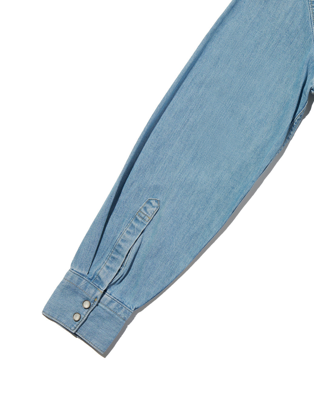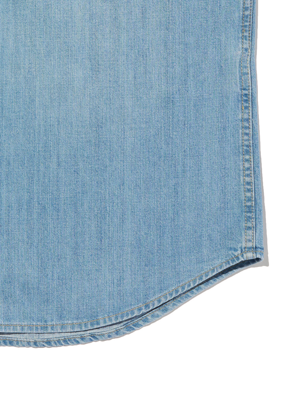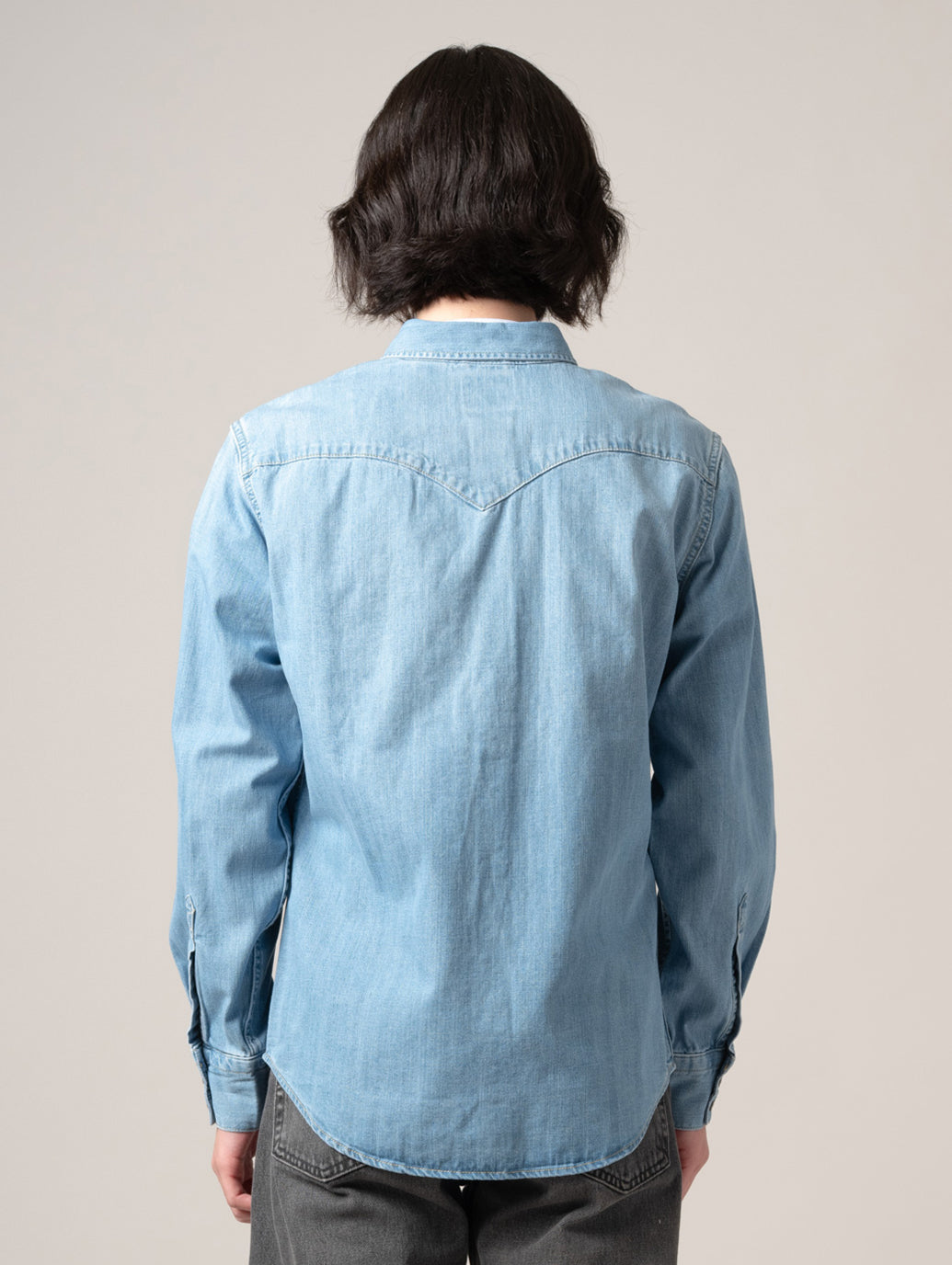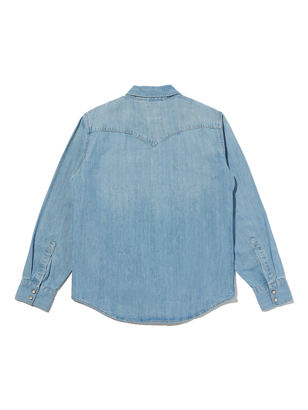 コットン100パーセント、長袖デニムのウエスタンシャツ。オリジナルのウエスタンディテール。オリジナルのウエスタンのディテール。カーブを入れたシャツテールヘム。胸元にはスナップポケットが2つ。アイコニックなレッドタブ付き。 一枚での合わせはもちろん、晩夏~初秋はカーディガンやジャケットと合わせてレイヤードを楽しめます。 冬は厚手のアウターの下に敢えて着るレイヤードスタイルも◎ チノパンやコーデュロイパンツと組み合わせたカジュアルなスタイリングや、デニムオンデニムでセットアップにしてもスッキリまとまります。 レギュラーフィットでクールな印象のスタイリングに仕上がります。 定番アイテムだからこそのどんな洋服にもマッチする一枚。 model:181cm B89 W68 H83 着用サイズ:L