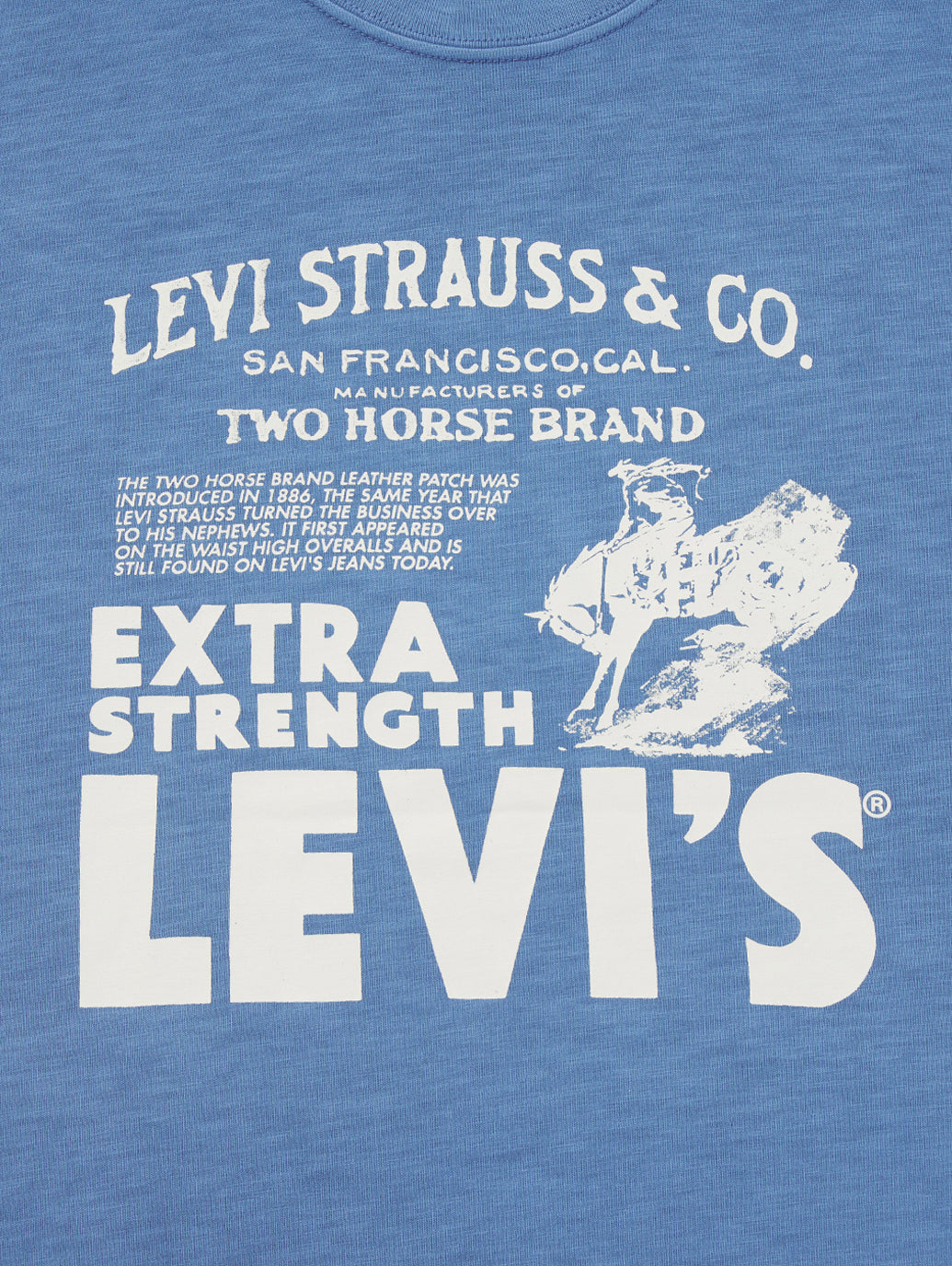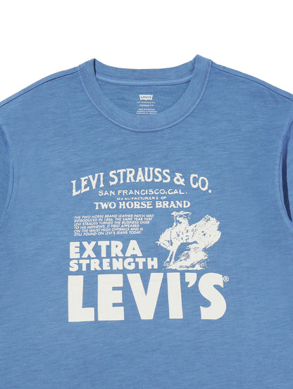 ゆったりとしたリラックスシルエットのTシャツ。ブルーカラーのボディにカウボーイがプリントされたデザインです。流行りのリンスカラーのジーンズやワークパンツと合わせていただきたい一枚です。
