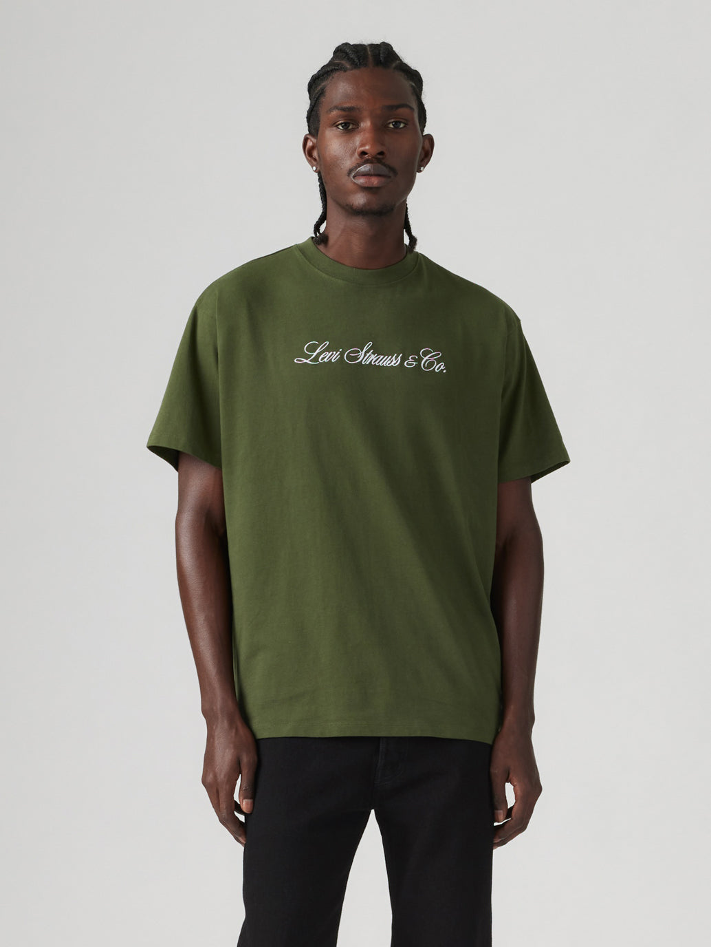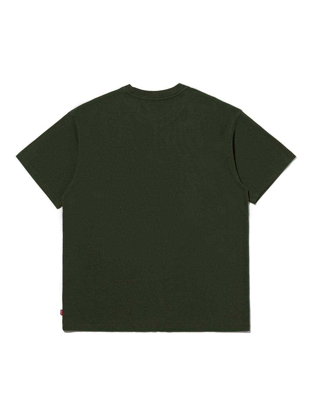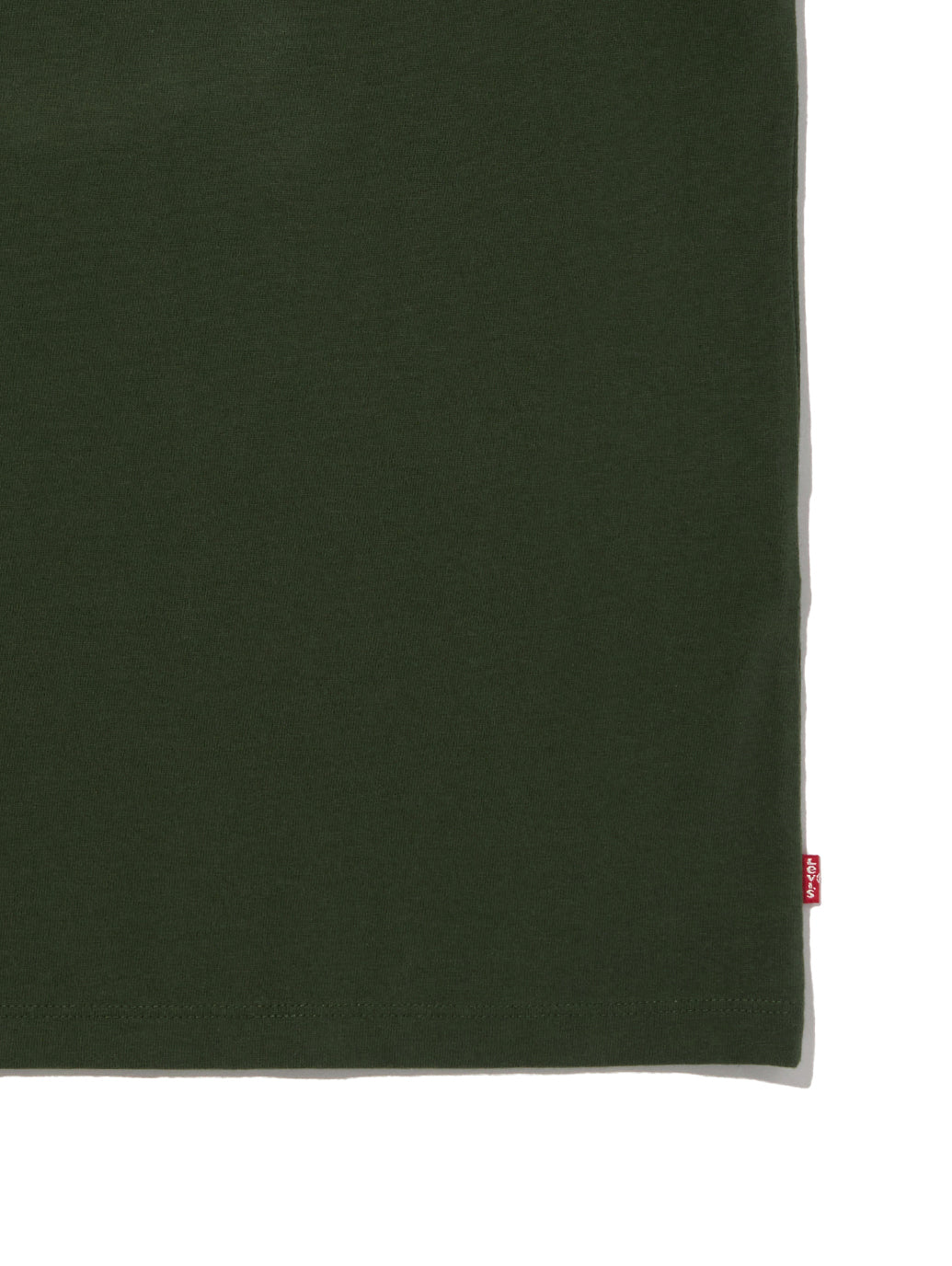 ゆったりとしたリラックスシルエットのTシャツ。グリーンカラーのボディにリーバイスロゴがプリントされたデザインです。流行りのリンスカラーのジーンズやワークパンツと合わせていただきたい一枚です。