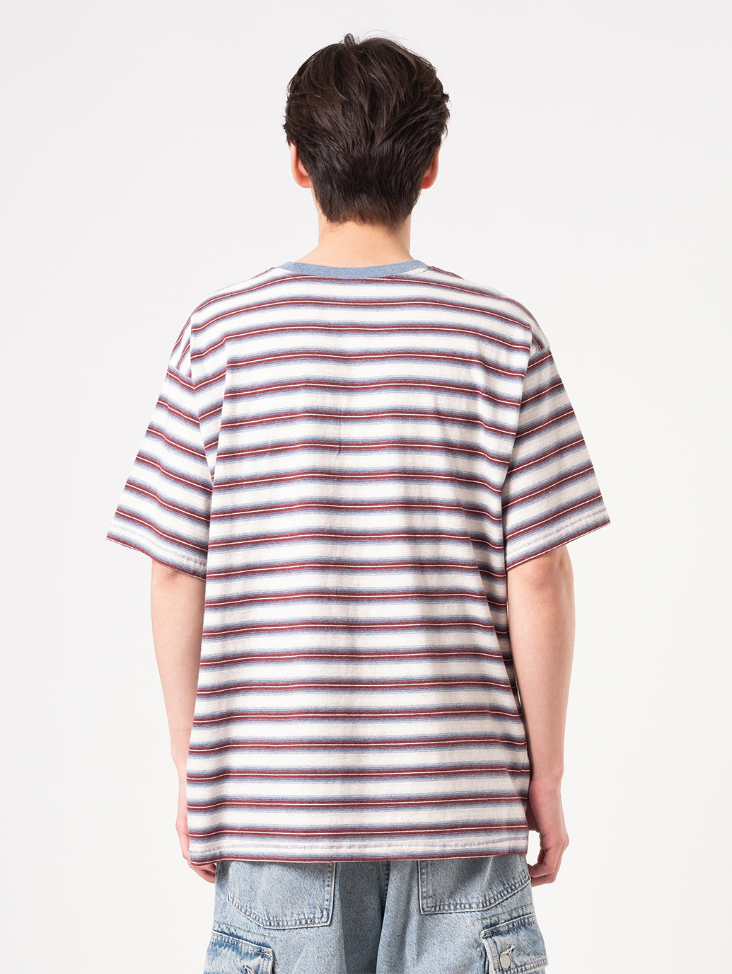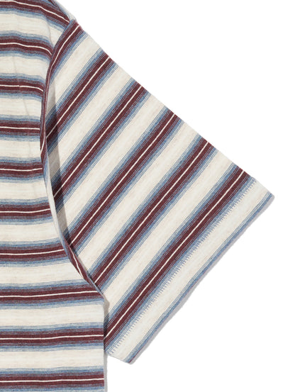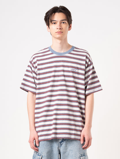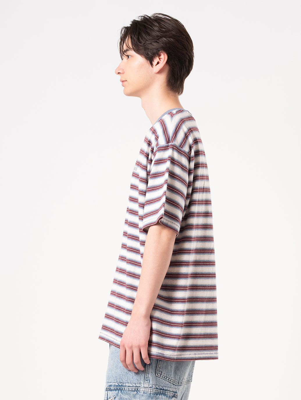 ストライプ柄で胸元にさりげなくロゴをあしらった夏にマストアイテムのTシャツ。ドロップショルダーのボクシーなシルエット。綿100%の柔らかいコットン素材。お気に入りのパンツに合わせて頂きたいアイテムの一つです。