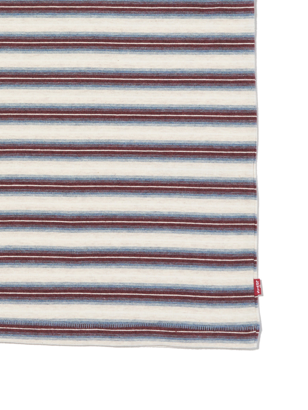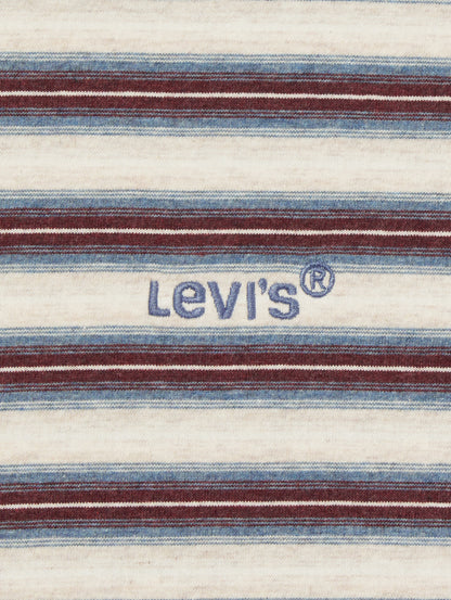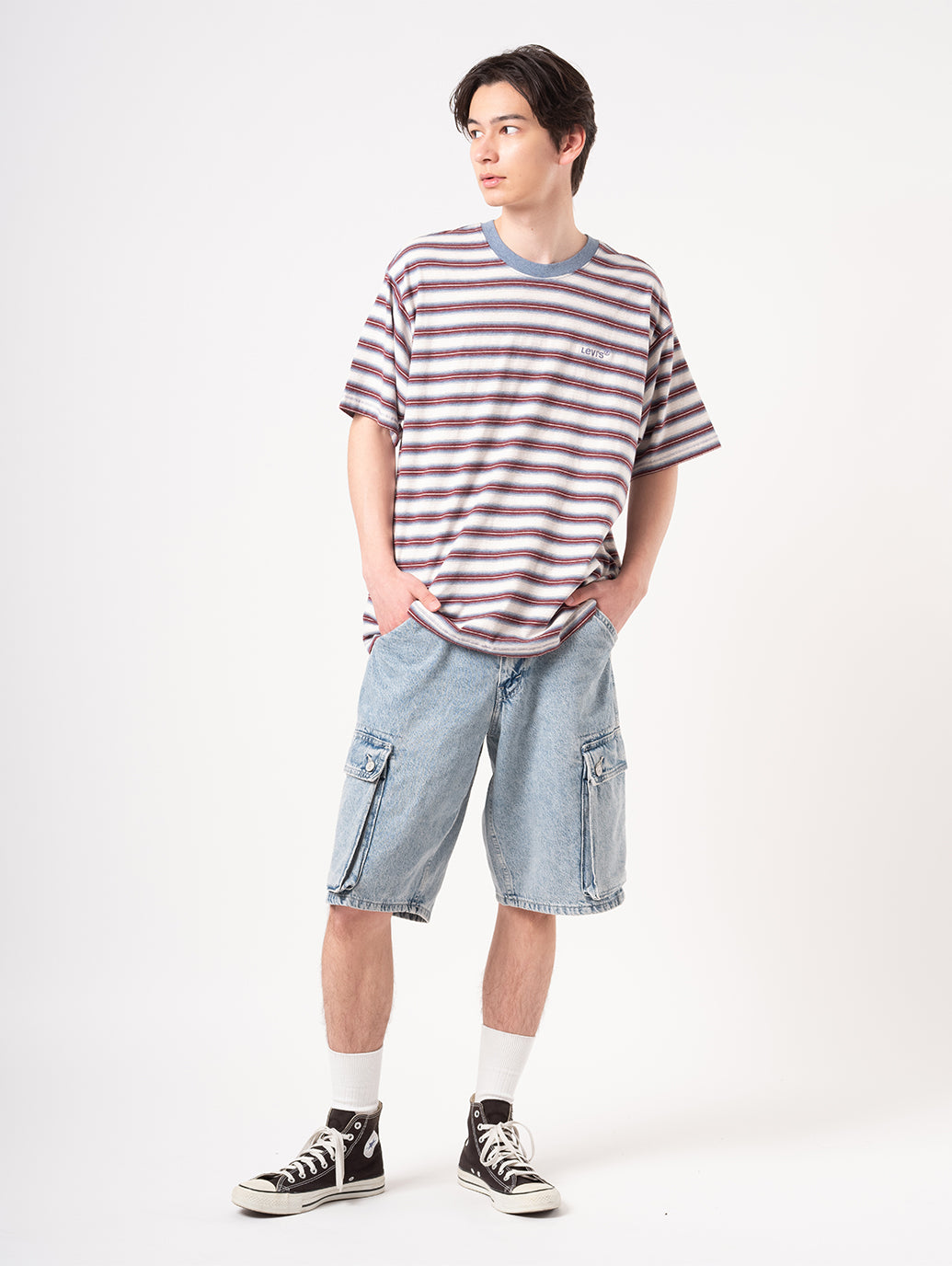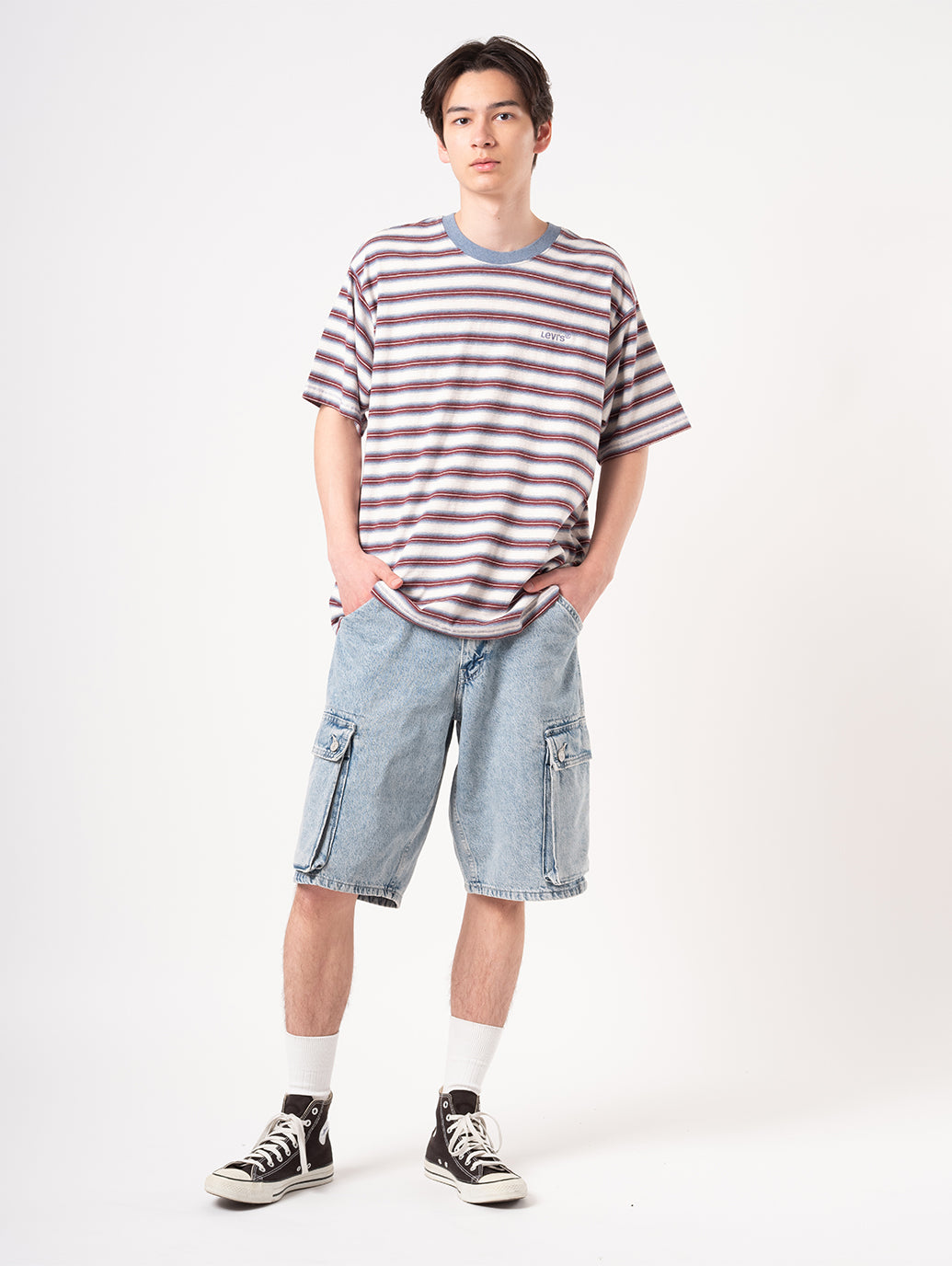 ストライプ柄で胸元にさりげなくロゴをあしらった夏にマストアイテムのTシャツ。ドロップショルダーのボクシーなシルエット。綿100%の柔らかいコットン素材。お気に入りのパンツに合わせて頂きたいアイテムの一つです。