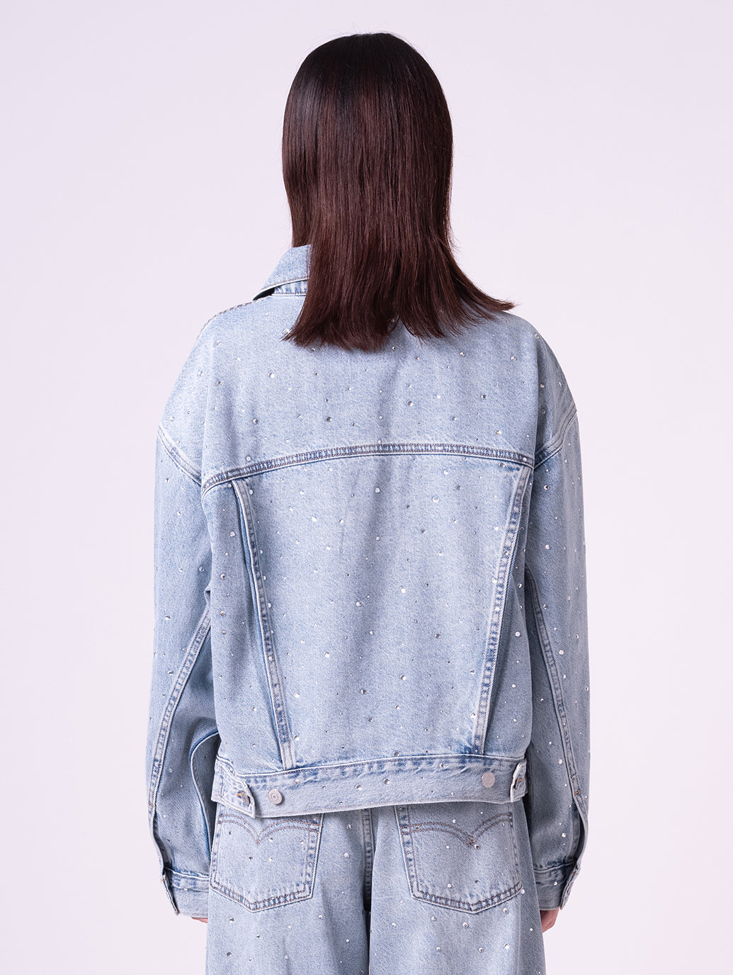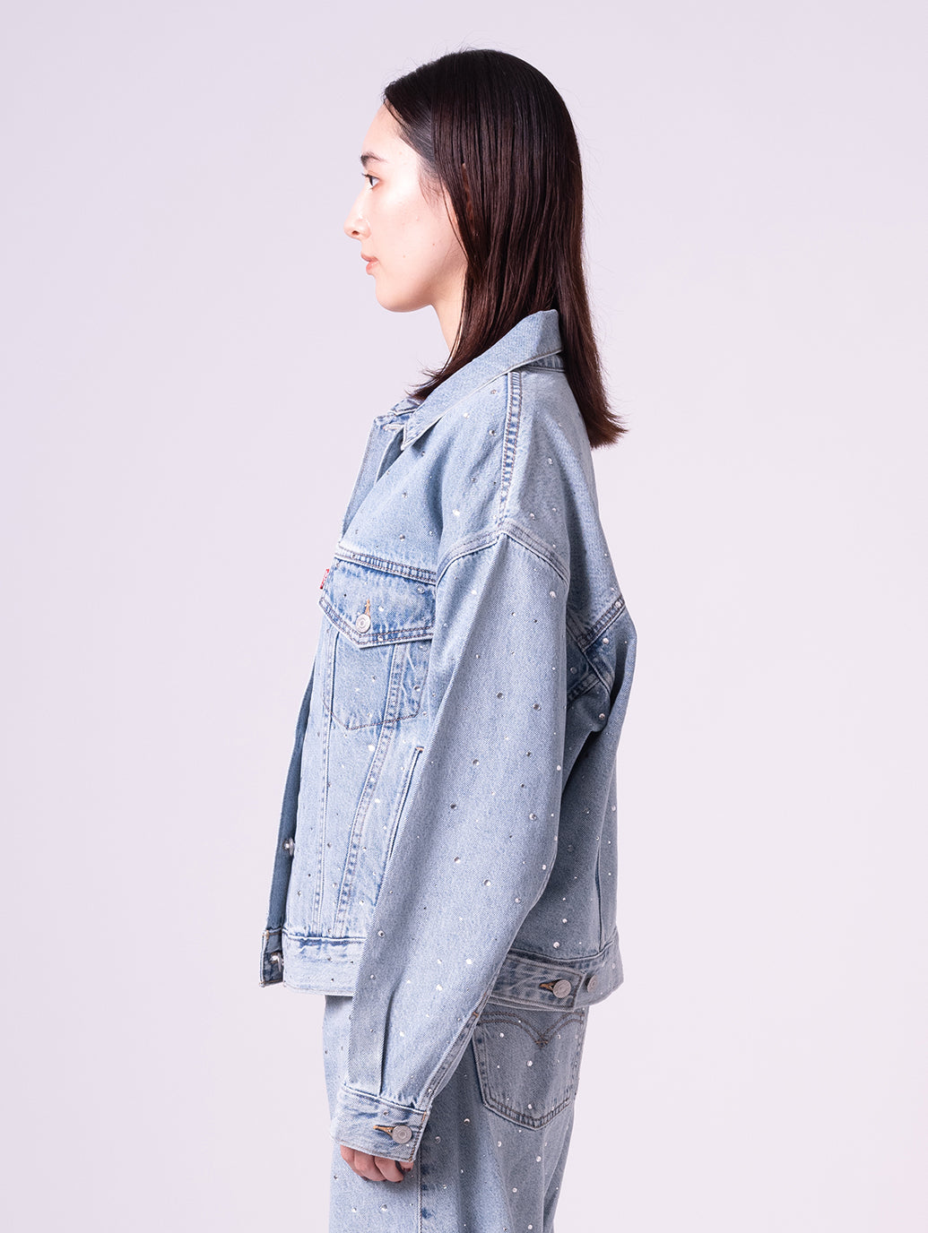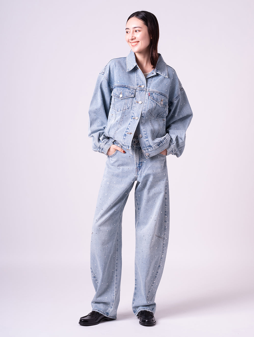 シンプルなシェイプで、着やすいウェイトまわりのデザインのデニムジャケット。ボディラインに沿ったレトロなカットのシルエットが90年代風の雰囲気を演出します。同じカラーのボトムスと合わせてセットアップが完成します。