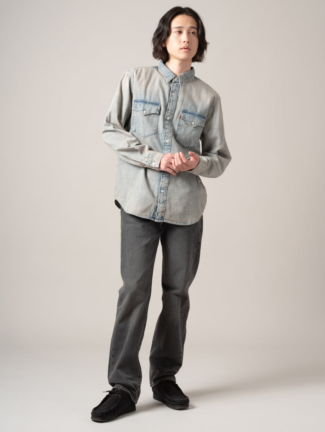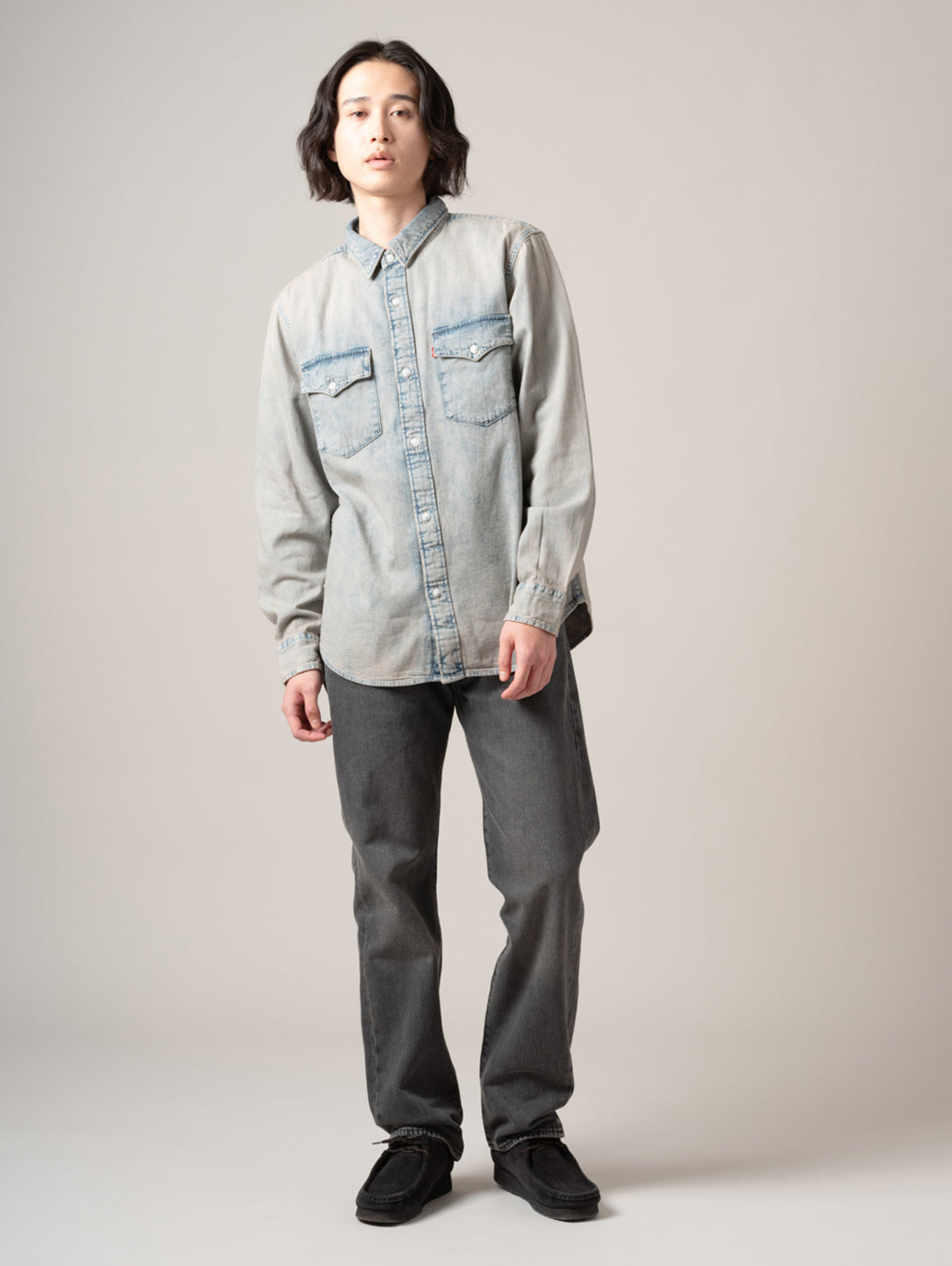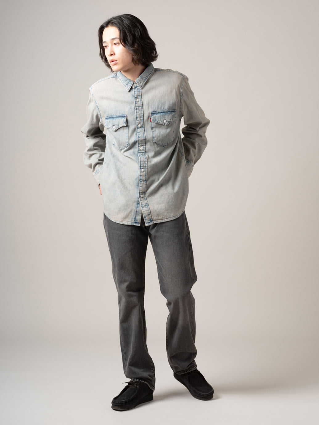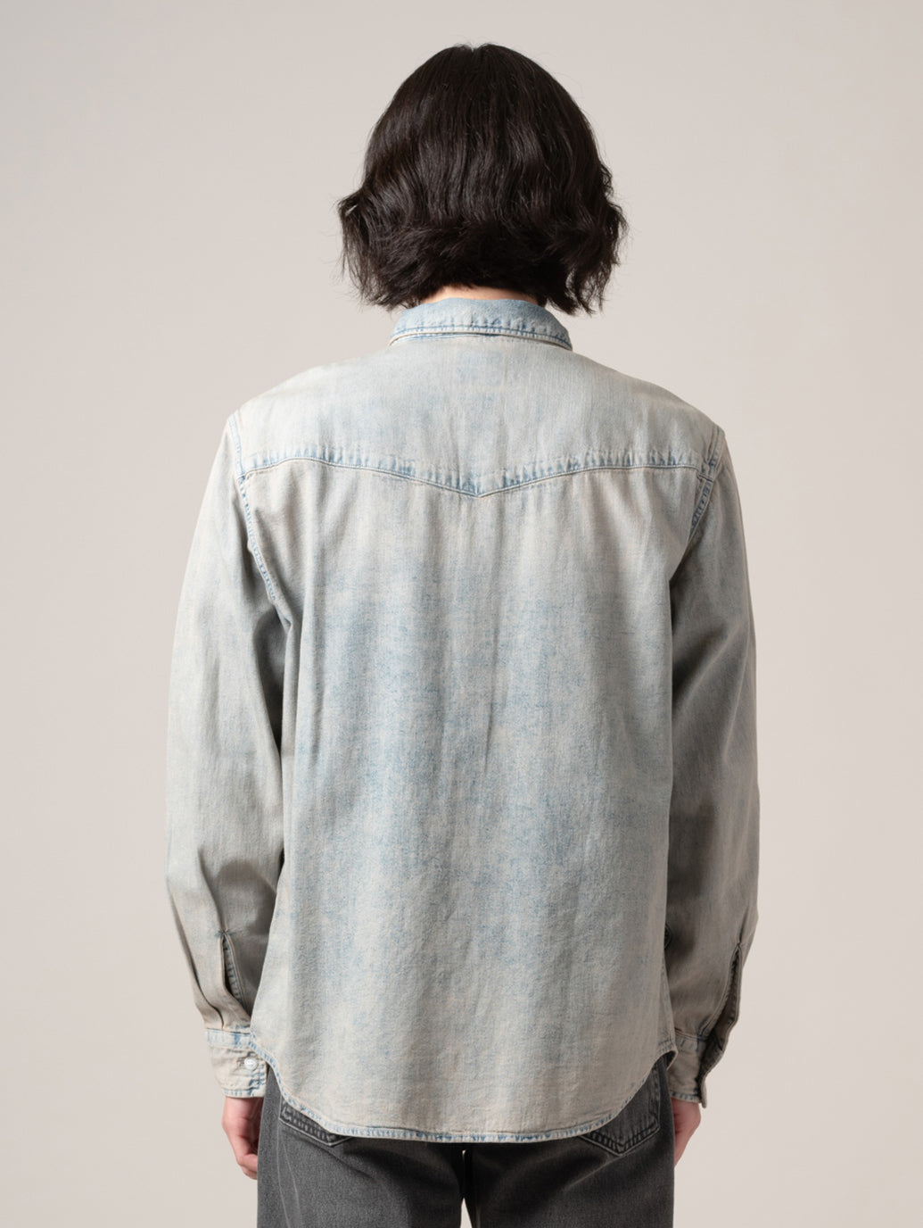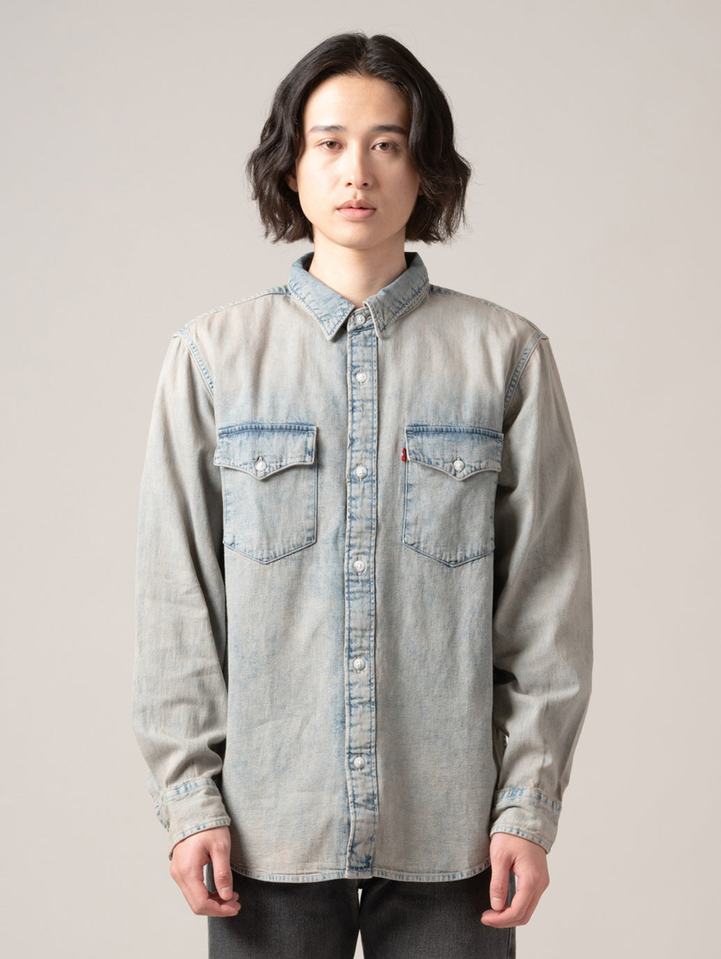 Levi's®の定番アイテムの一つであるウエスタンシャツを現代的にアレンジしたリラックスフィットのウエスタンシャツ。爽やかで涼しげな印象を与えてくれるライトカラーのボディに衿部部のみベージュカラーの切り替えしのデザインでTシャツやスウェットの上に羽織るアイテムとして活躍する一着です。 model:181cm B89 W68 H83 着用サイズ:L