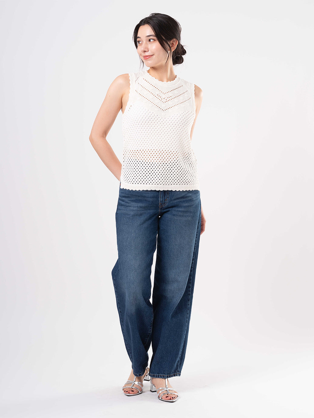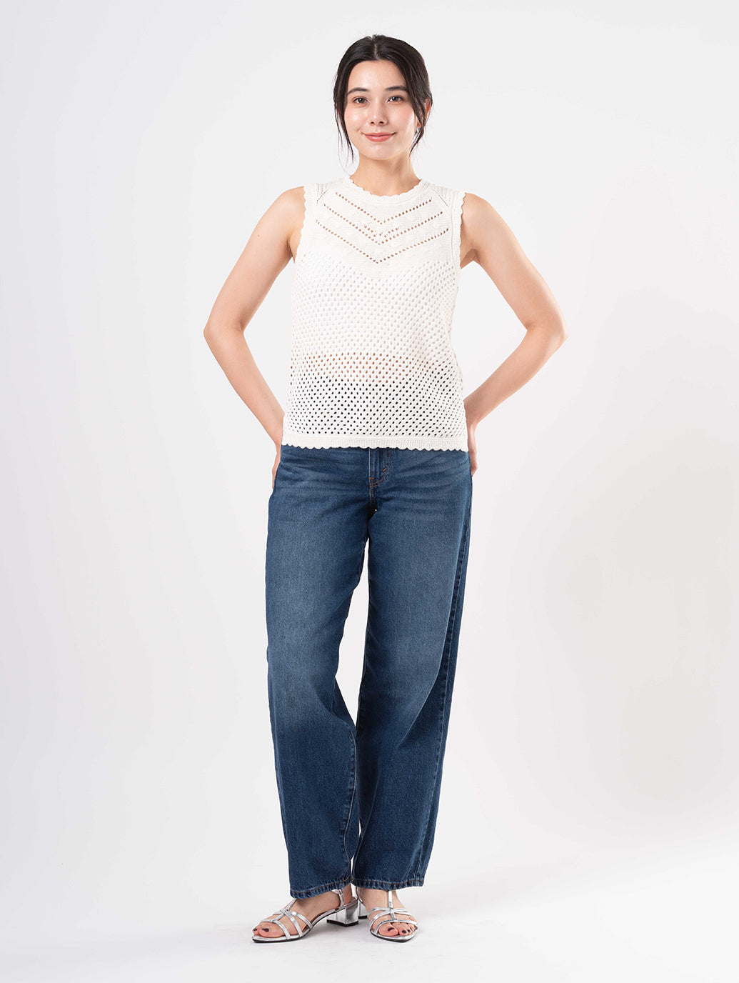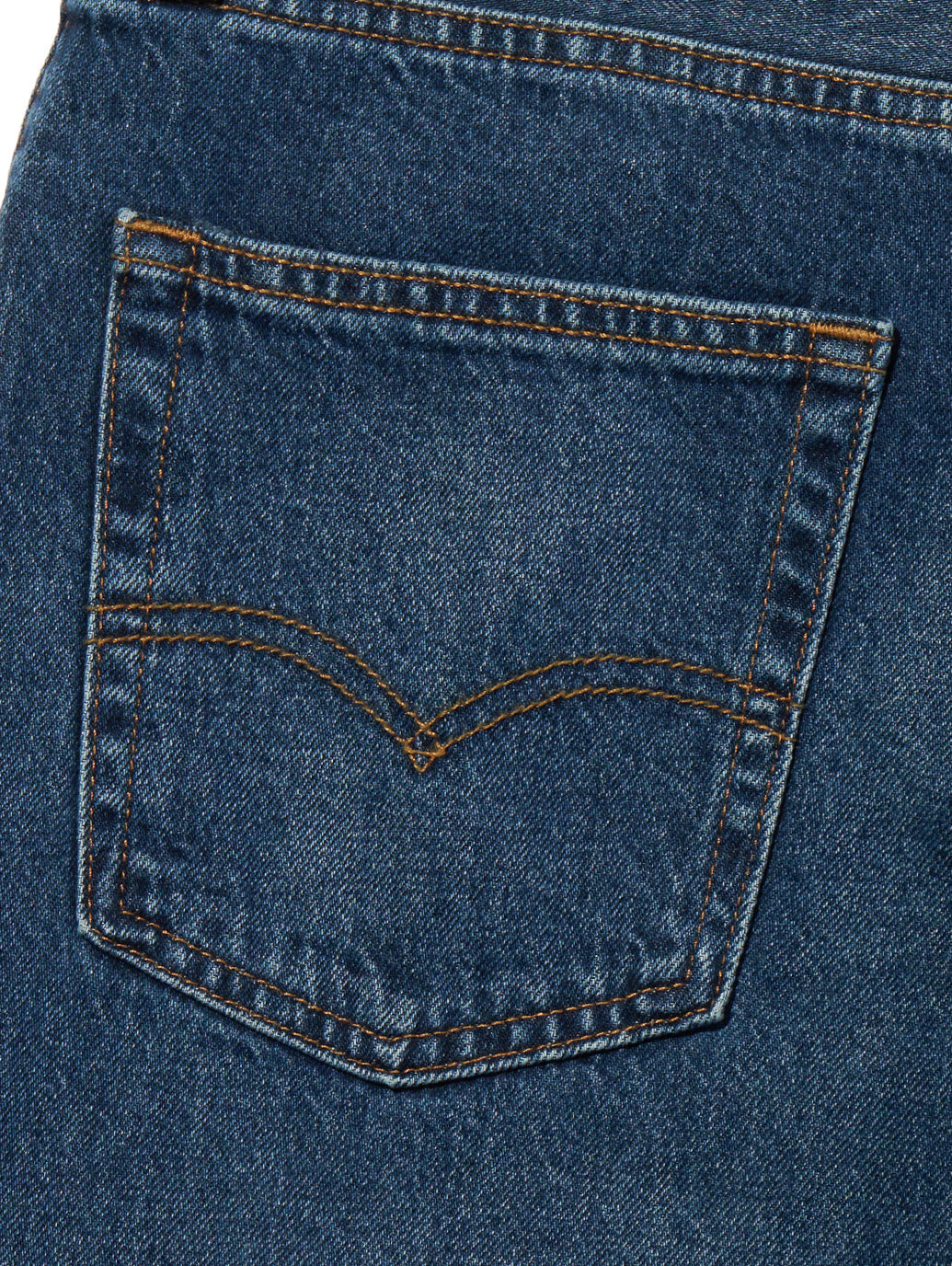 綿100%のリラックス感あふれるミッドライズストレートフィットは、ゆったりしながらも美しいシルエットをキープ。ダークインディゴの深みのある色味に、さりげない色落ち加工を施し、こなれた抜け感を演出。