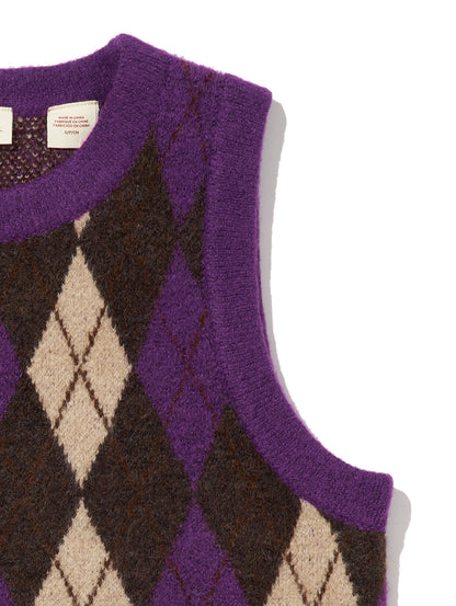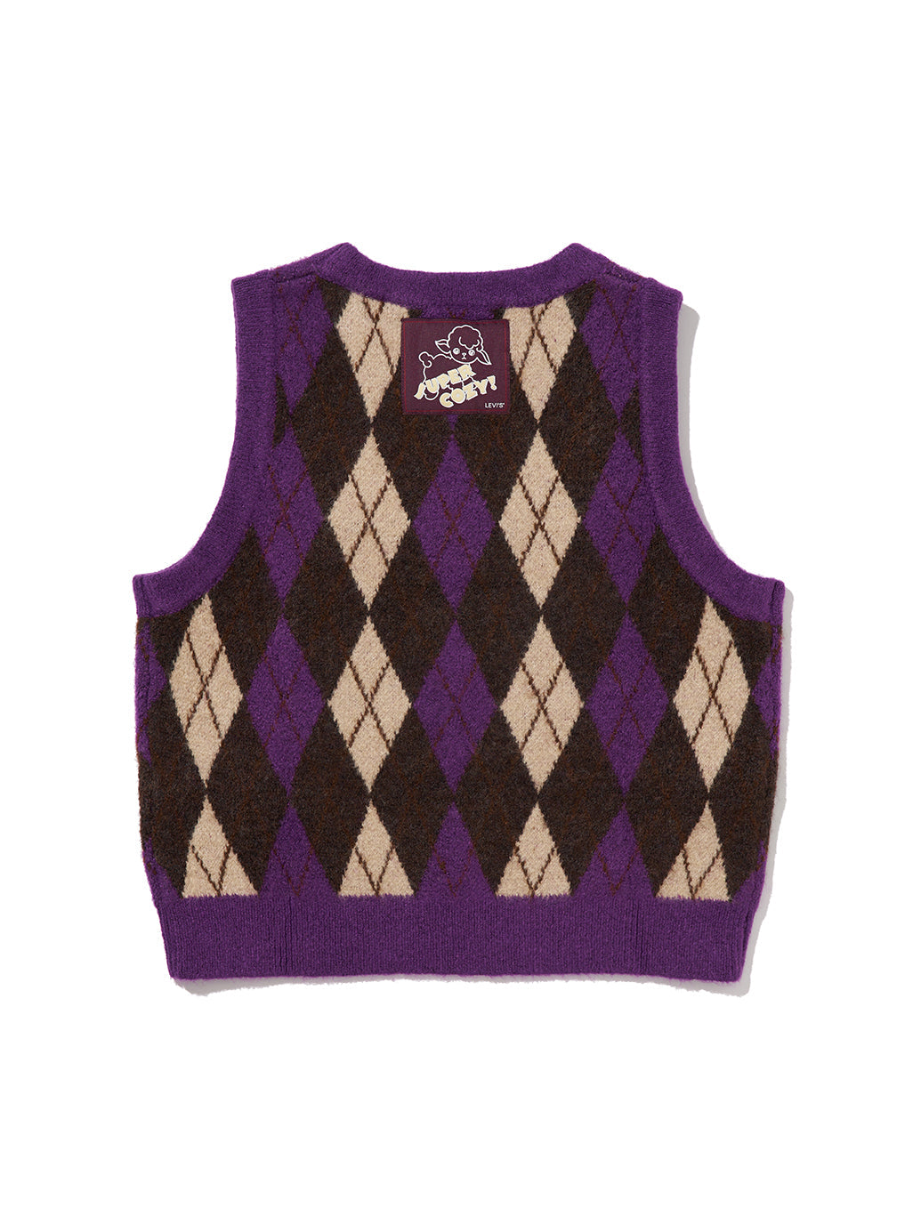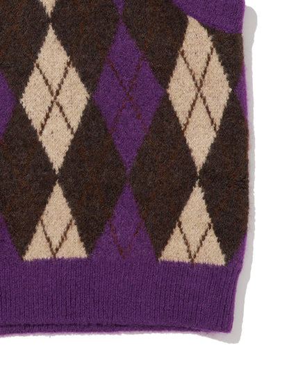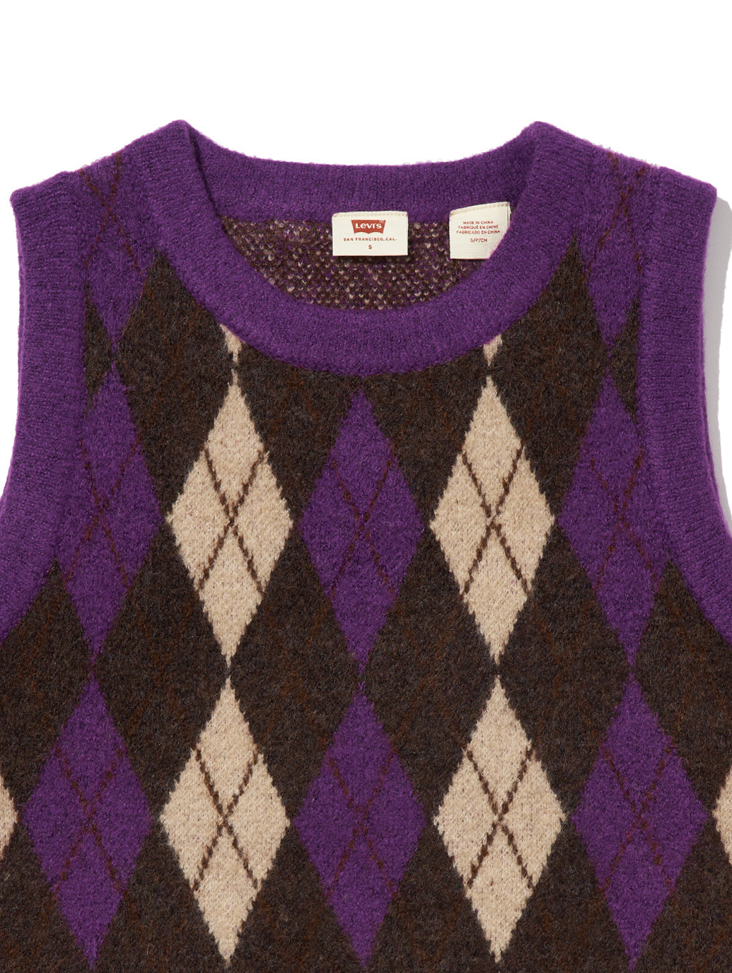 アーガイル柄が目を引くクラシックなベスト。アクリルとポリエステルを使用しており、いつまでも触っていたくなるようなソフトな素材で着心地も抜群です。どんなデニムとも相性抜群の一枚です。