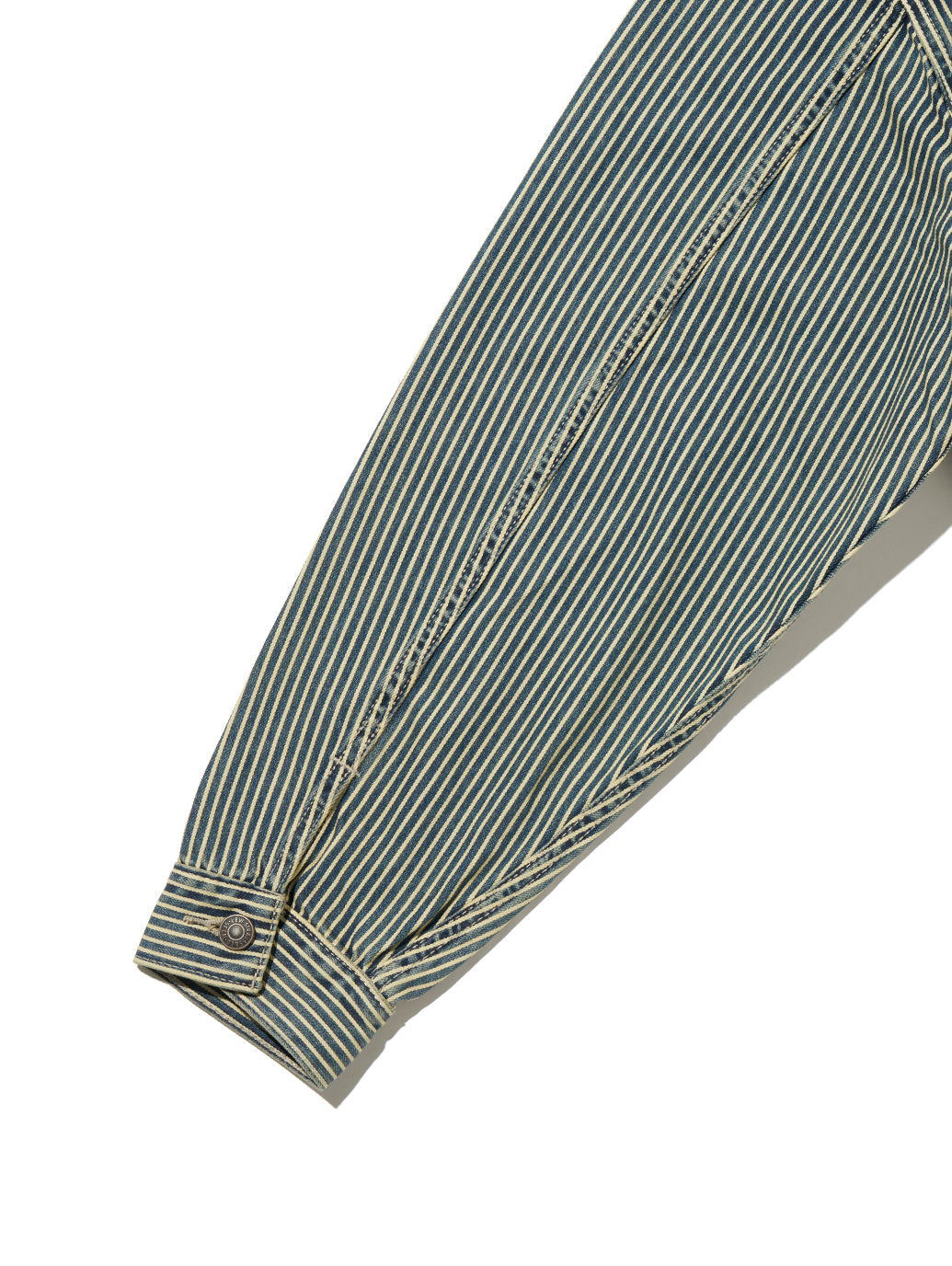 クラシックなワークウェアの要素を落とし込んだヴィンテージ風のジャケット。ヒッコリーストライプ柄のゆったりとしたボクシーなリラックスシルエット。フロントに計4つのポケットを配し、機能性も十分なデザインです。春先の羽織ものとしては勿論一年通して活躍する一着です。