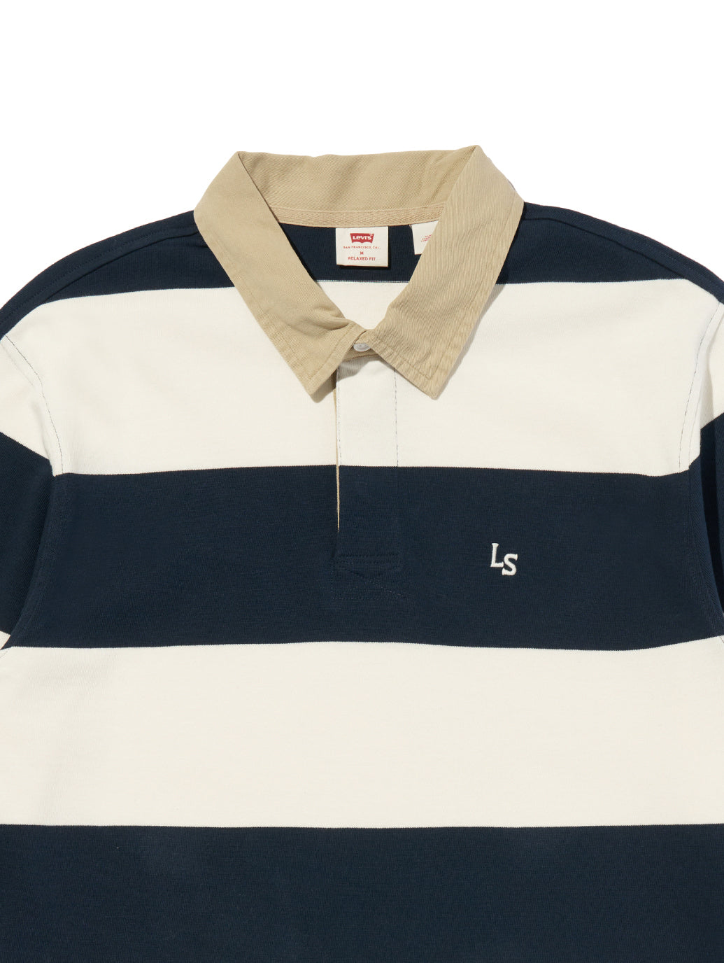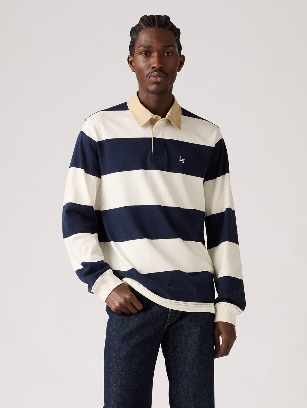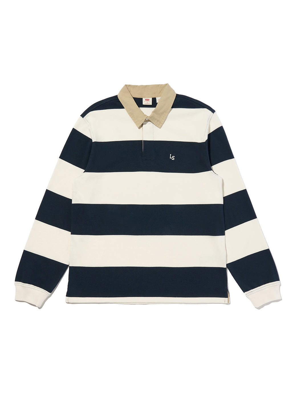 スポーティなLevi'sのラグビーシャツ。リラックスフィットのボタンアップカラー、どこかレトロな雰囲気を感じさせる配色のクラシックストライプのデザインです。アウターのインナーとして、春先には一枚でも活躍する一着です。
