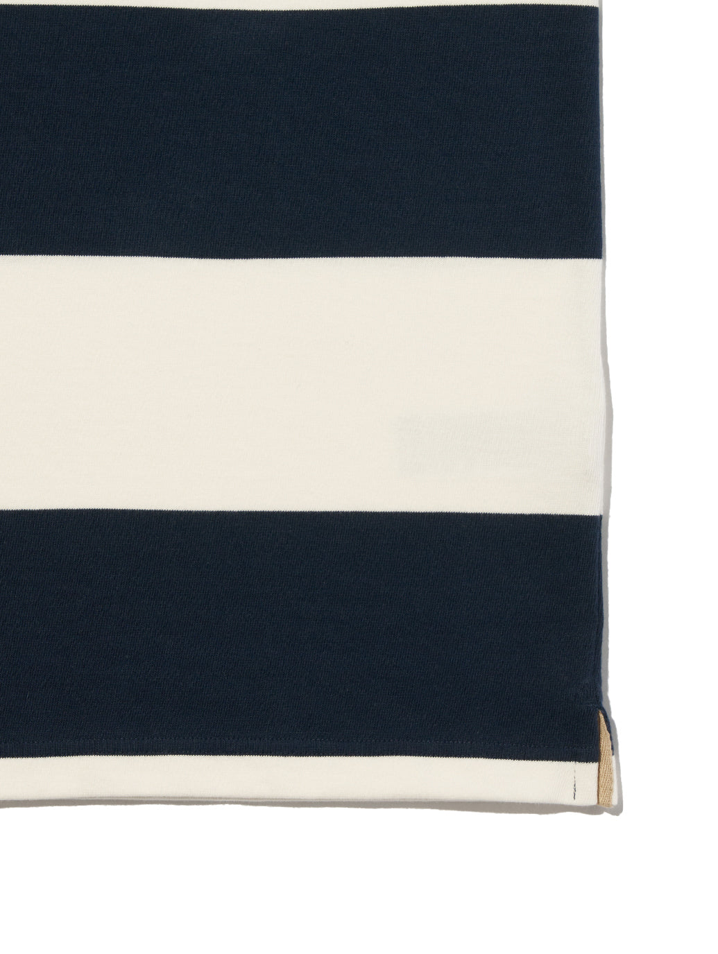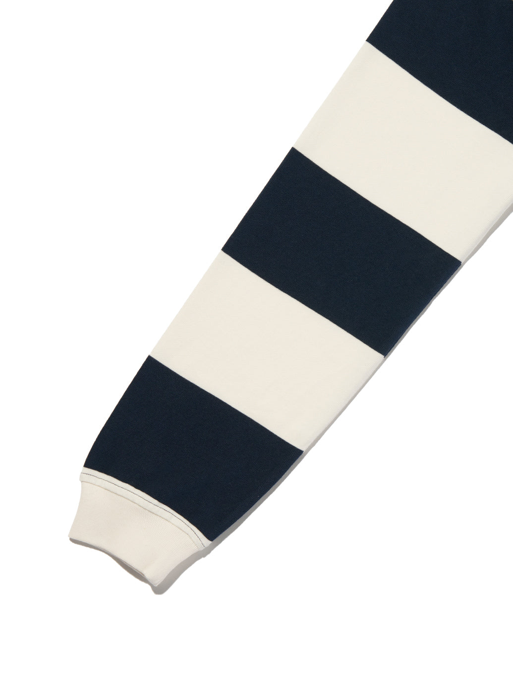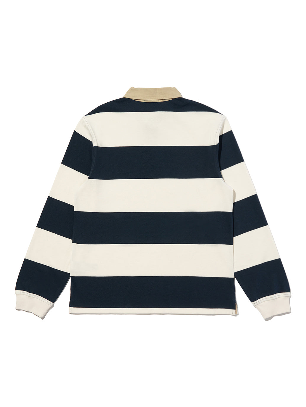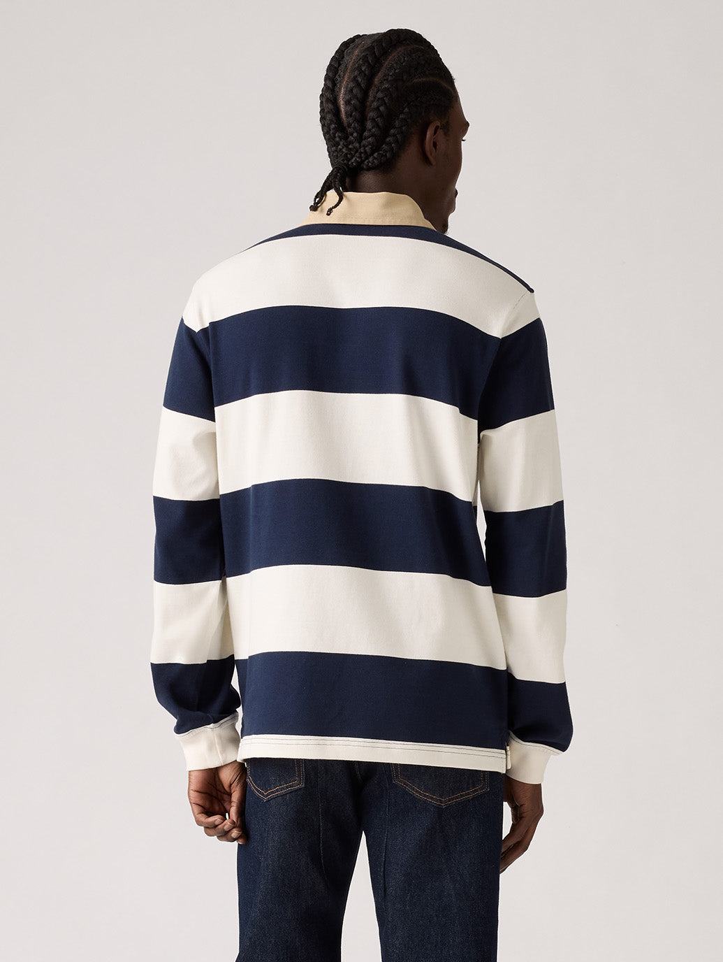 スポーティなLevi'sのラグビーシャツ。リラックスフィットのボタンアップカラー、どこかレトロな雰囲気を感じさせる配色のクラシックストライプのデザインです。アウターのインナーとして、春先には一枚でも活躍する一着です。