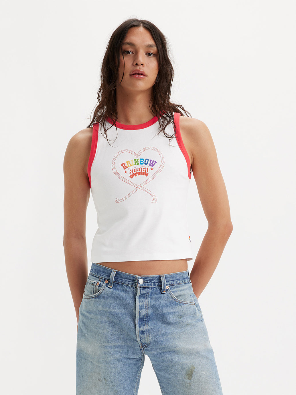 リラックスした雰囲気のアメリカンタンクトップ。フロントに当コレクションの象徴でもあるレインボーのグラフィックを施したアイテムです。サイドにあしらったレインボーカラーのタブもポイントです。