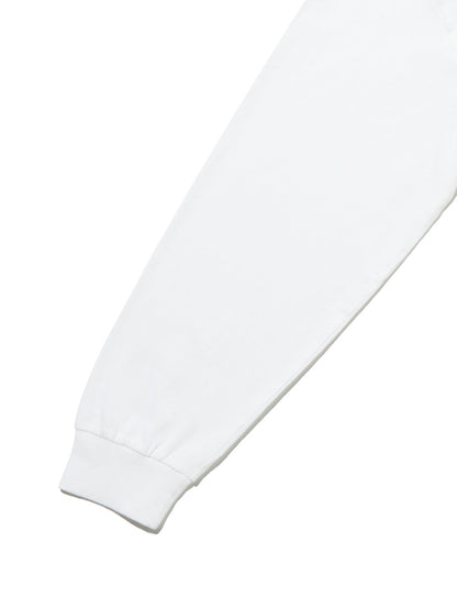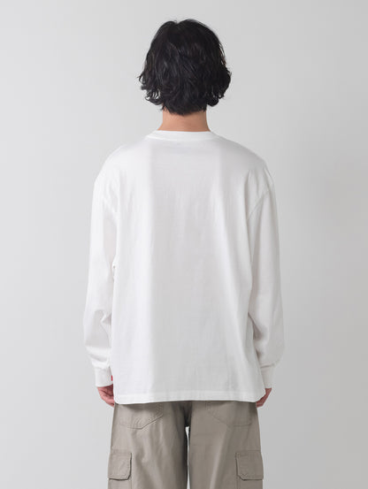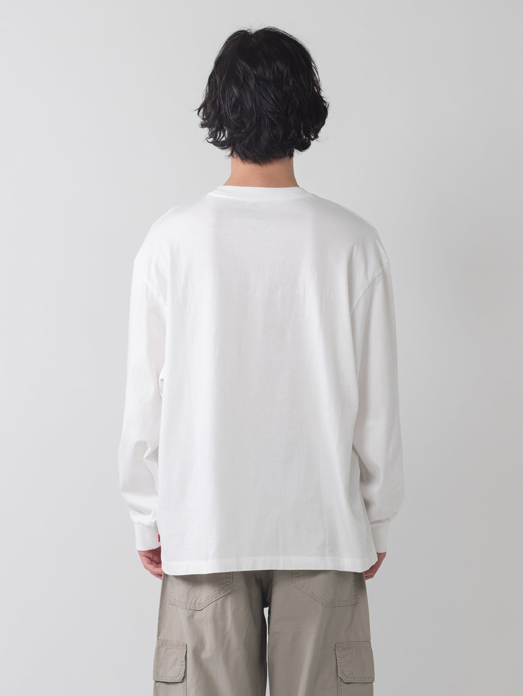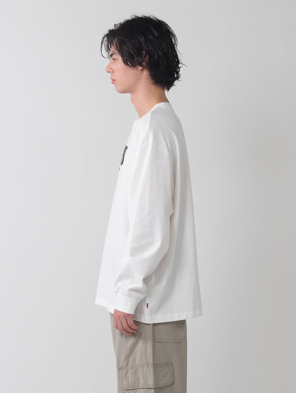 ゆったりとしたリラックスフィットを採用したのホワイトカラーボディのロングスリーブTシャツ。フロントにロゴをあしらったシンプルなデザインです。秋冬シーズンはインナーして、春先には一枚で活躍するアイテムです。