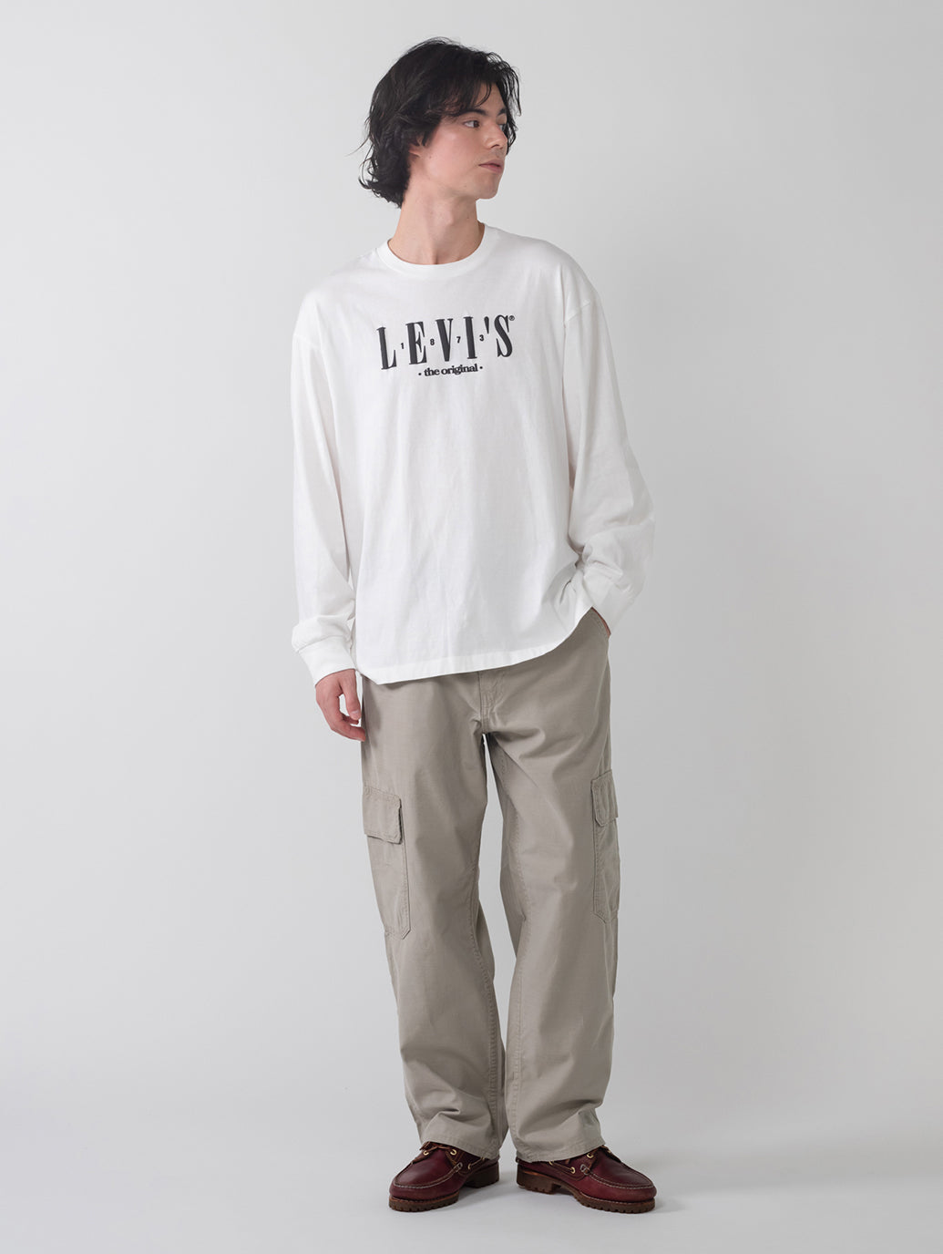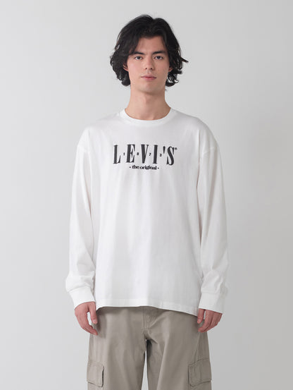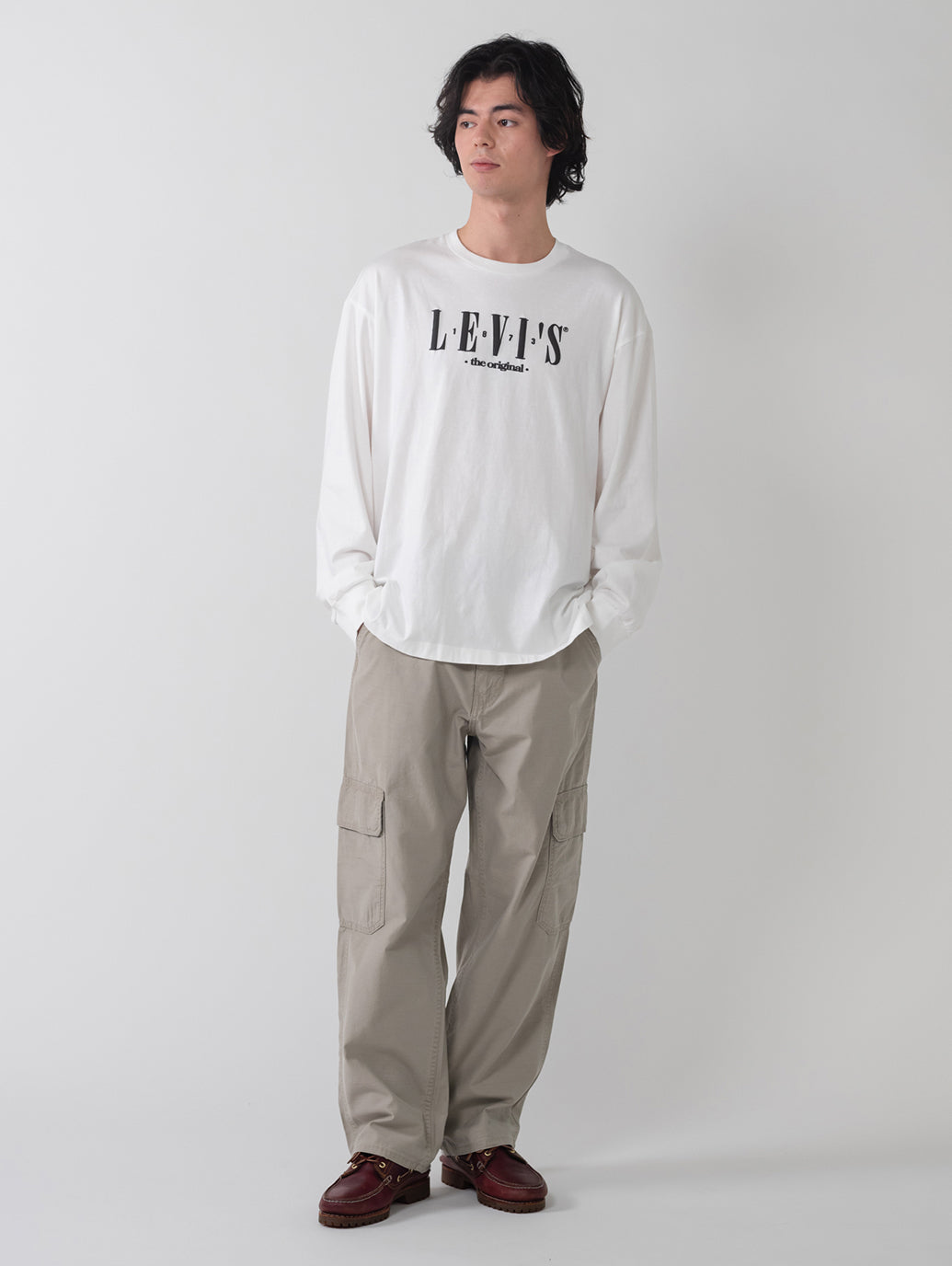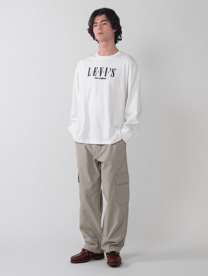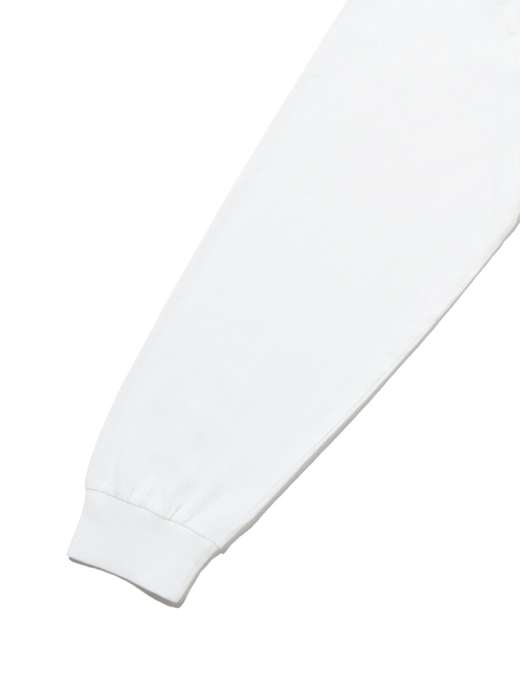 ゆったりとしたリラックスフィットを採用したのホワイトカラーボディのロングスリーブTシャツ。フロントにロゴをあしらったシンプルなデザインです。秋冬シーズンはインナーして、春先には一枚で活躍するアイテムです。