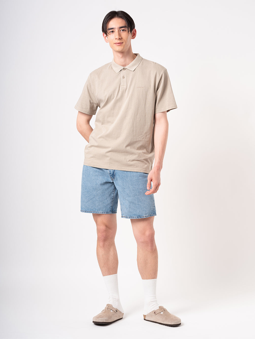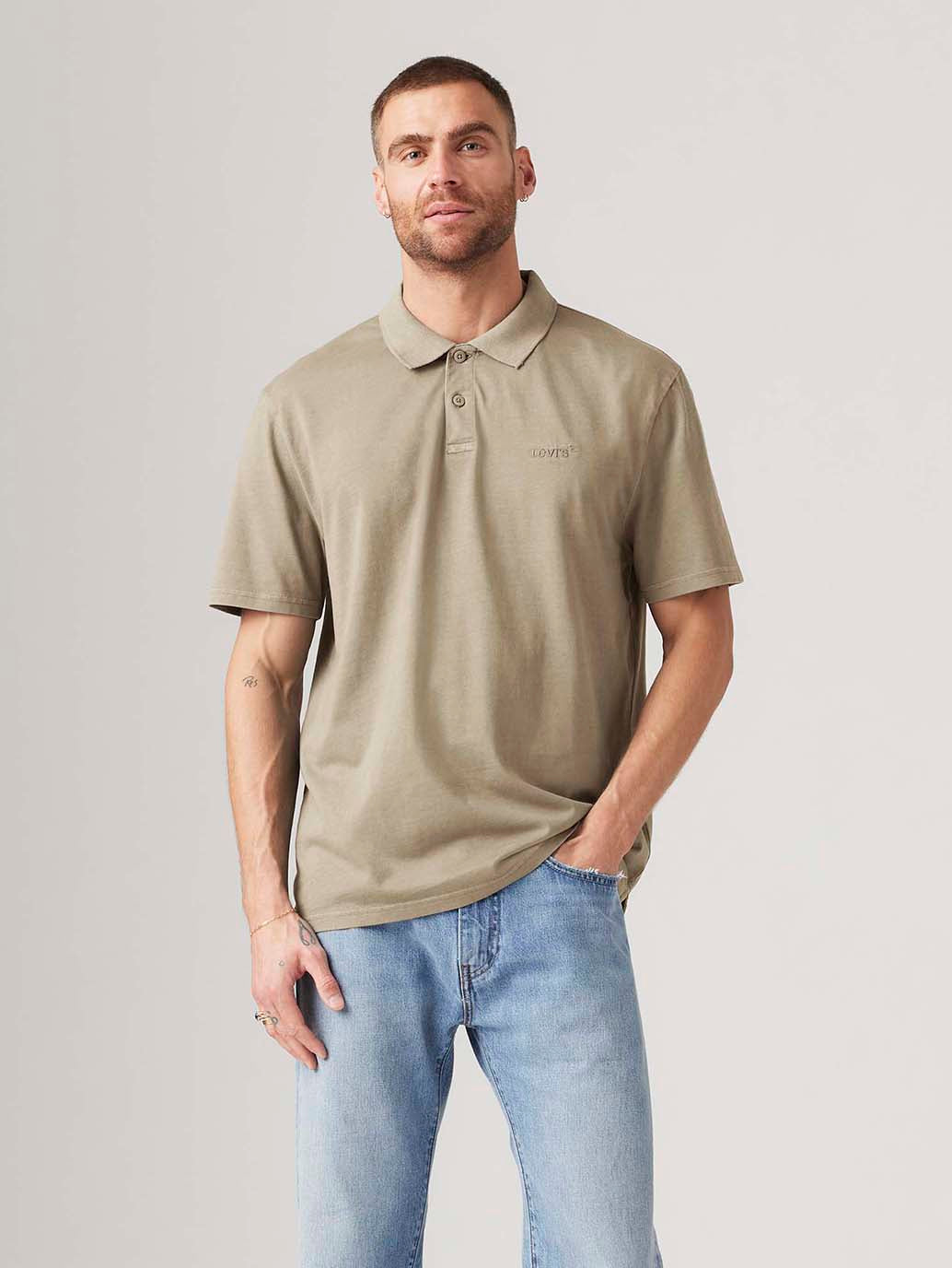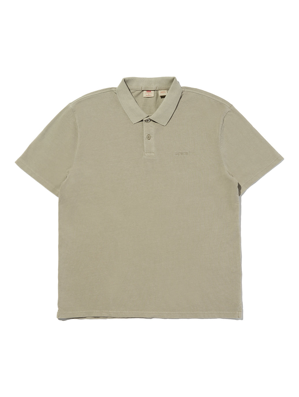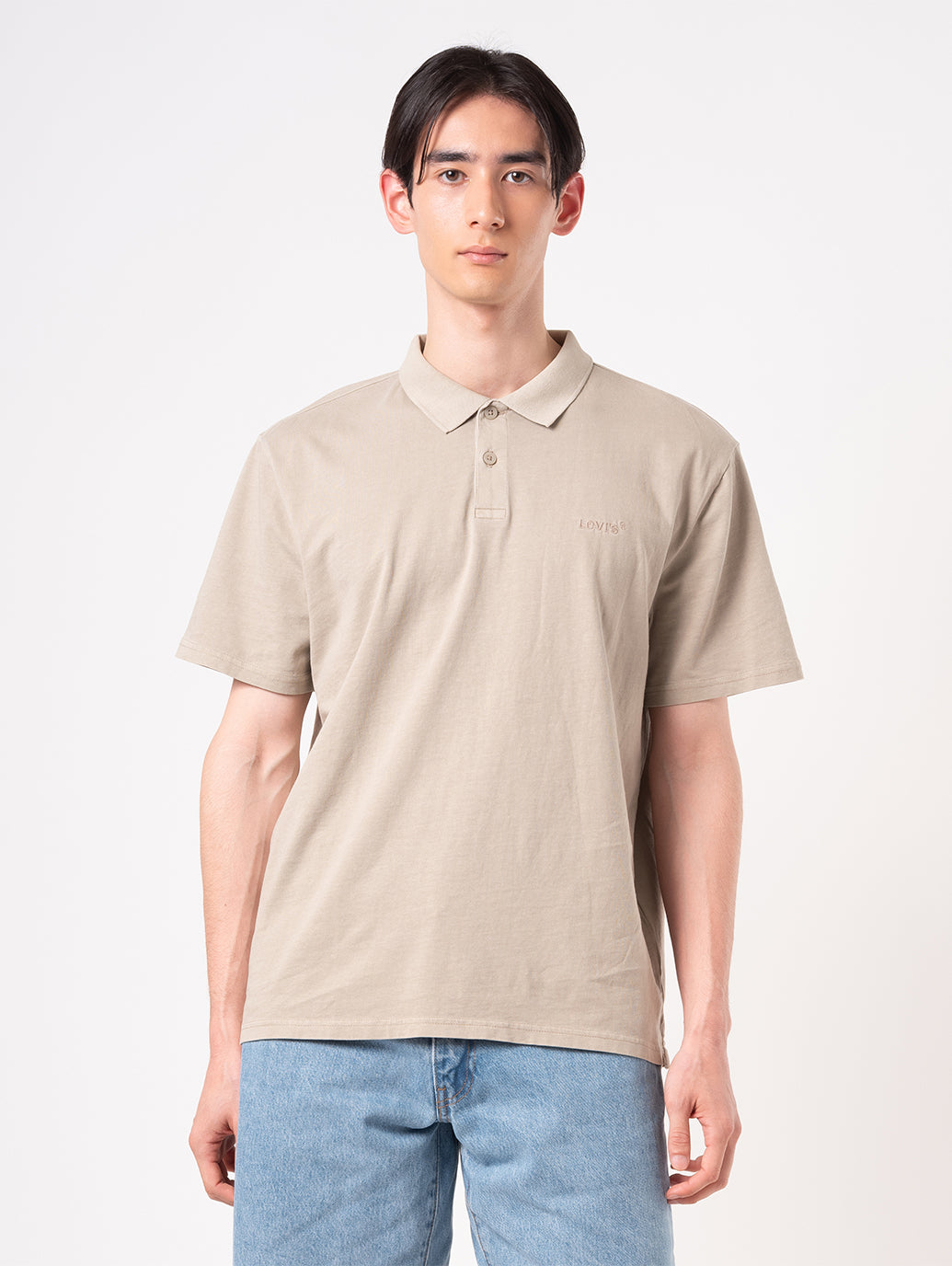 胸に同色でLevi's®ロゴが刺繍された洗いをかけたようなカーキカラーのポロシャツ。綿100%でしっかりとした生地。春先から暖かくなる時期にホワイトパンツやチノパンツに合わせていただきたい一枚です。