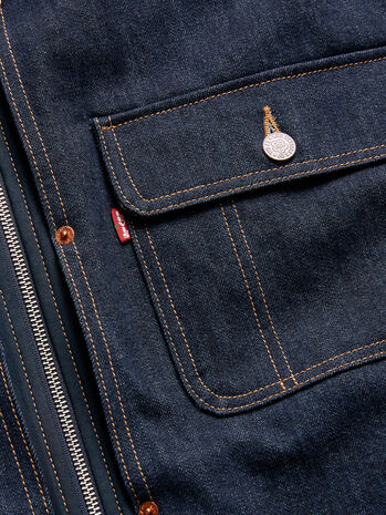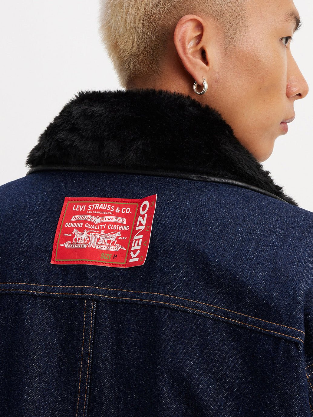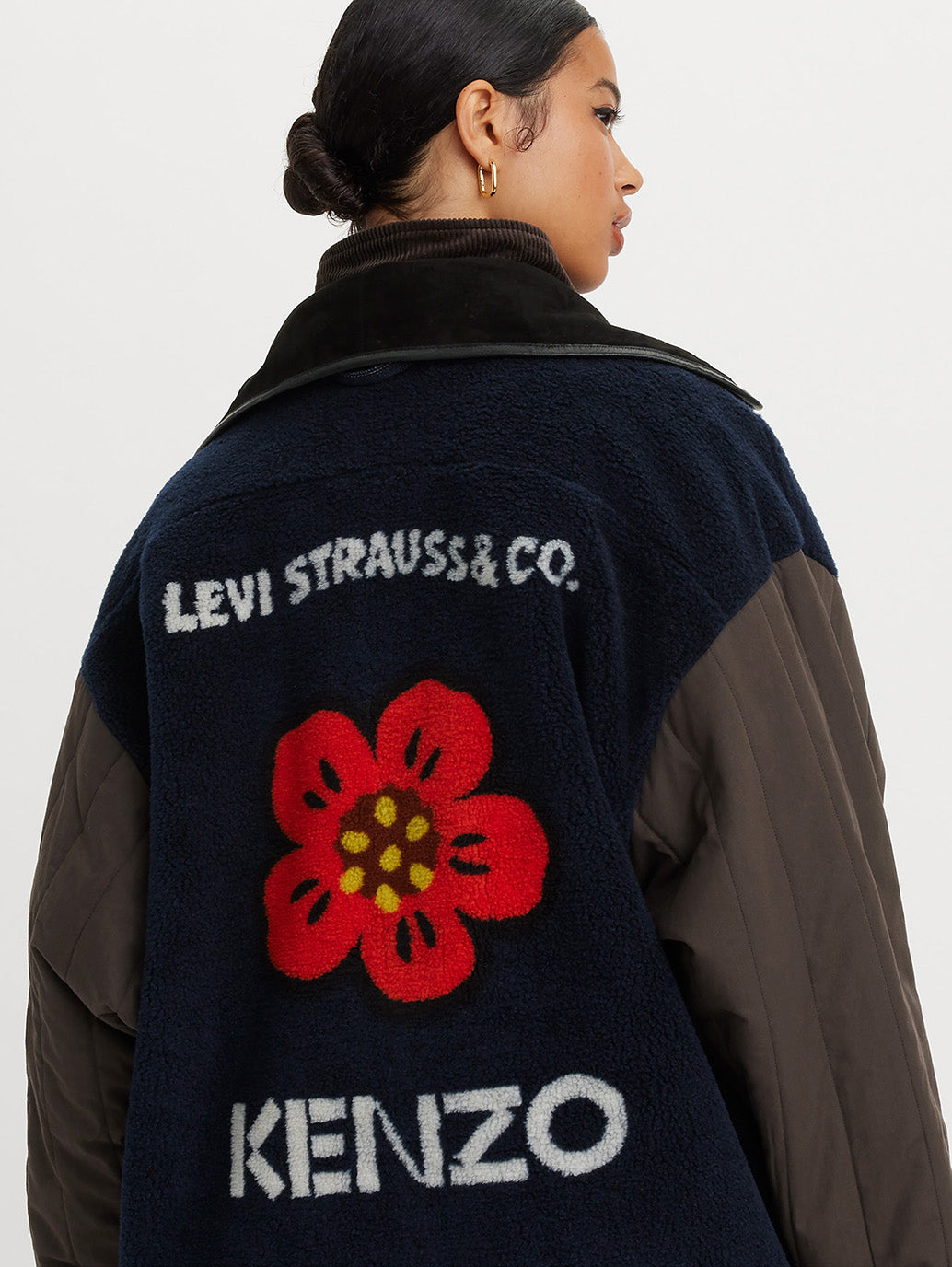 また今回のコレクションのアイテムは、クラシックなリーバイ・ストラウスのツーホース・マークとKENZOロゴが組み合わされています。メタル製のLevi’s®シャンクにはKENZOを象徴するボケの花がエンボス加工され、バックポケットにはLevi’s® のアイコンである弧状ステッチが施されています。ポケットの上には刺繍でKENZOのロゴがあしらわれ、20世紀初頭に工場で働く人々がユニフォームに付けていたチェーンステッチの「ネームバッジ」に由来しています。コレクションのガーメントは2つのモチーフ、日本の伝統的な刺し子技法を模した刺し子プリントとKENZO JEANSラインから復活したアーカイブの花柄プリントがあしらわれています。
