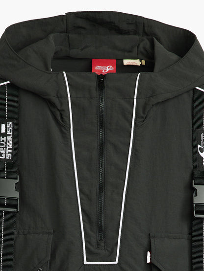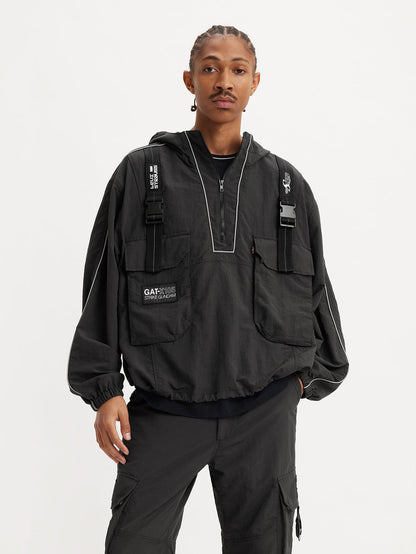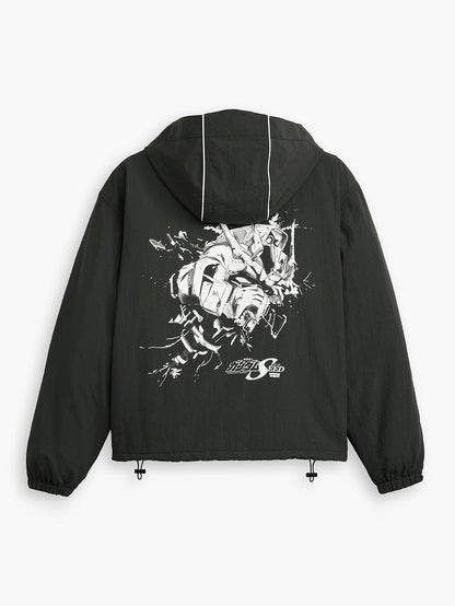 身幅がゆったりとしたボクシーフィットのブラックカラーボディのナイロンジャケット。シルバーのパイピング、オーバーサイズのユーティリティ・チェストポケット、調節可能なストラップ、背中の大きなGAT-X105ストライクガンダムのグラフィックが特徴的な当コレクションなれでは拘りのデザインです。機能性にも優れており幅広い季節に活躍する一着です。