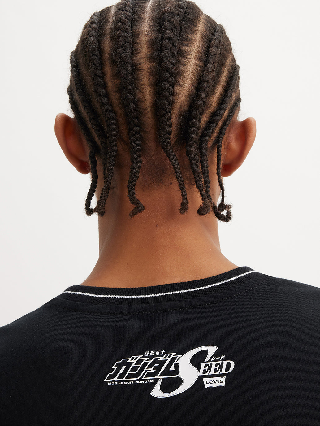 ボックスシルエットのブラックカラーボディのフロントとバックにストライクガンダムのシグネチャープリントを施し、フロント下部にはジャガード織りのタグも配されています。首元とサイドにあるLevi's®のレッドタブの赤色がアクセントになる存在感のある一枚です。