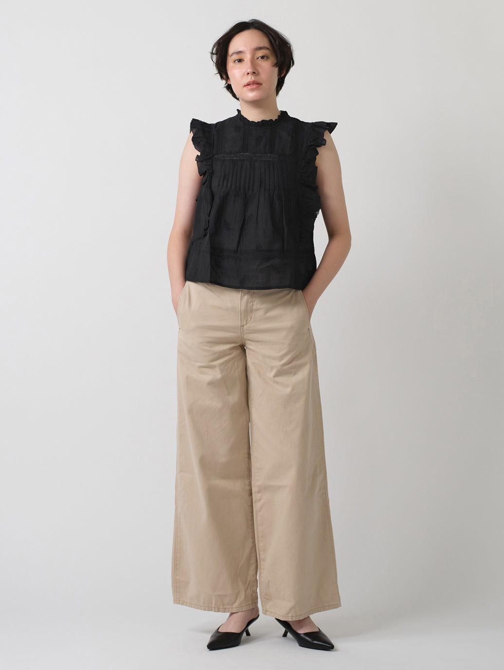 定番アイテムとして人気のチノパンツをオーバーサイズにアップデートしました。すっきりしたシルエットを引き立てるミッドライズで、太ももから下はルーズフィットのゆったりとしたストレートレッグです。シャツやブラウスと併せてクラシックなスタイルもよし、パーカーやオーバーサイズのトップスでカジュアルな着こなしも楽しめる1着です。