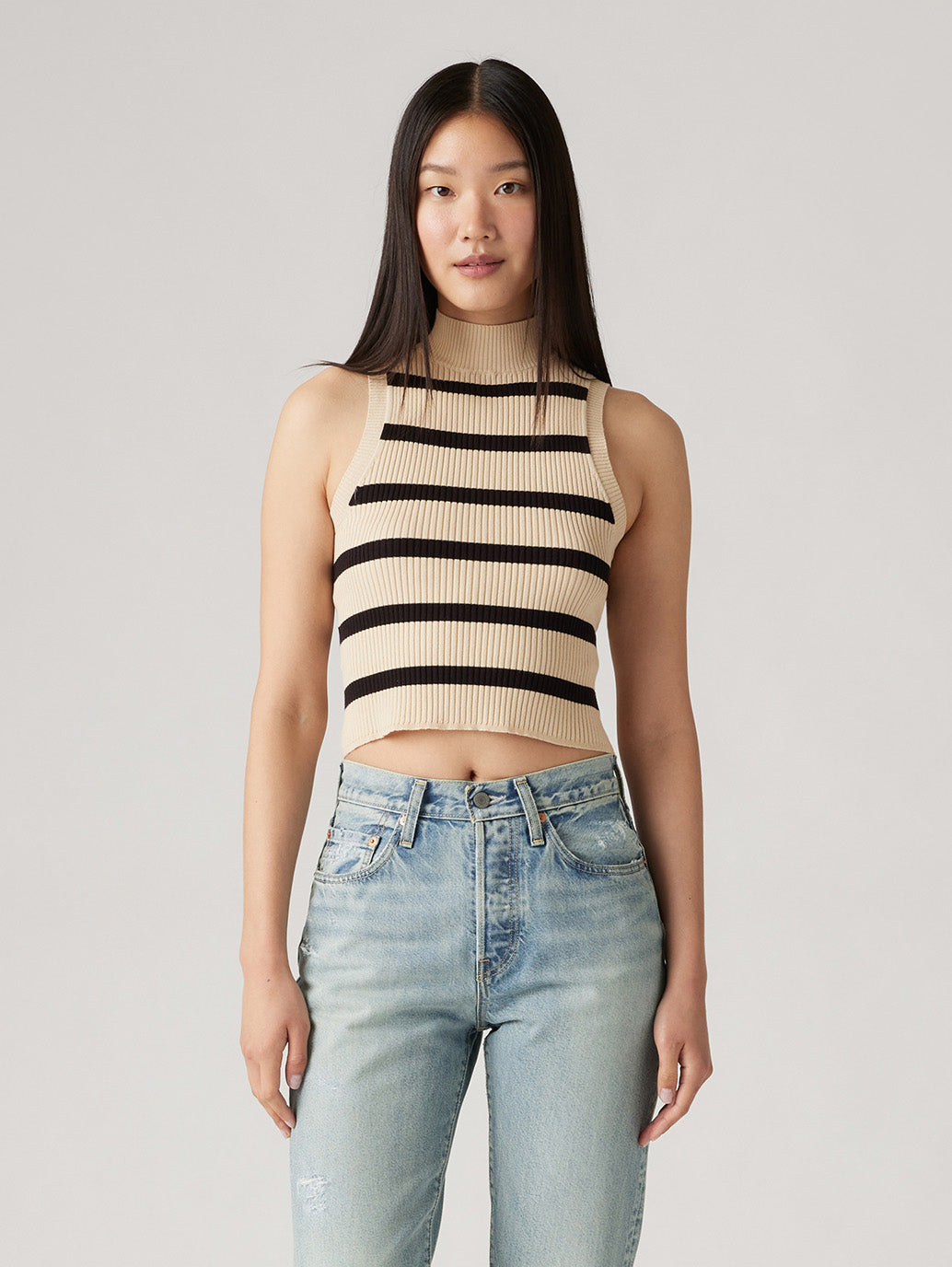 90年代のクラシックなトップスを今風にアレンジしてデザインされました。モックネック・タンクはハイネック、ノースリーブ、スリムフィットのデザインでどんなボトムスともアウターとも相性抜群の一枚です。