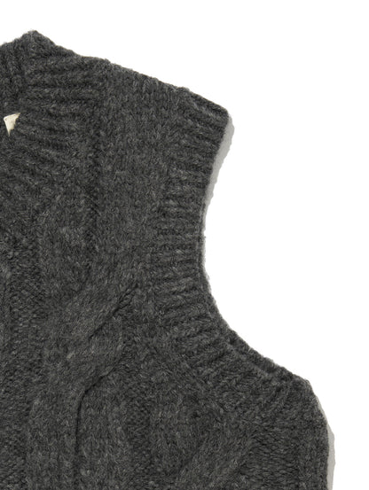 ヴィンテージ風のケーブルベストが登場しました。ブラウスやTシャツなど、どんなものの上にも重ねられるスウィートなアイテム。Vネックライン、ケーブル編みデザイン、リブ編みエッジが特徴です。