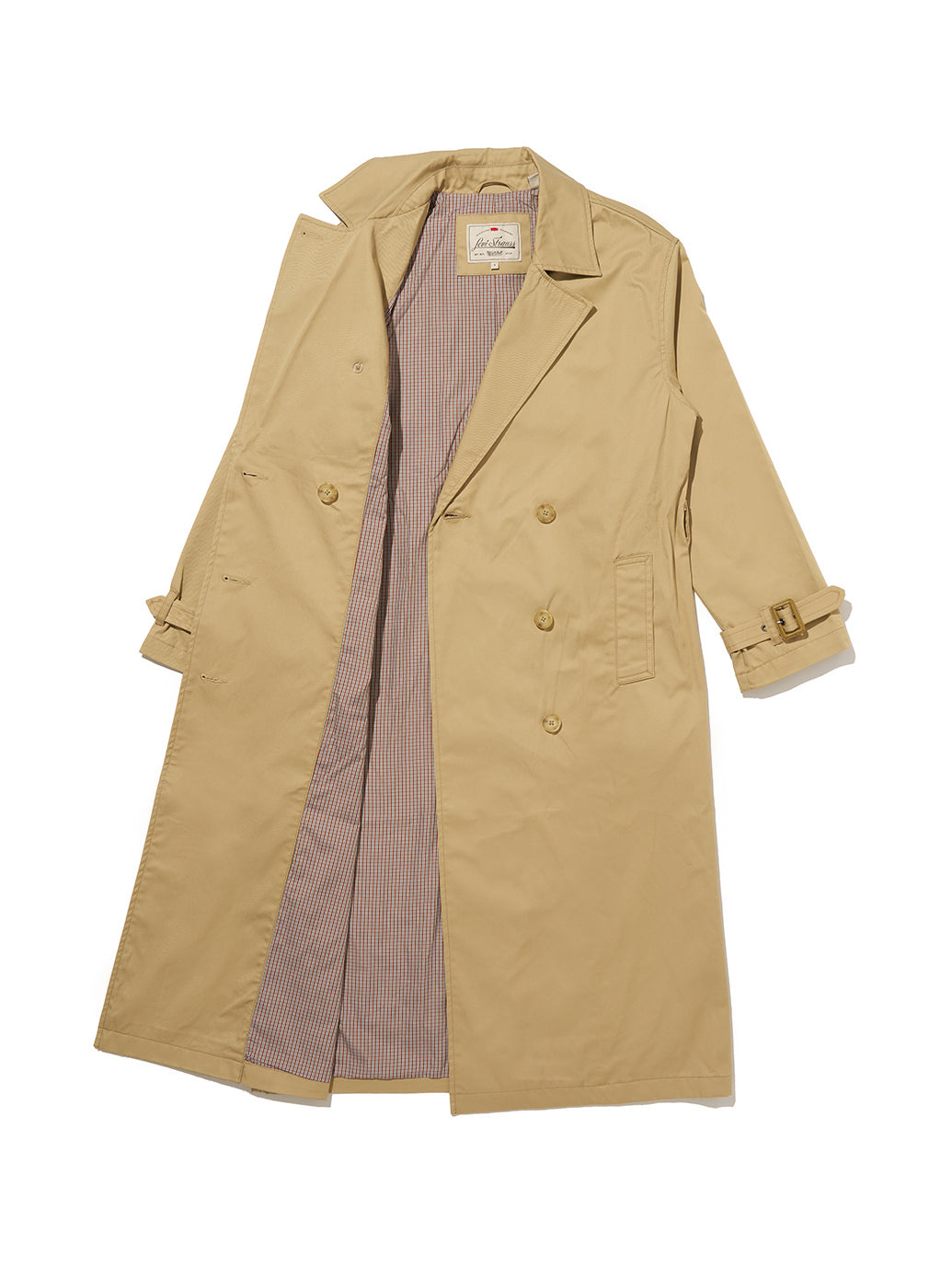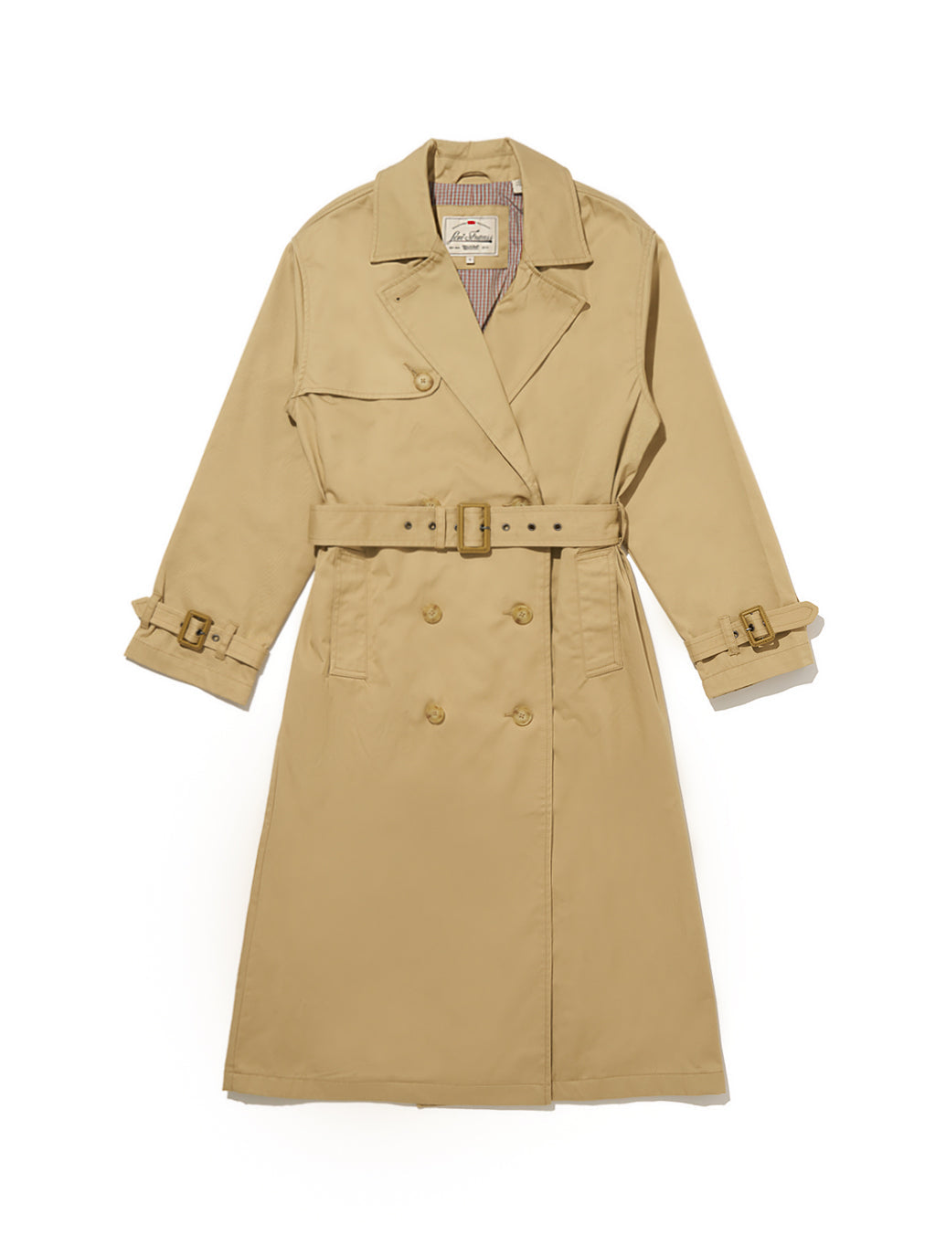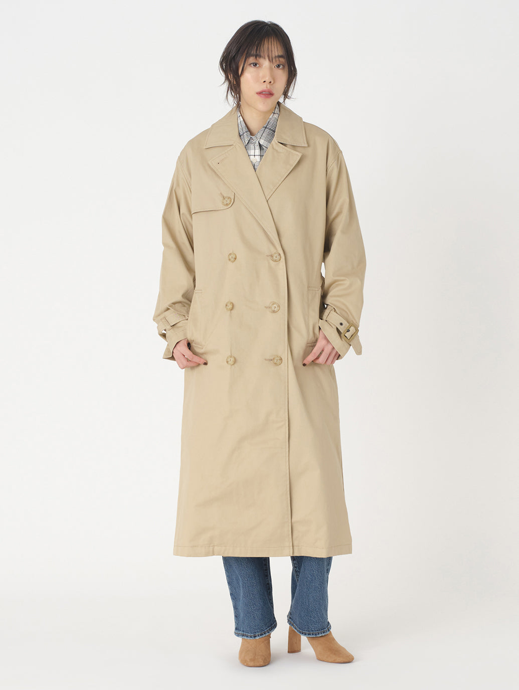 カジュアルにつかえるトレンチコートが登場しました。クラシカルなピークドラペルの襟、ロングラインのシルエット、両サイドのポケット、そしてウエストのベルトできゅっと締めてスタイルを楽しめる一枚です。