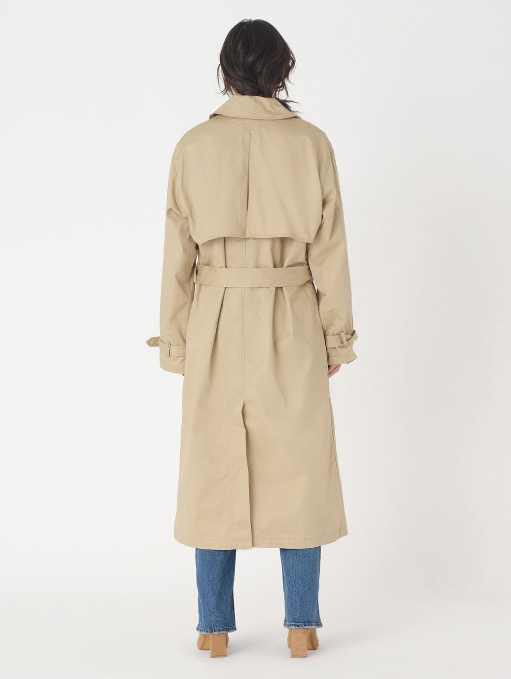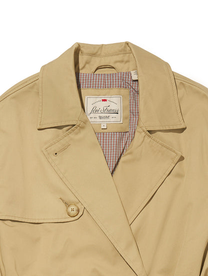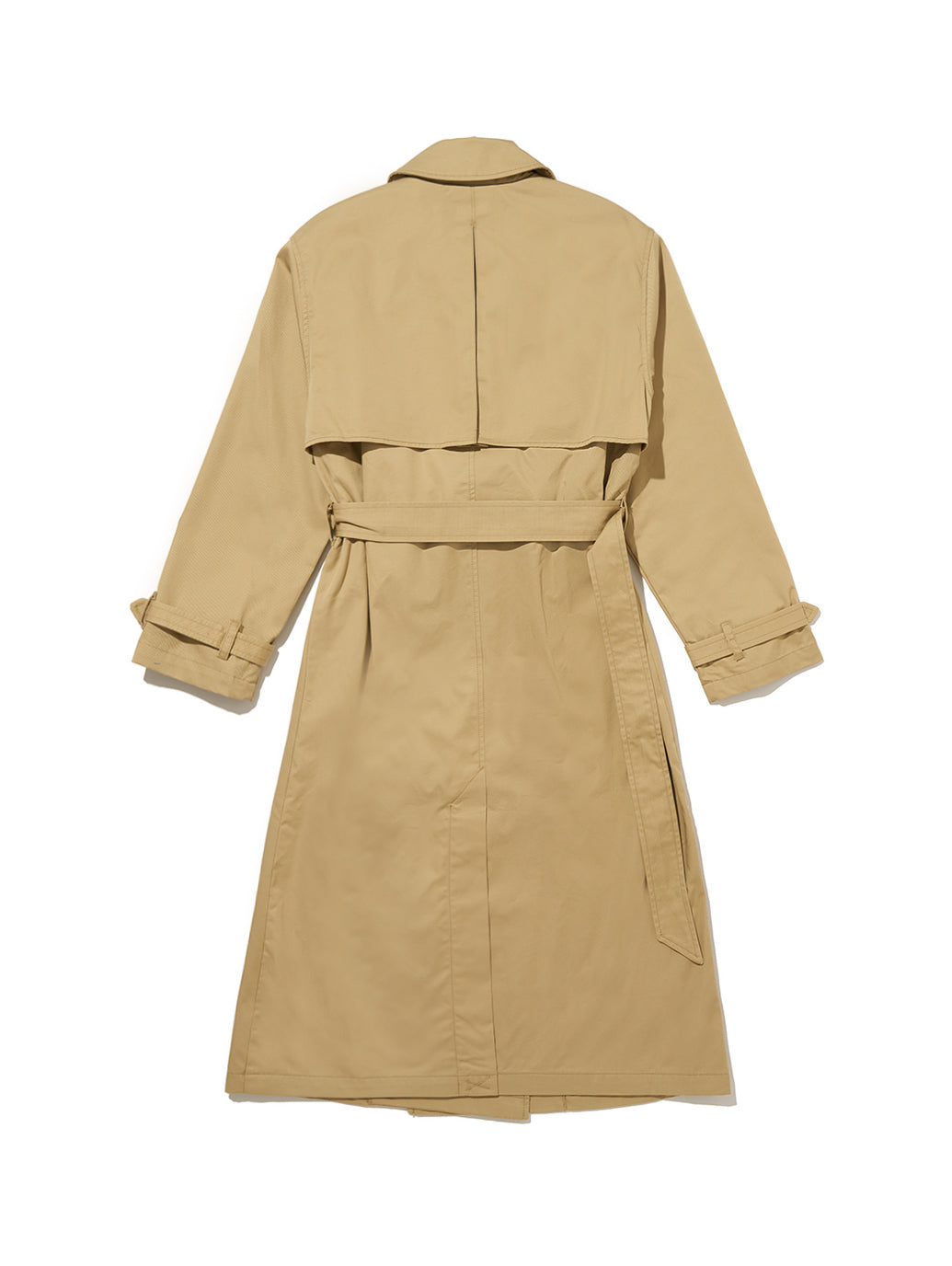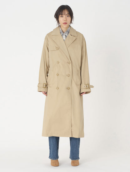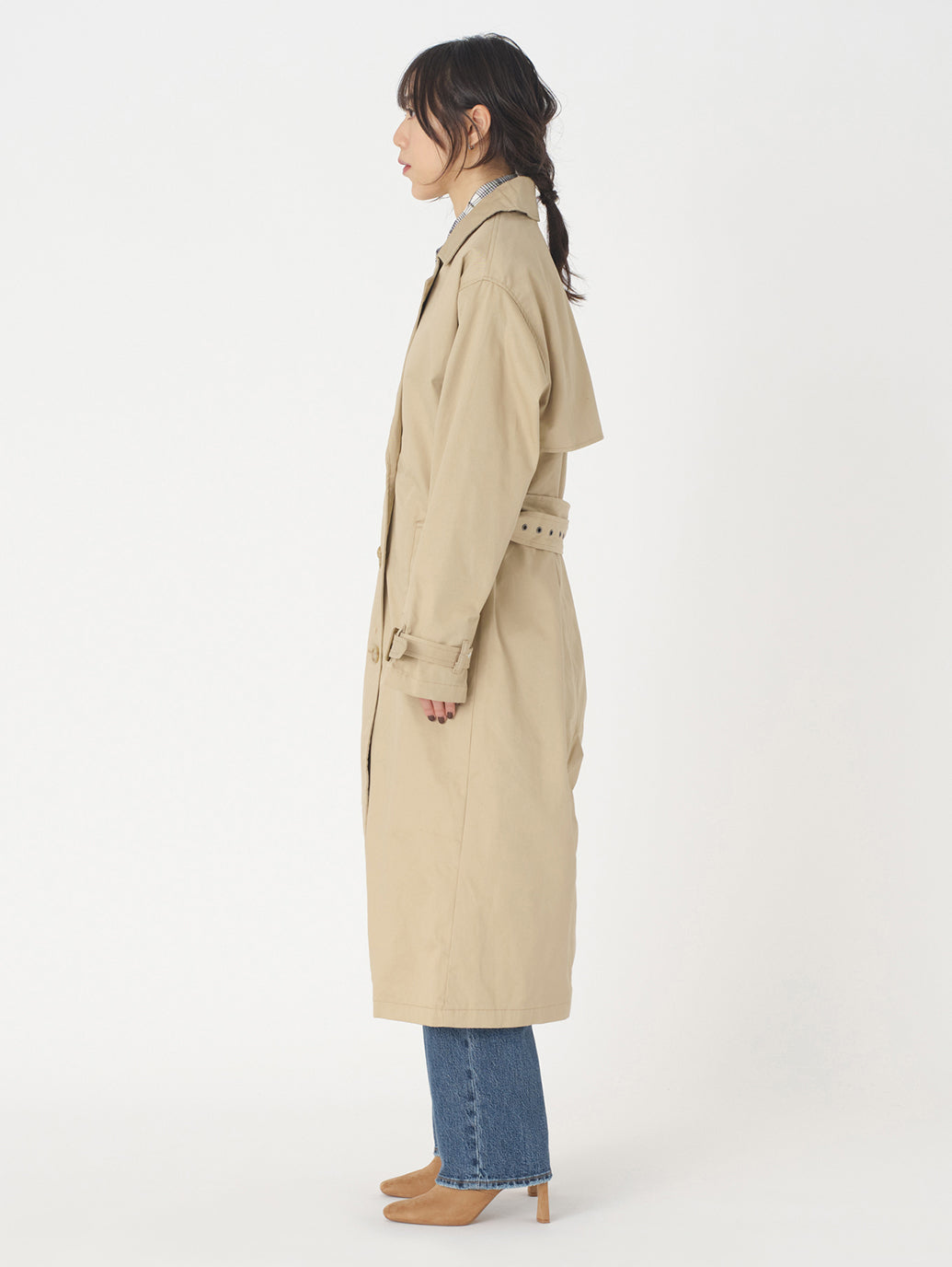 カジュアルにつかえるトレンチコートが登場しました。クラシカルなピークドラペルの襟、ロングラインのシルエット、両サイドのポケット、そしてウエストのベルトできゅっと締めてスタイルを楽しめる一枚です。