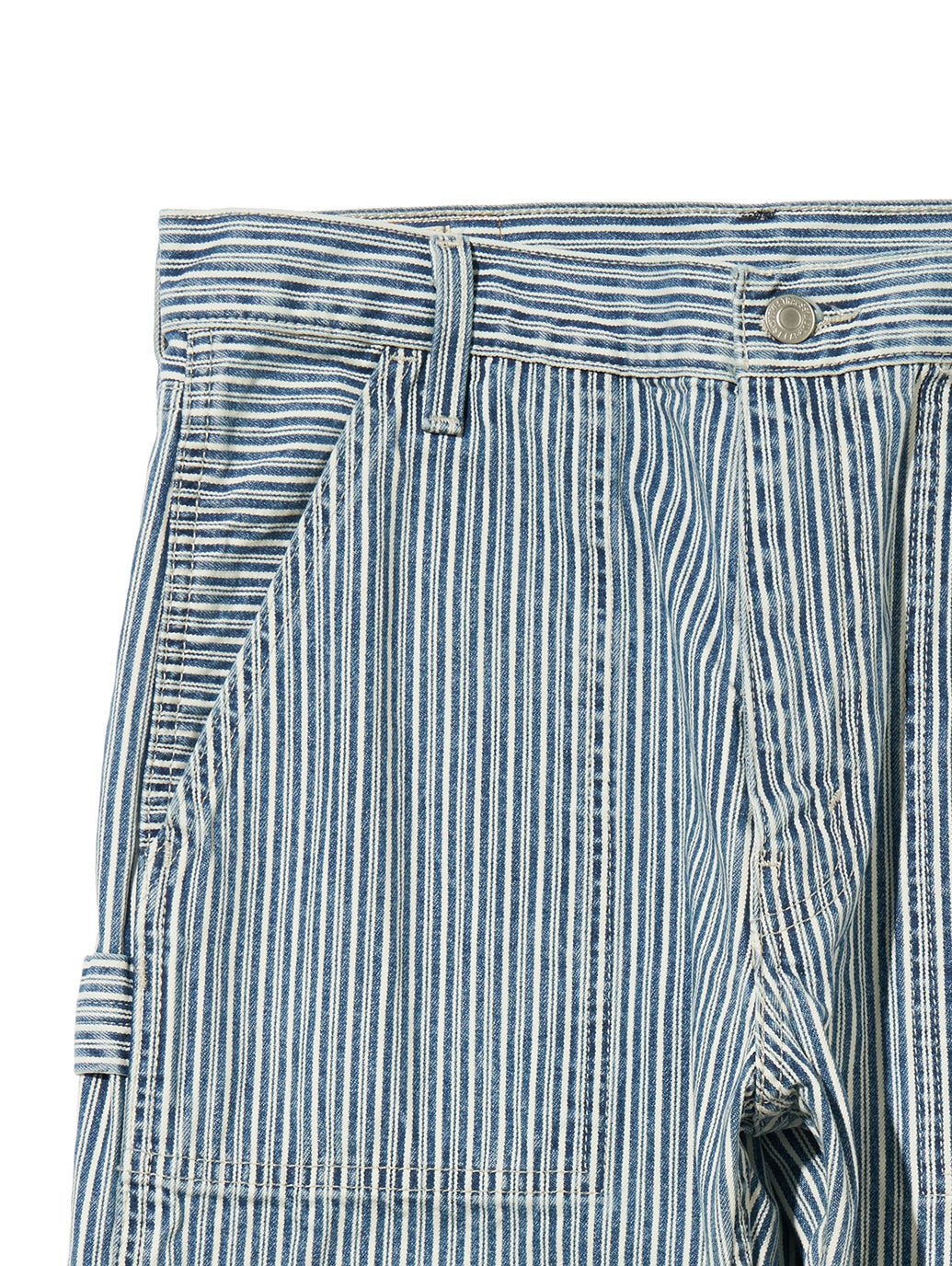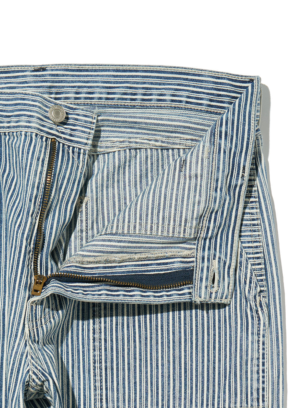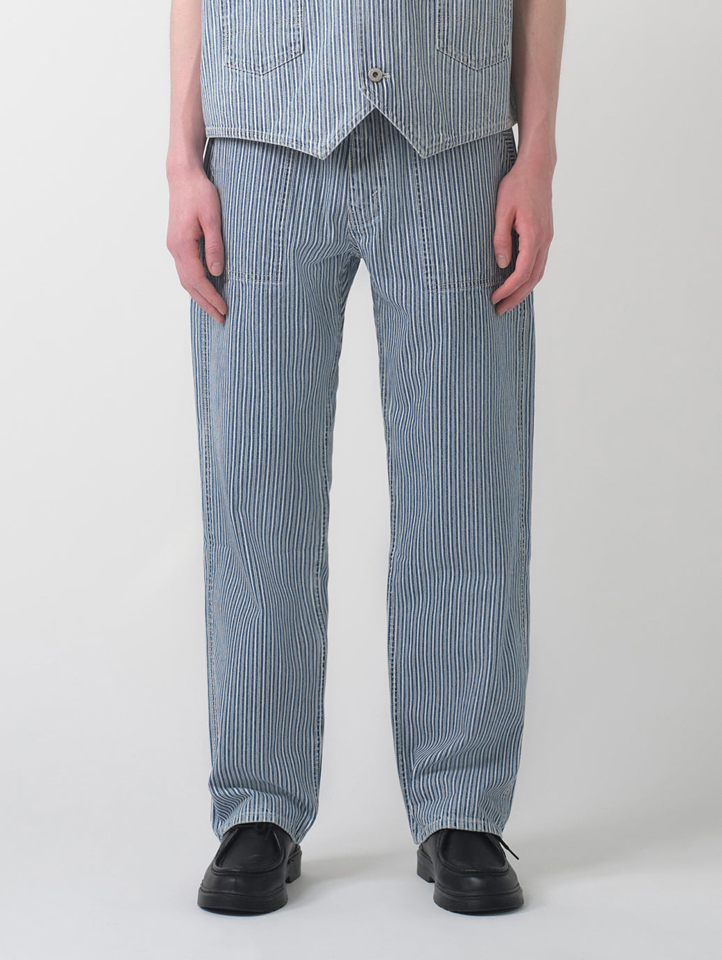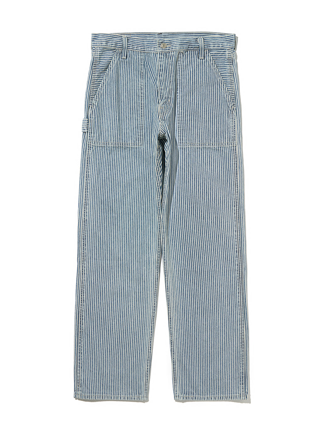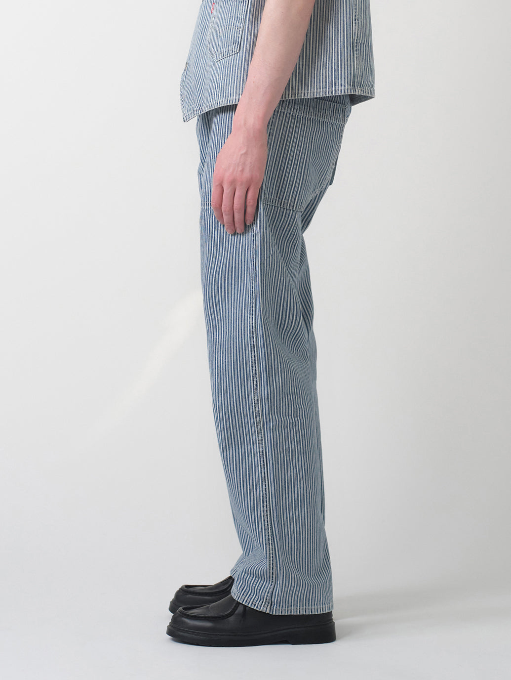 リラックス感のあるゆったりとしたストレートフィットのユーティリティパンツ。ワークテイストの雰囲気満載のヒッコリーストライプ柄、サイドにハンマーループも配し、ワーク要素も取り入れているのが特徴です。ポケットのアーキュエイトステッチも取り除きシンプルなデザインになっています。普段穿くのは勿論、作業着としても活躍する一本です。